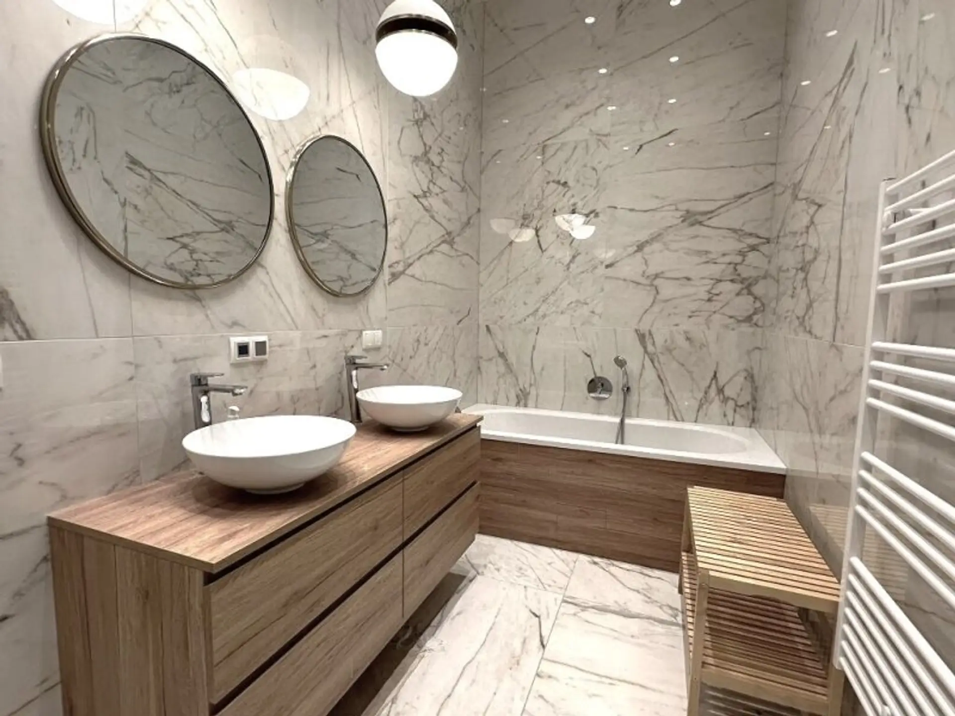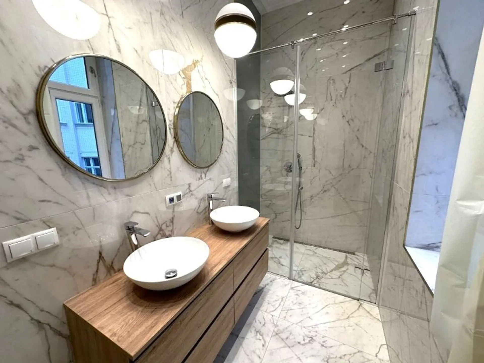 + 1 BADEZIMMER MIT BADEWANNE, DUSCHE, 2 WASCHTISCHE, WC UND SPROSSENHEIZKÖRPER
