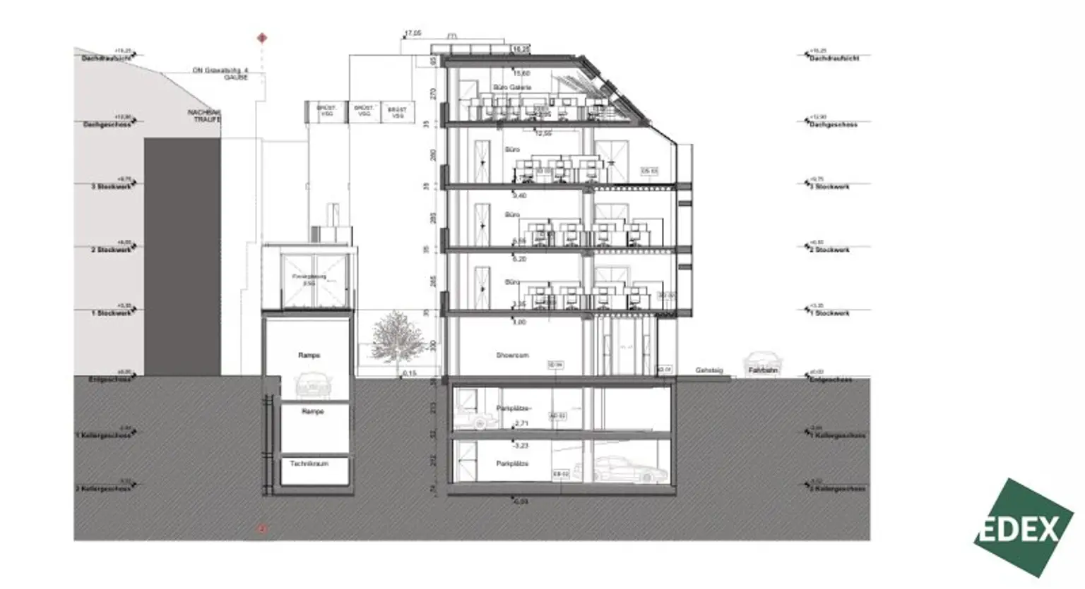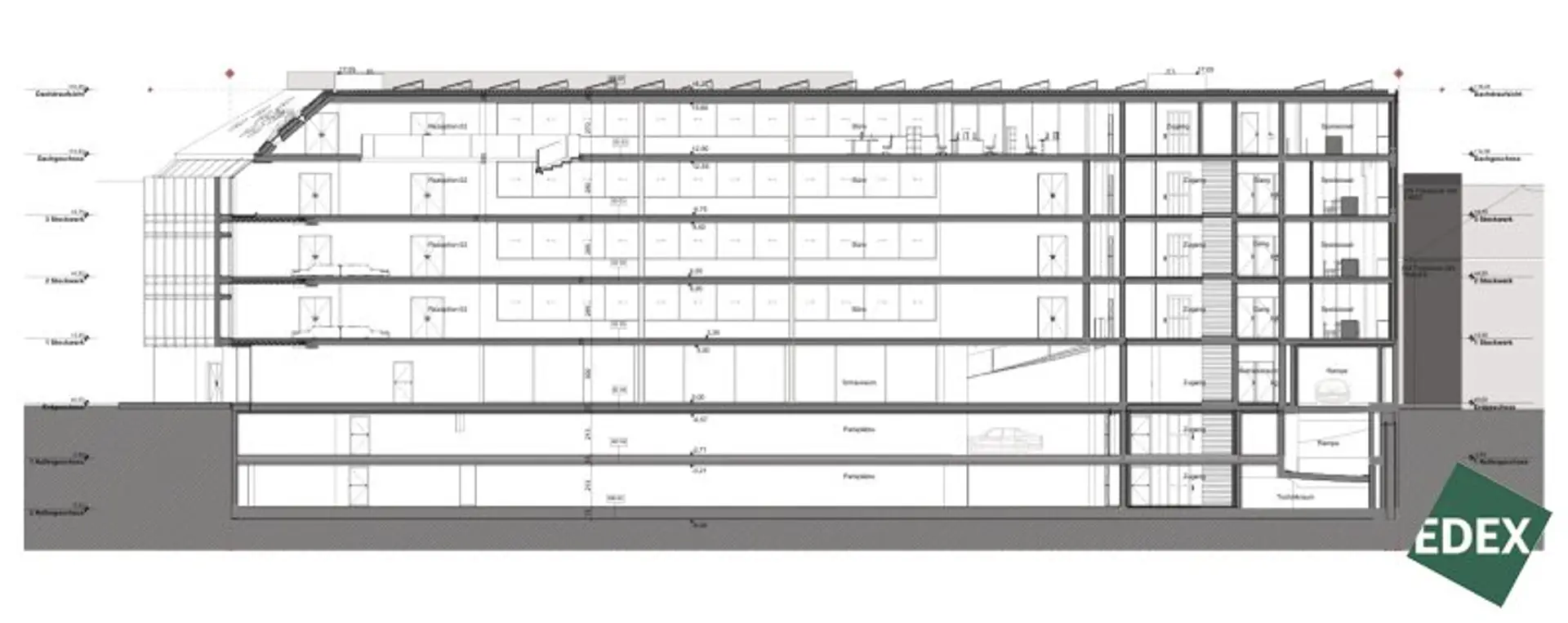 Diese multifunktionale Liegenschaft befindet sich auf einem Grundstück welches zurzeit lediglich als Parkplatz genutzt wird. Aufgrund der geltenden Bebauungsbestimmungen kann diese Betriebsliegenschaft sehr vielseitig genutzt werden. Laut einer vorhandenen Bebauungsstudie (das Projekt ist bereits baugenehmigt aber noch nicht rechtskräftig), kann jedenfalls von einer erzielbaren Nutzfläche, aufgeteilt auf vier Geschosse von insgesamt ca. 3.842,53 m² ausgegangen werden.