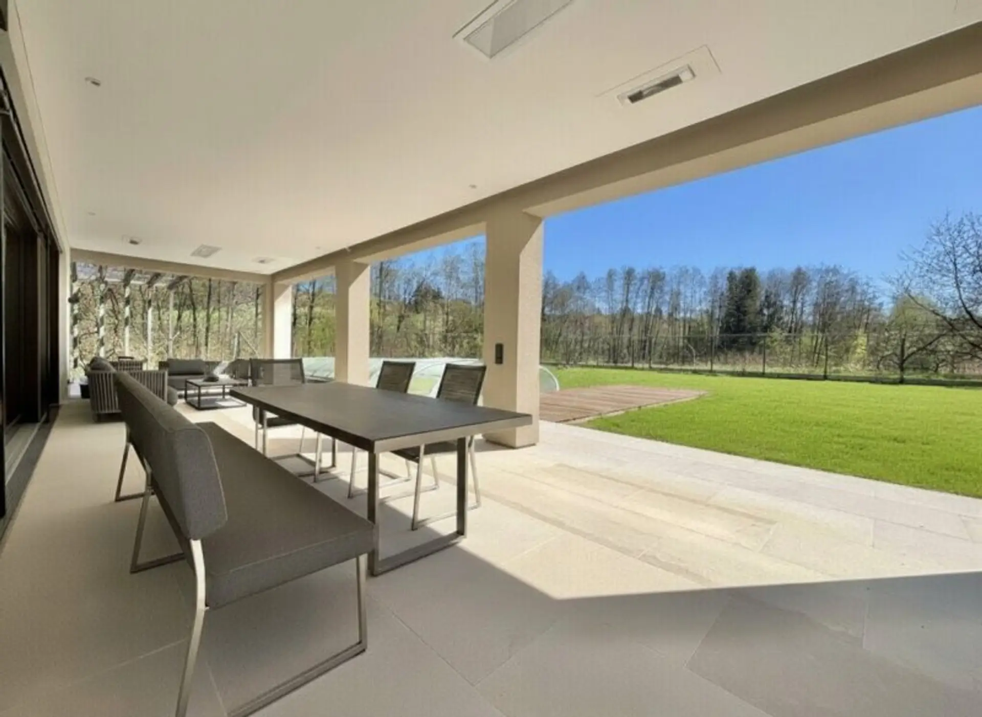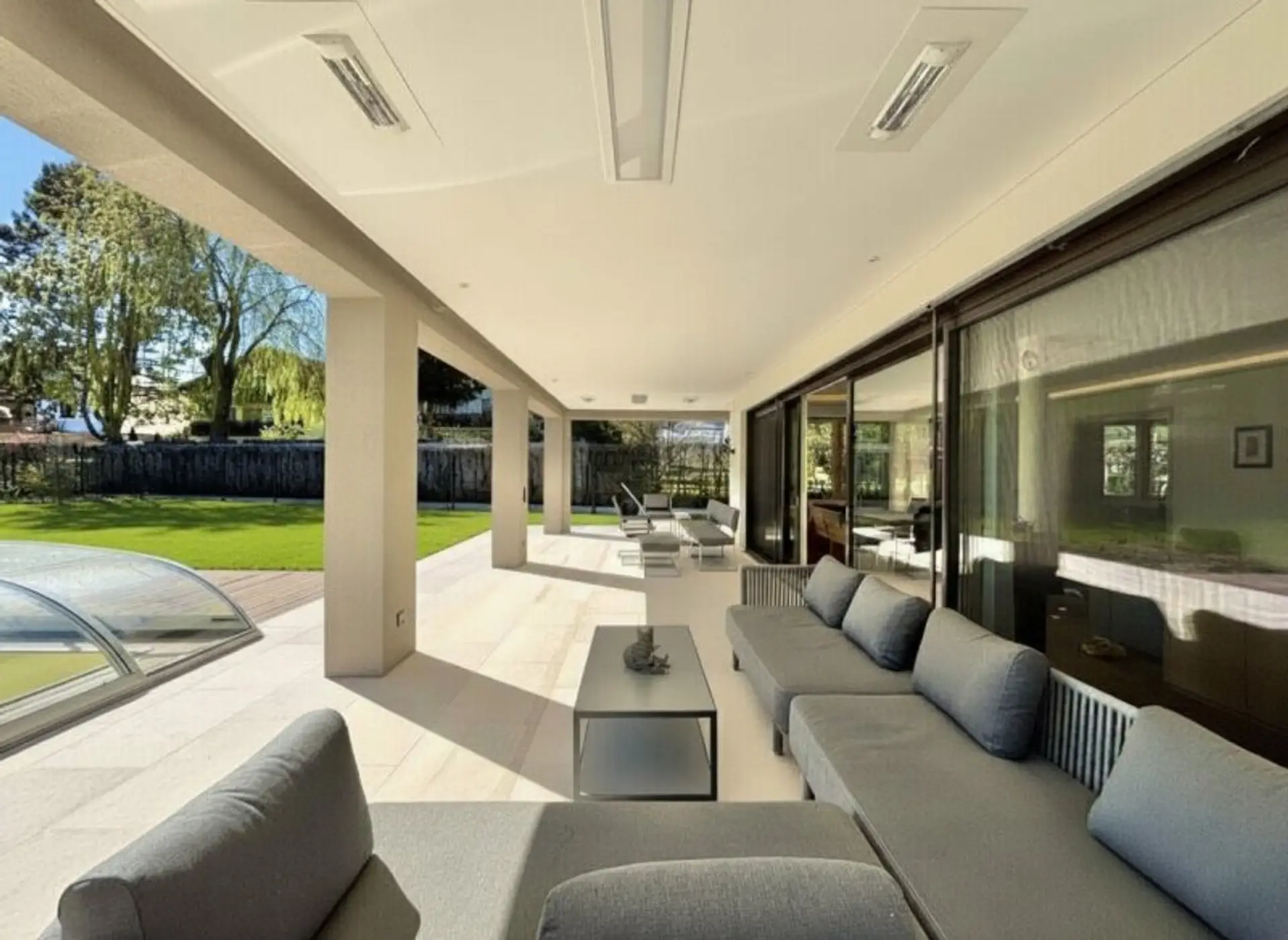 Der Außenbereich verwandelt sich in eine private Wohlfühloase: Ein großzügiger Pool (ca. 10 x 4 m) mit Wärmepumpe, Außendusche, stilvolle Loungebereiche laden zum Entspannen ein. In den Decken integrierte Heizstrahler ermöglichen auch an kühleren Tagen angenehme Stunden im Freien. Der Garten mit Altbaumbestand (Obstbäumen wie Walnuss-, Himbeer- und Kornelkirschenpflanzen etc. ) schafft eine natürliche Atmosphäre und bietet Raum für Erholung und Genuss.