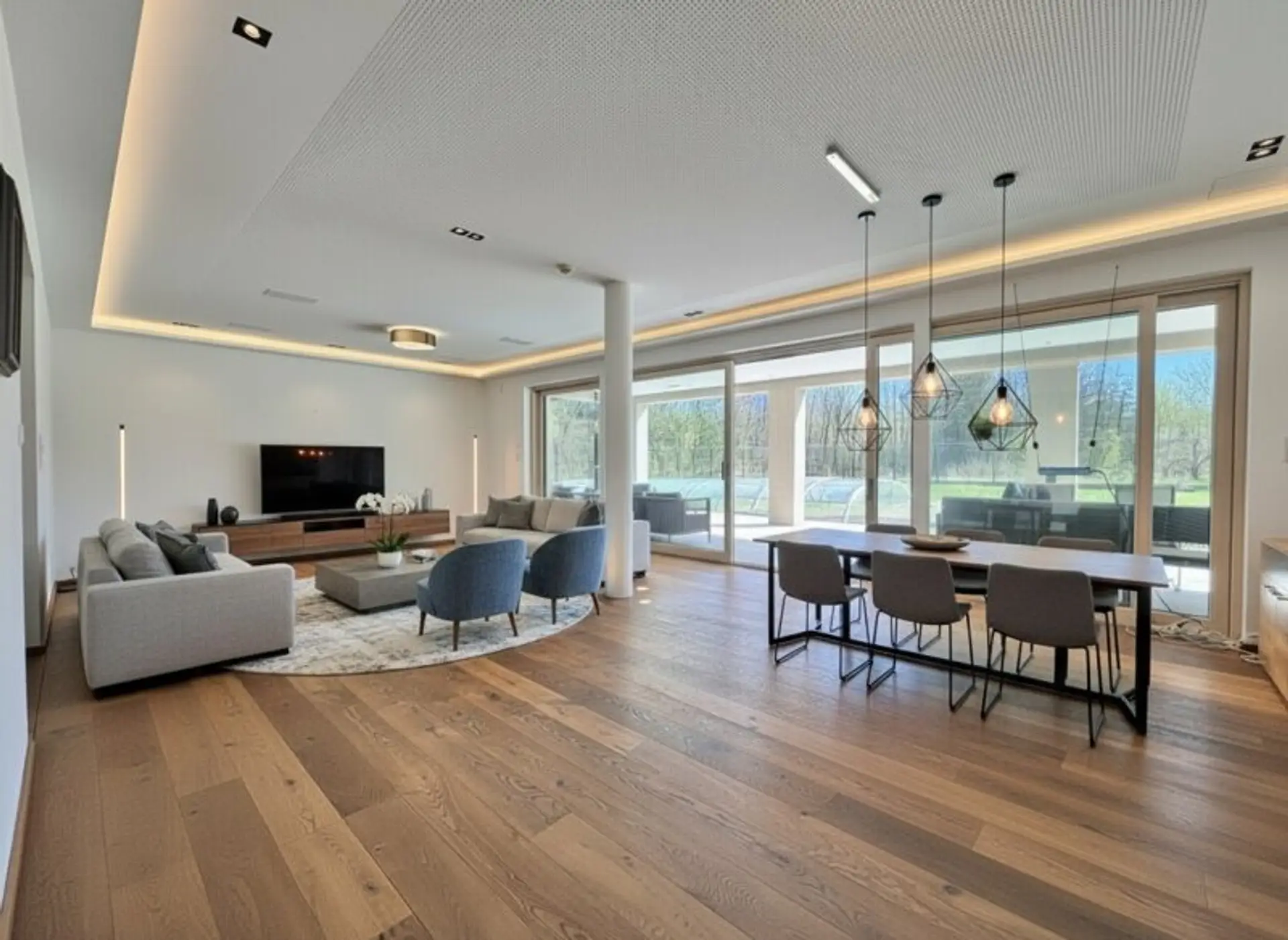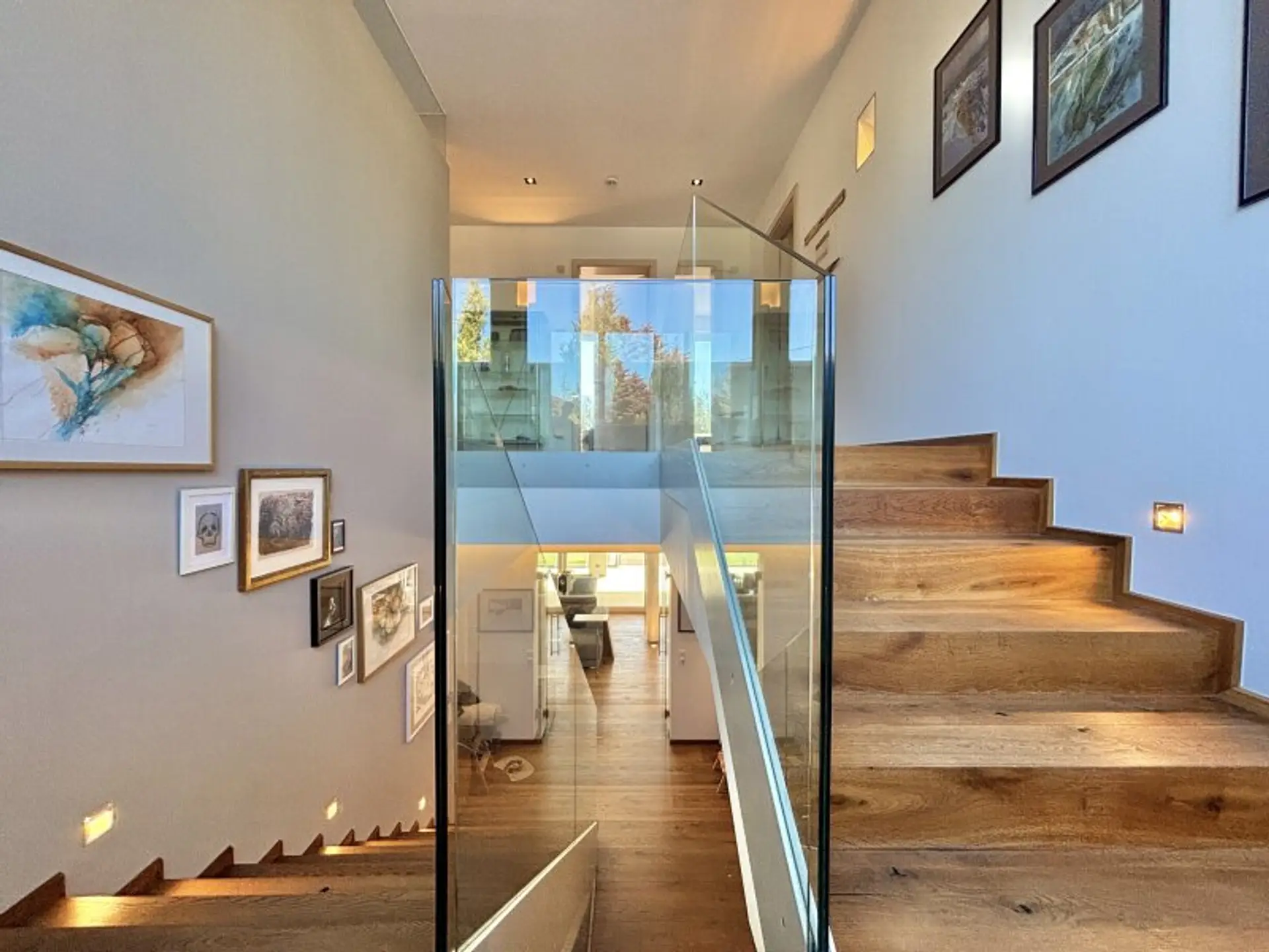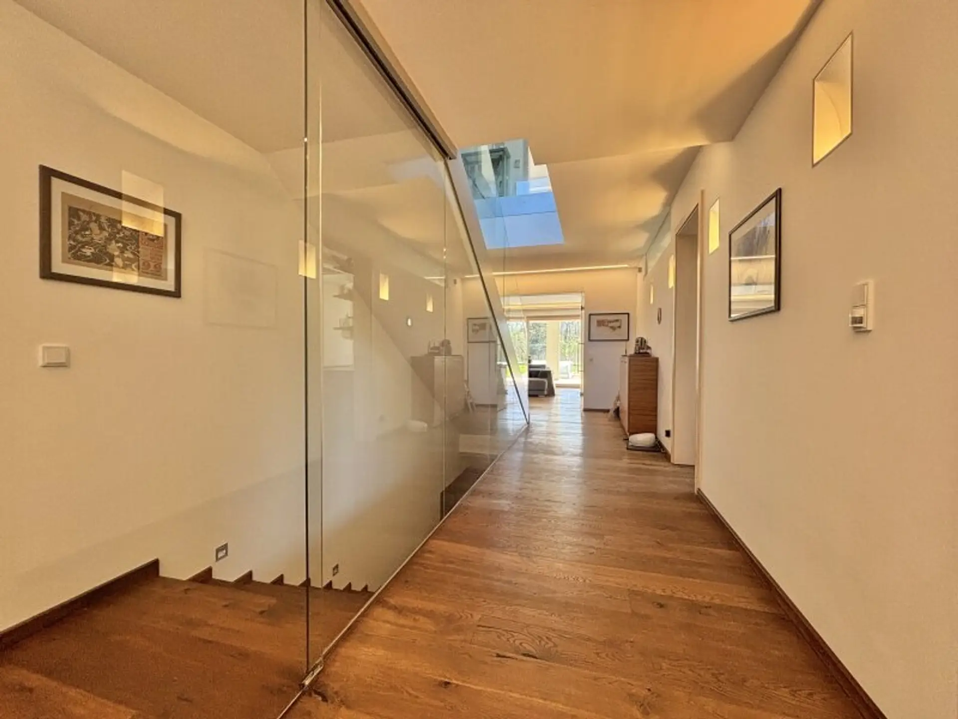 Hauptgeschoss (ca. 133 m²) – Wohnen, Leben & Genießen auf höchstem Niveau: Die Wohnebene empfängt Sie mit einem großzügigen hohen Eingangsbereich, der durch elegante Glaselemente und hochwertige Materialien sofort ein Gefühl von Exklusivität vermittelt. Edler Eichenboden (Country Vulcano der Fa. Mafi), hohe Räume, verdeckte Türenbelege sowie außenliegende Beschattung unterstreichen den modernen Wohnkomfort.