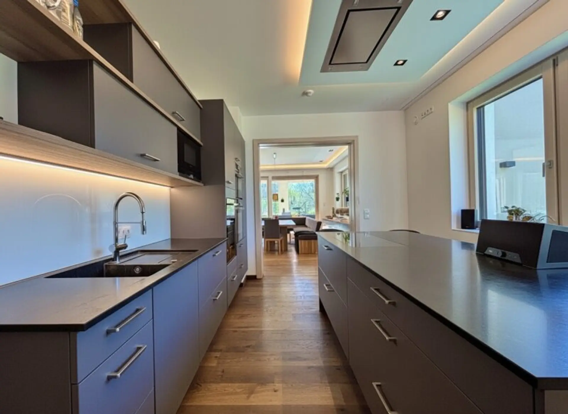 Herzstück dieser Ebene ist der weitläufige Wohn- und Essbereich mit offenem Raumkonzept, der durch seine Helligkeit und Großzügigkeit beeindruckt. Die hochwertige Küche mit angrenzender Speis erfüllt höchste Ansprüche an Design und Funktionalität. Ein zusätzliches Zimmer bietet sich ideal auch als Homeoffice an.