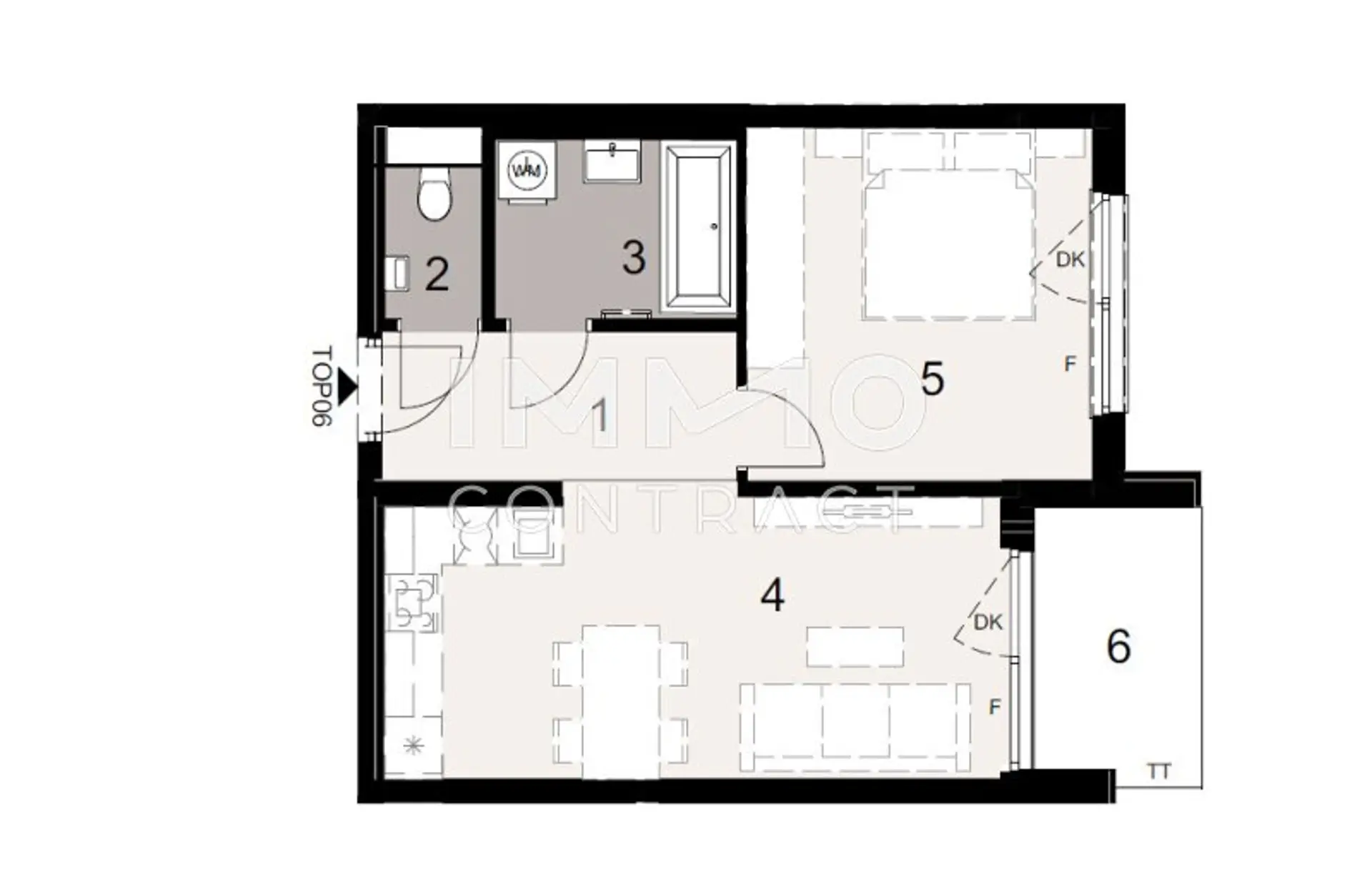 Der offene Wohn-Essbereich mit moderner Küche lädt zum Verweilen ein und öffnet sich auf die gemütliche Loggia – perfekt für den ersten Kaffee am Morgen oder einen ruhigen Abend im Freien. Das Schlafzimmer bietet ausreichend Platz und sorgt mit seinem klaren Schnitt für ein harmonisches Wohngefühl.
