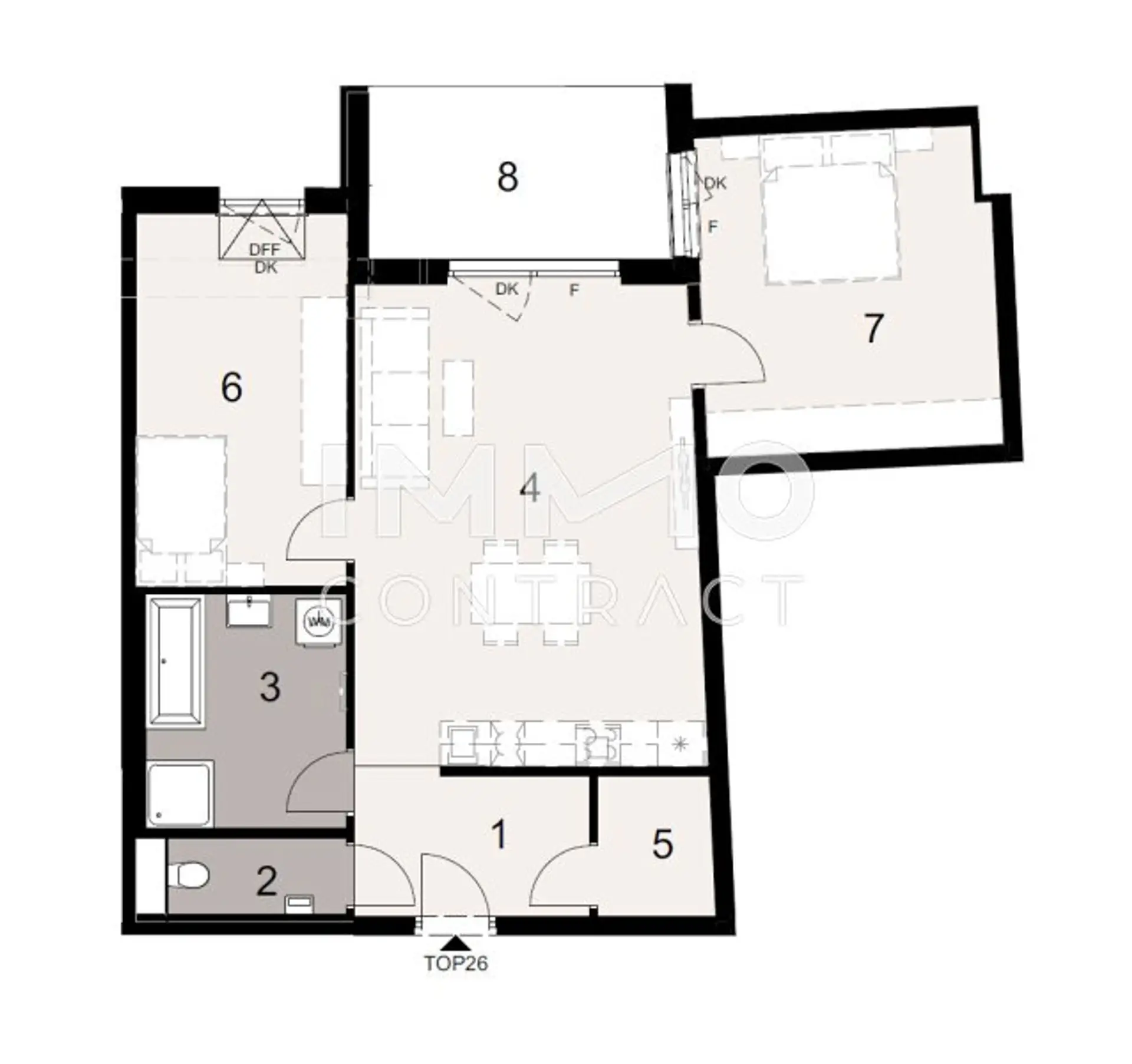 Im letzten Liftstock erwartet Sie eine Wohnung, die Raum für Ihre Zukunft bietet. Das großzügige Wohnzimmer mit offenem Übergang auf die westseitige Terrasse wird schnell zum Lieblingsort – hier genießen Sie die Sonne bis in den Abend und schaffen Erinnerungen mit Familie und Freunden.