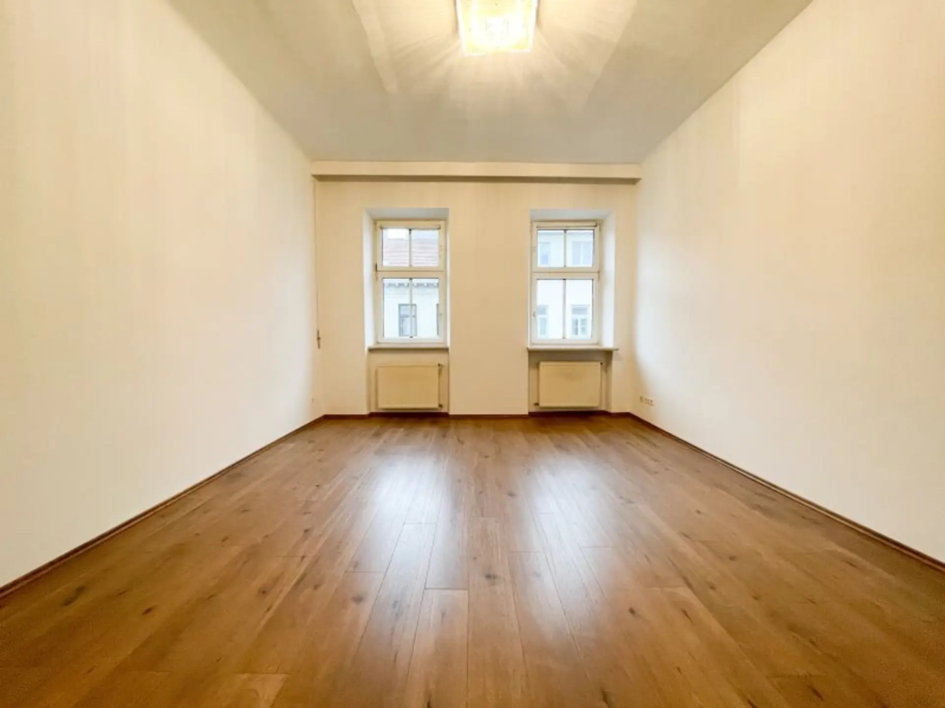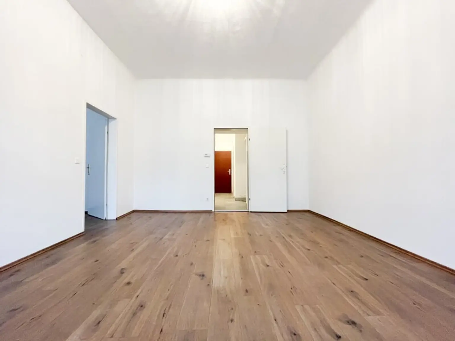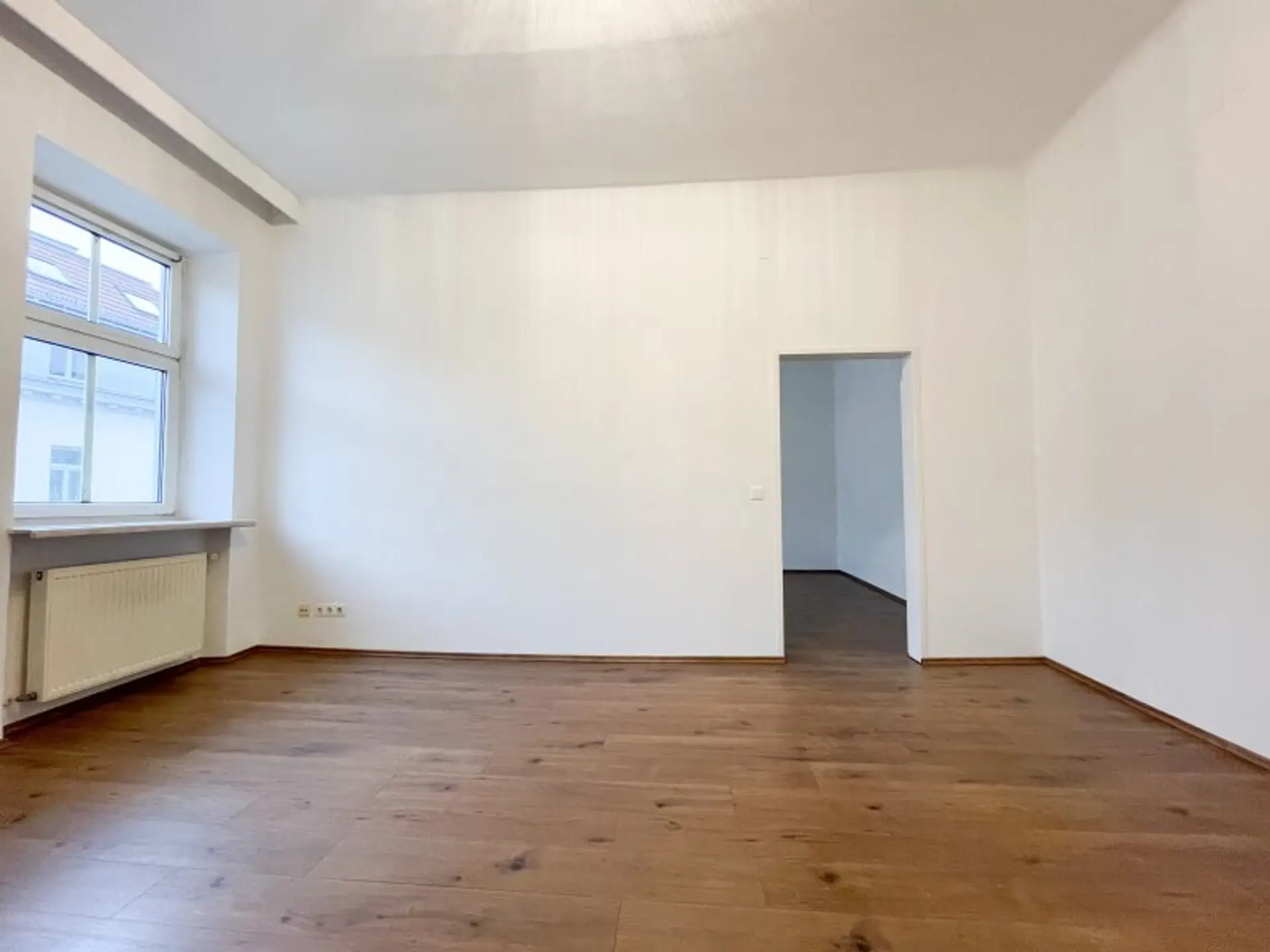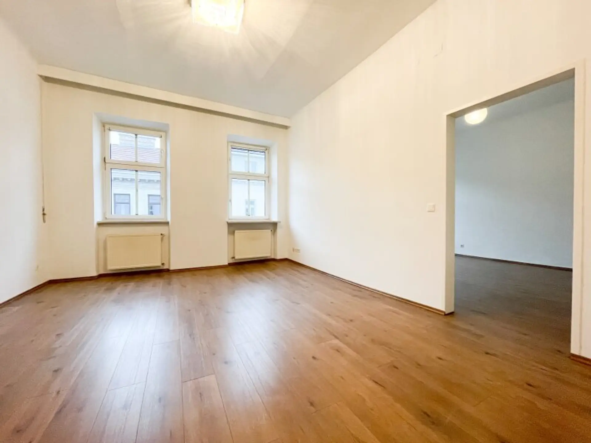 Zwei großzügige, nahezu quadratische Zimmer mit beeindruckenden, typischen Altbaudecken schaffen ein luftiges Wohngefühl und bieten vielseitige Nutzungsmöglichkeiten – ob als Wohn-, Schlaf- oder Arbeitszimmer. Die Ausrichtung Richtung Webergasse sorgt für eine freundliche Atmosphäre.