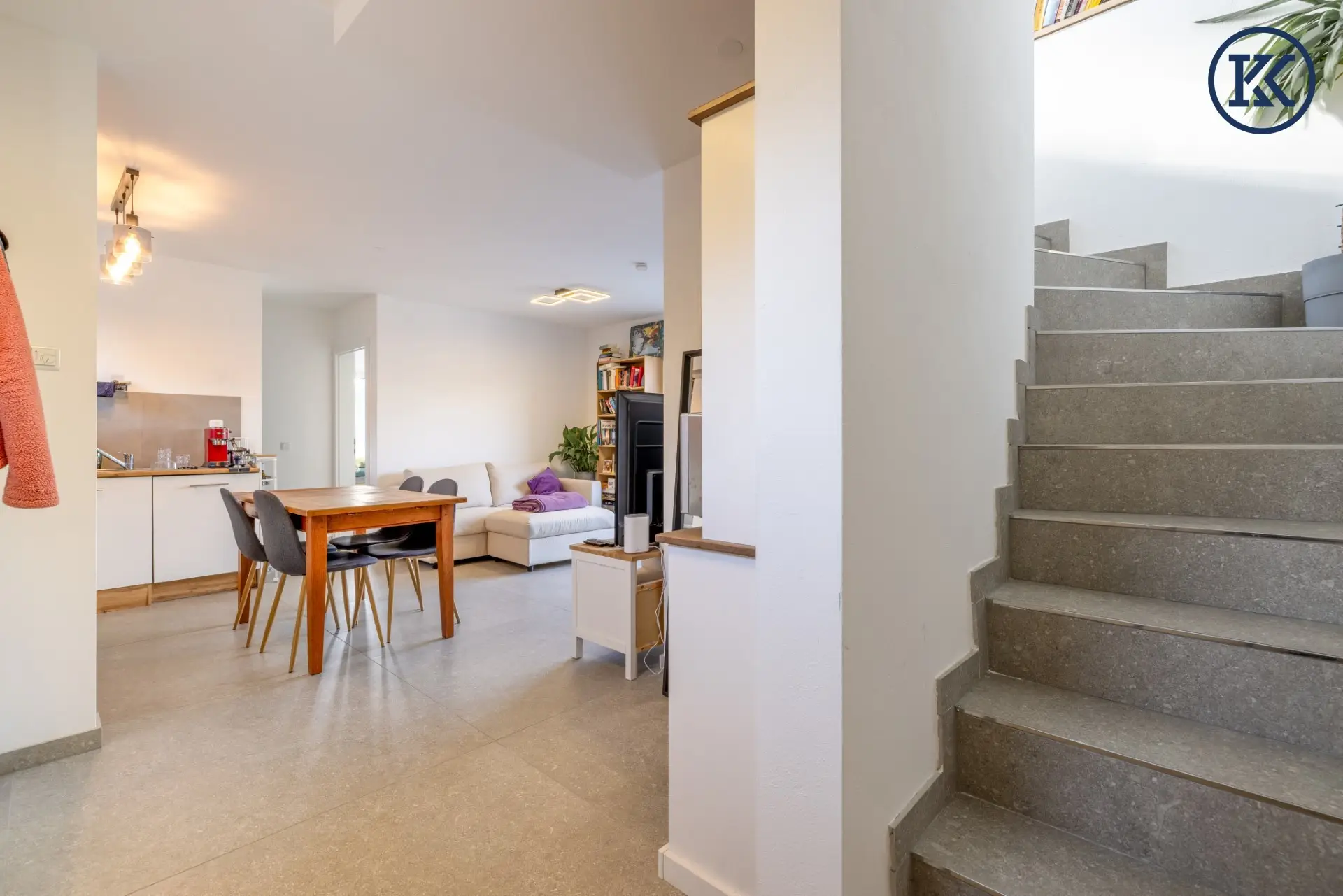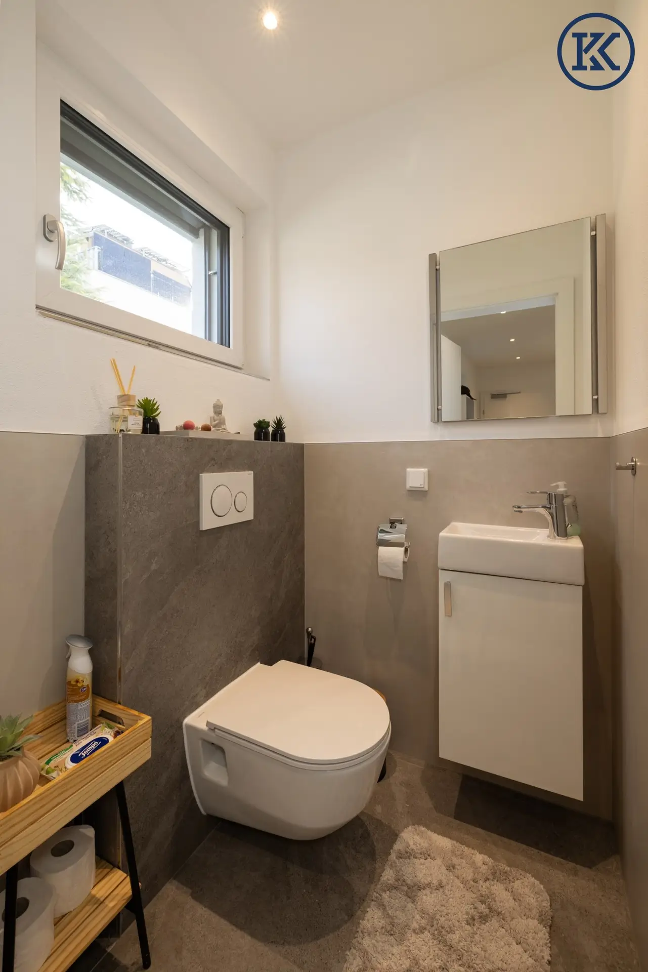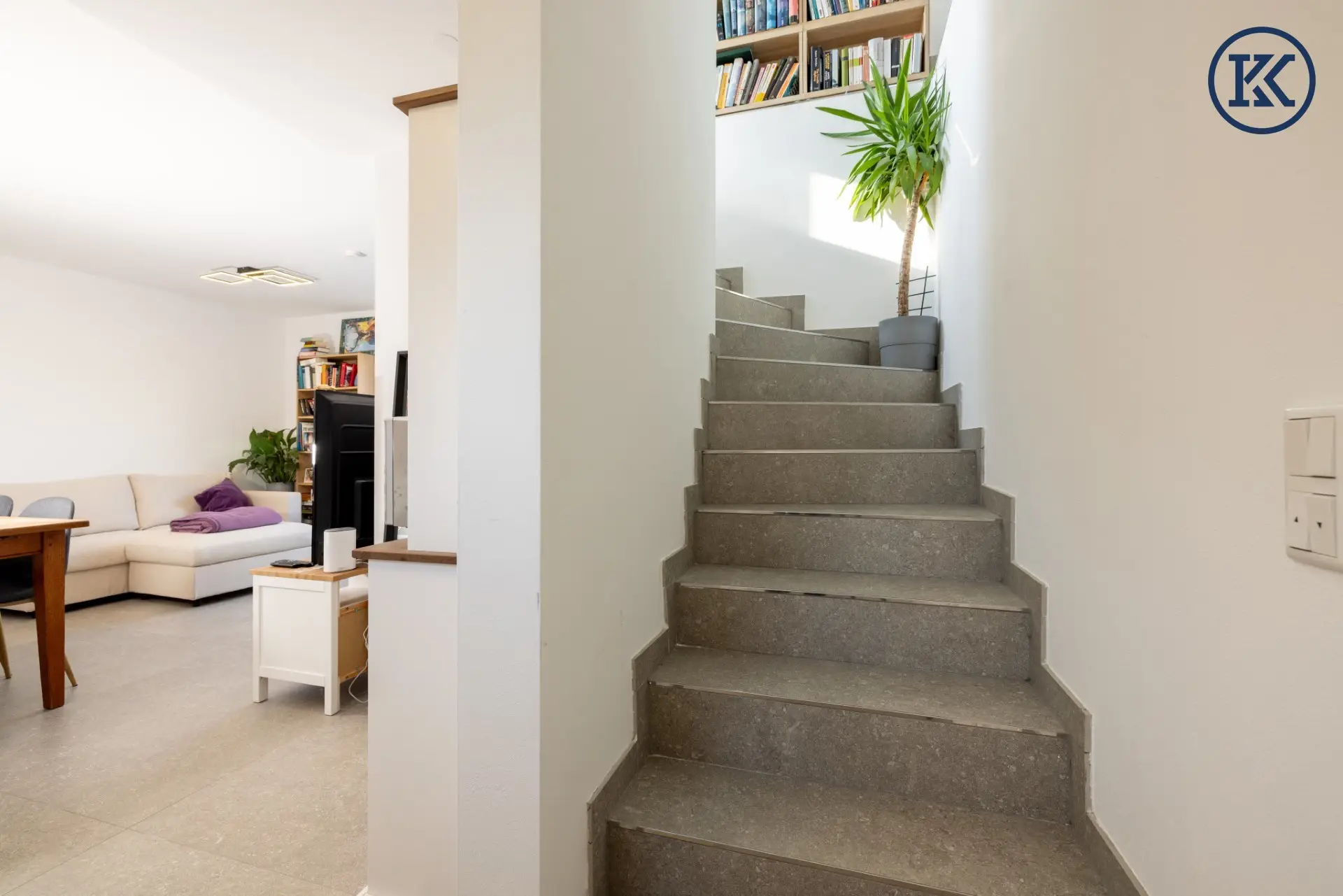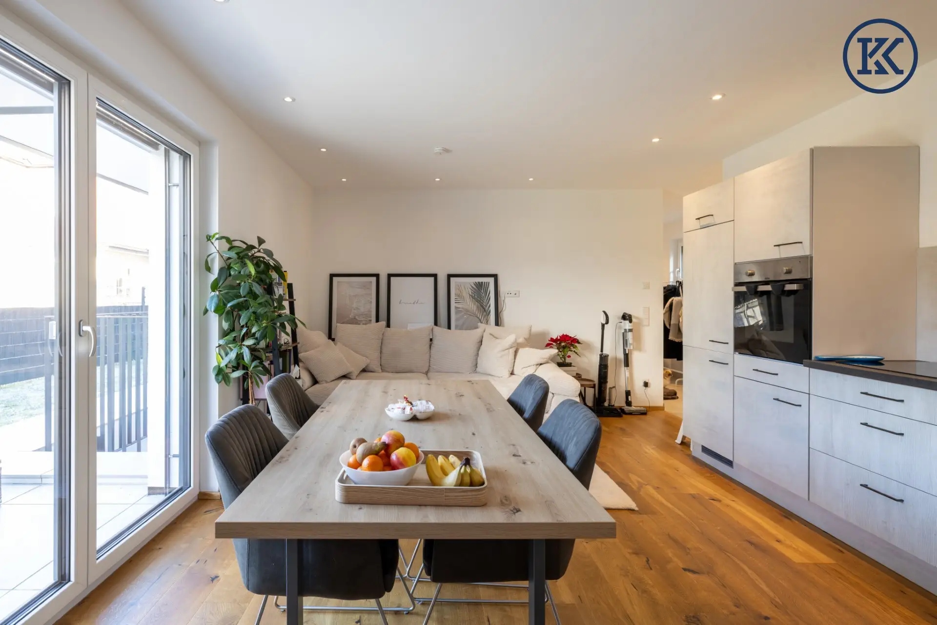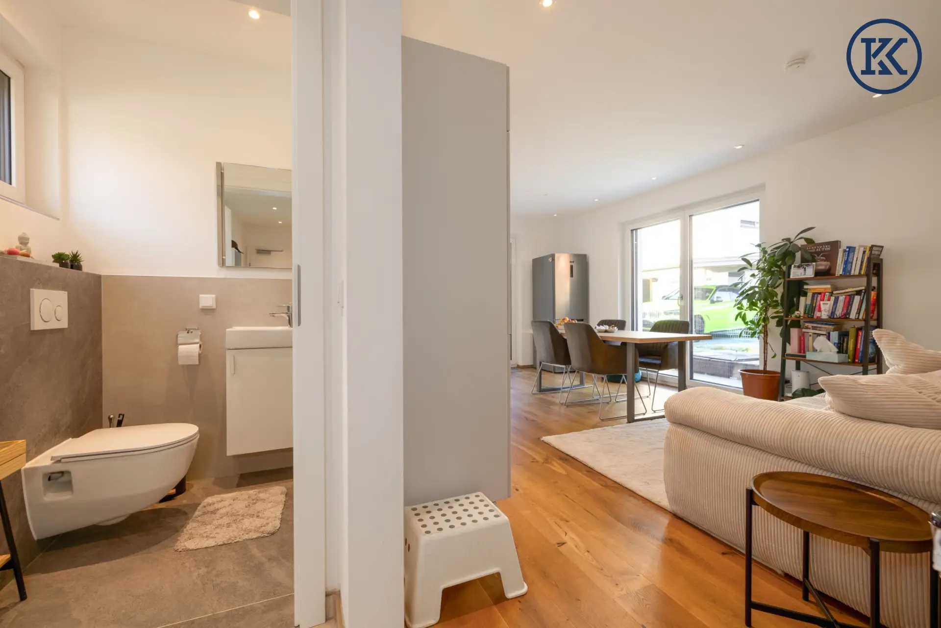 Moderne Ausstattung: Hochwertige Parkettböden in den Wohnbereichen und Fliesen in den Nassräumen
