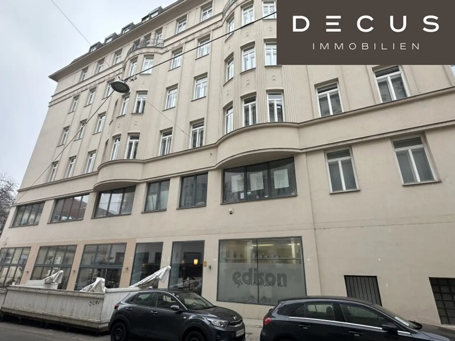 Im Erdgeschoß des Hauses befindet sich das beliebte Café und Restaurant EDISON, das mit seiner modernen Atmosphäre und großen Terrasse für zusätzliche Belebung und urbanes Flair sorgt.