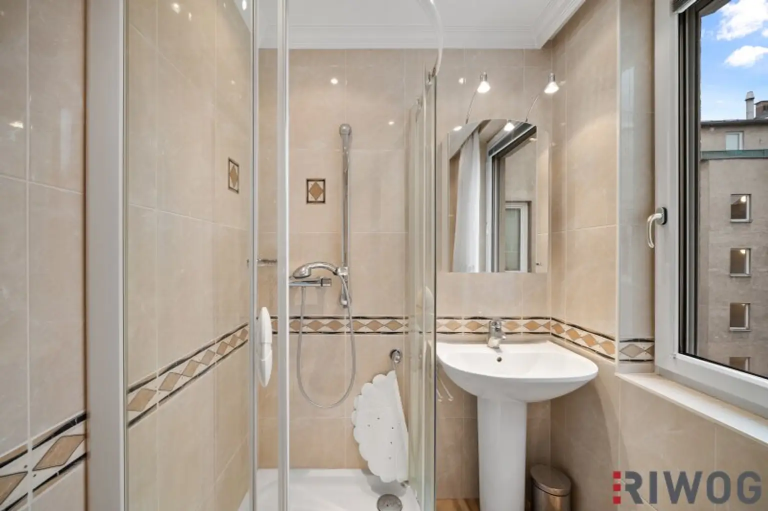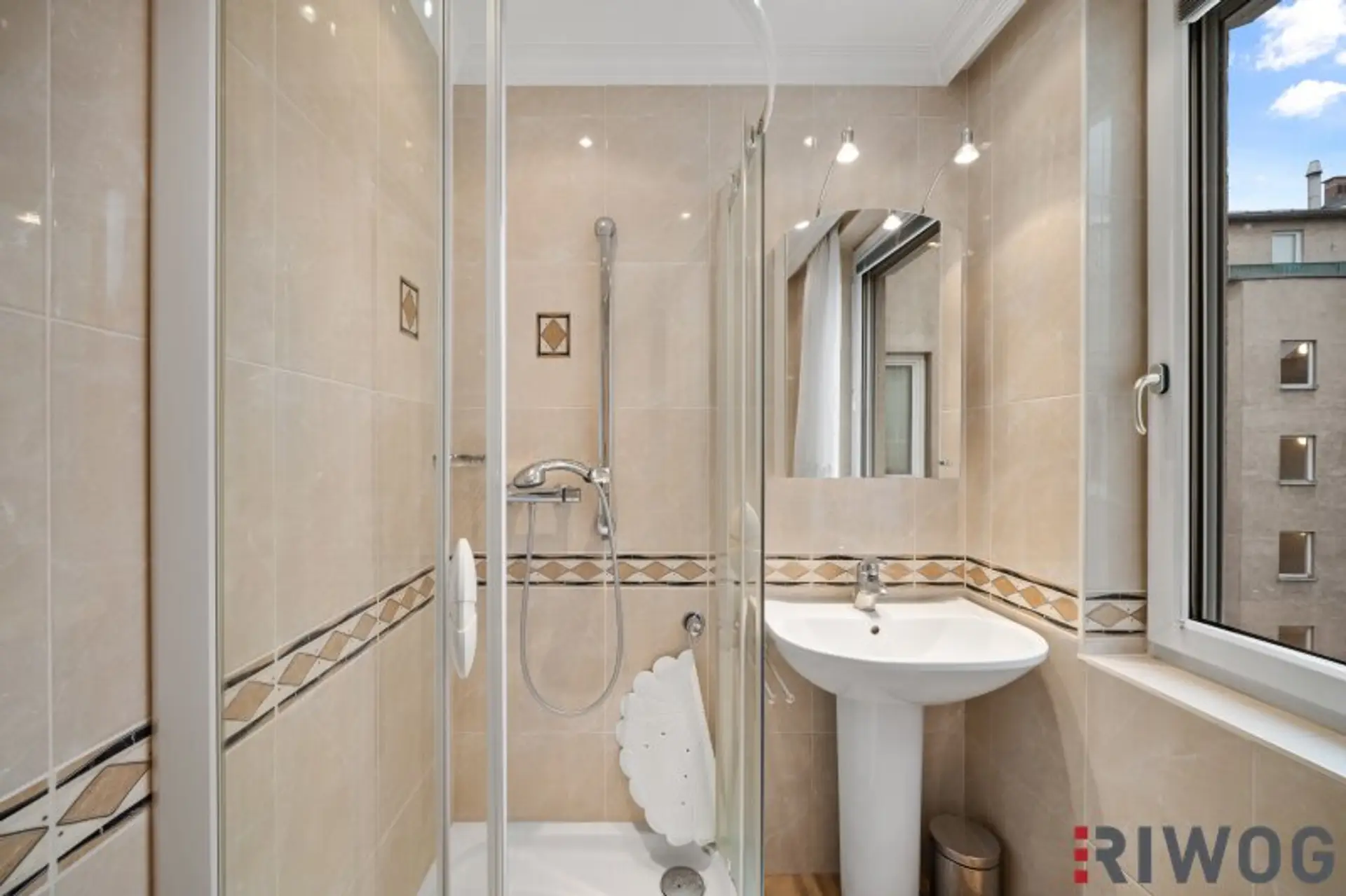 Das Badezimmer verfügt über ein Waschbecken, eine Dusche, einen Waschmaschinenanschluss und auch ein Fenster.