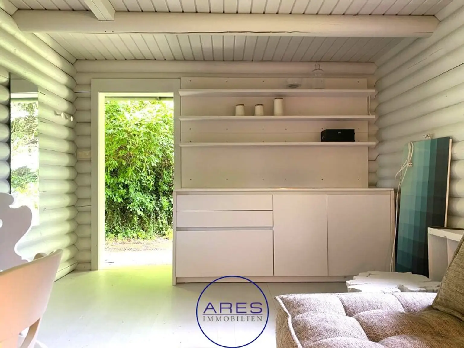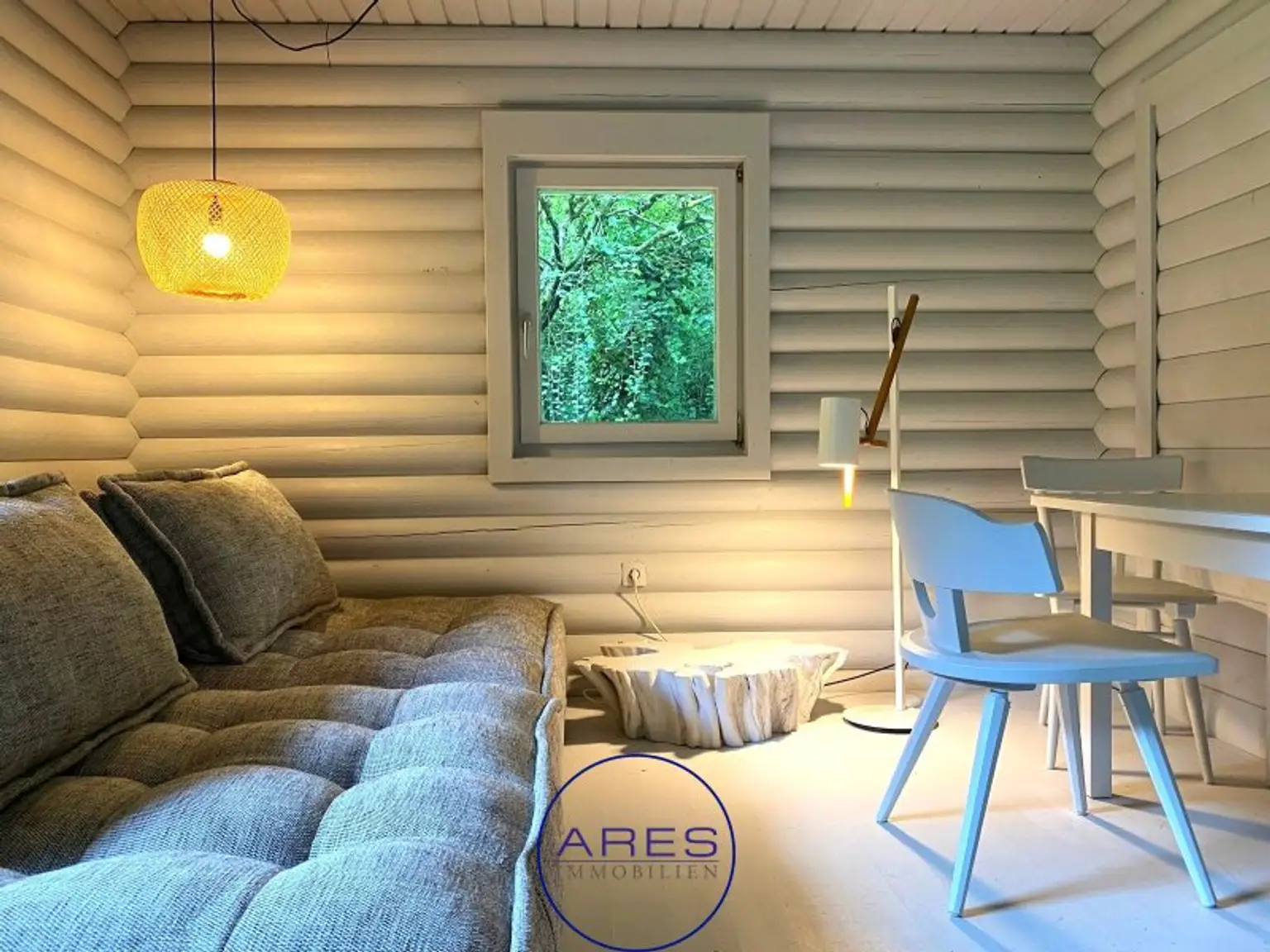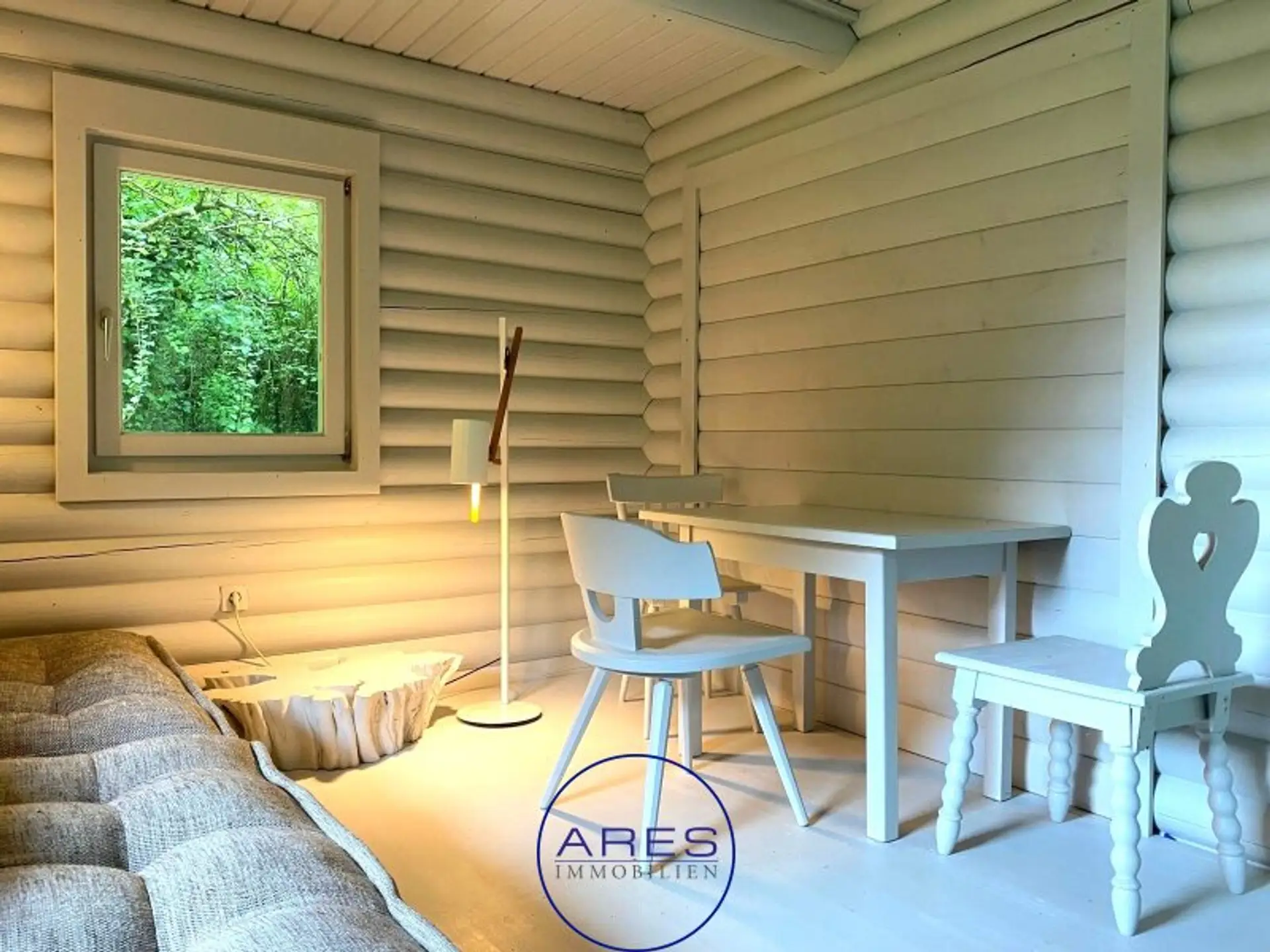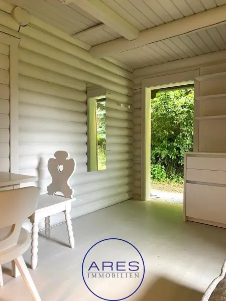 Ein uriges Blockhäuschen - als Gartenhütte genehmigt - mit massiven Sitzgelegenheiten davor, Stromanschluss, Brunnen, kleiner Geräteschuppen, zwei Hochbeete, vor allem aber der herrliche Naturpool (Folienpool), bieten neben ausgleichender Gartenarbeit auch Erholung pur!