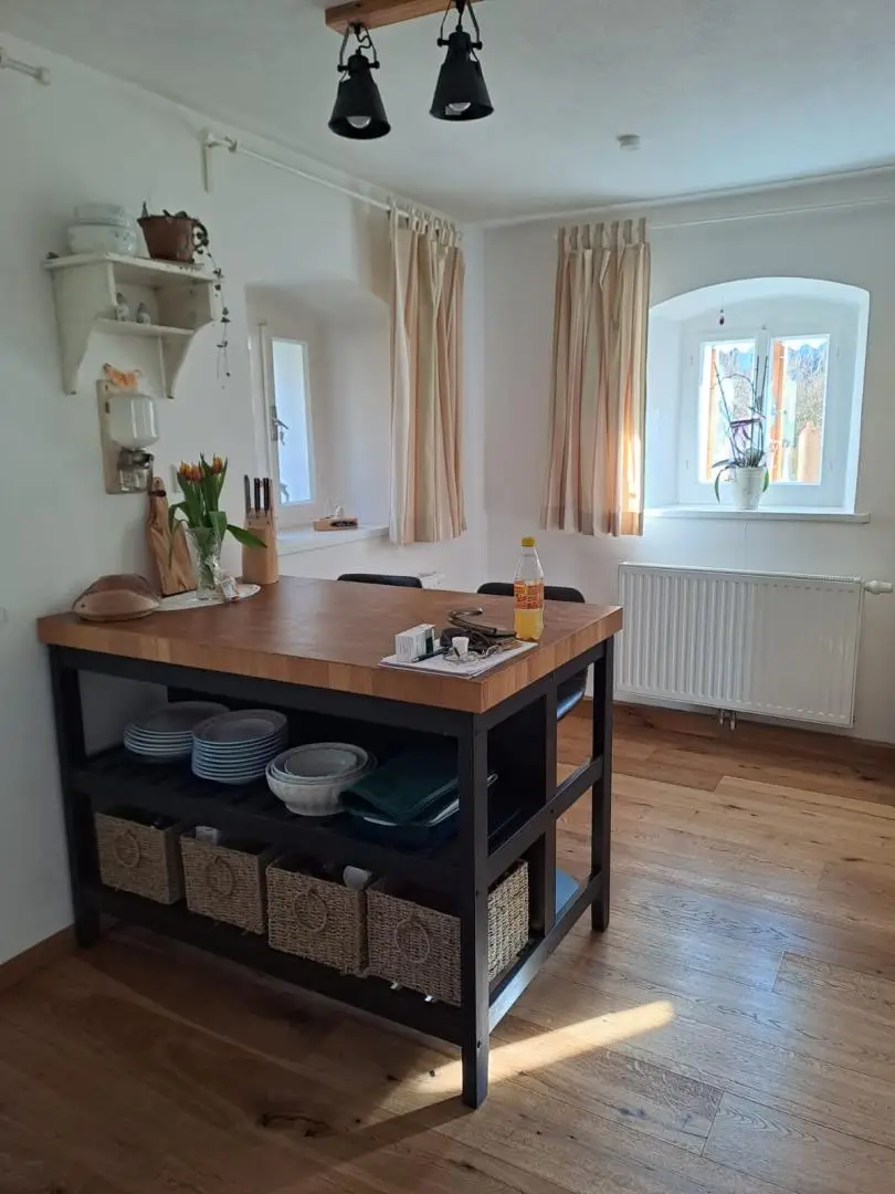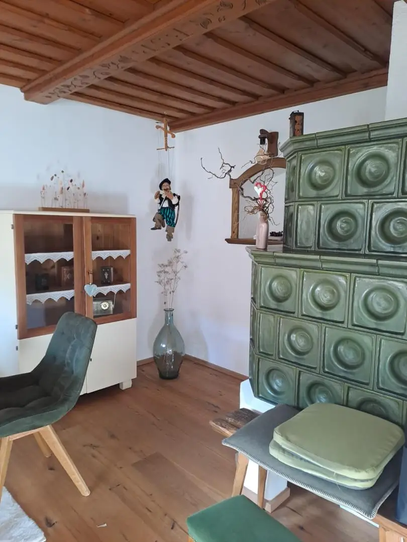 Der Edelstahlkamin sorgt für moderne Eleganz, während der traditionelle Kachelofen und der Tischherd für wohlige Wärme und ein Stück gelebte Gemütlichkeit stehen