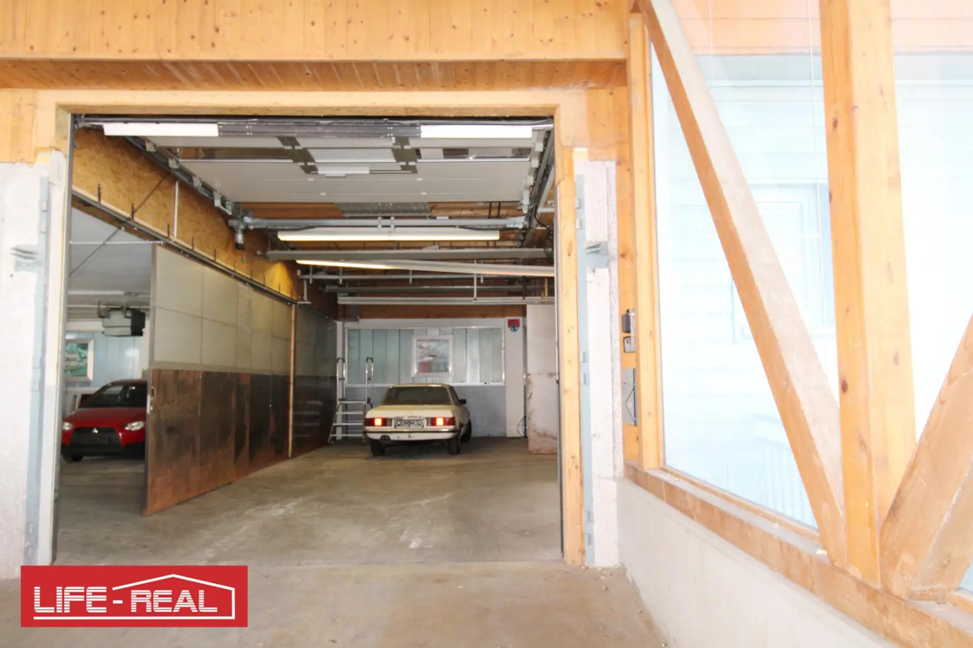 Das Untergeschoss mit etwa 390 m² umfasst großzügige Lagerflächen sowie eine integrierte Parkgarage mit 5 Stellplätzen. Die Lage direkt am Bach sorgt besonders im Sommer für eine angenehme, natürliche Kühlung und ein gutes Raumklima.