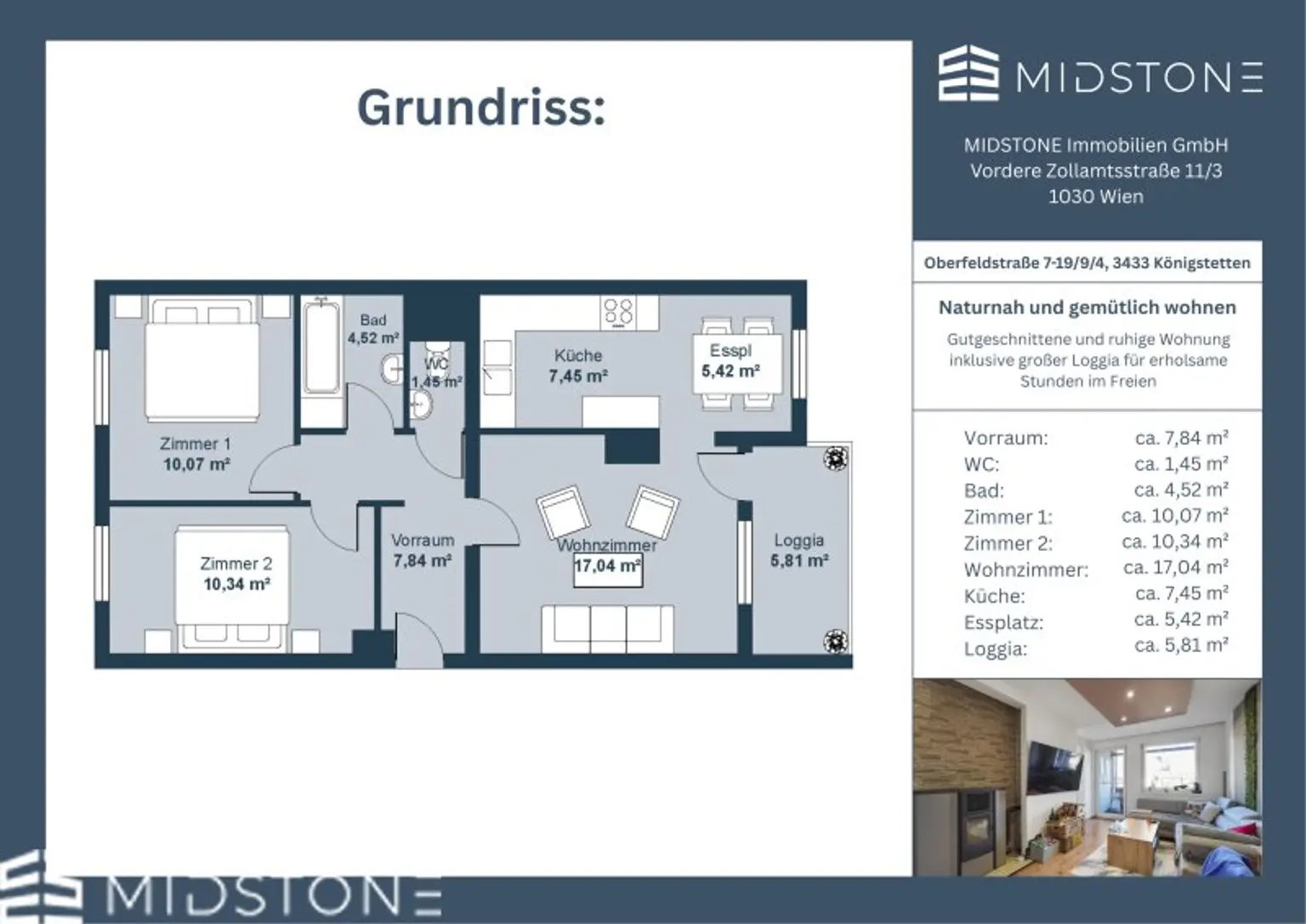 Die Wohnung befindet sich in einer ruhigen und gut gepflegten Wohnanlage in Königstetten, einer charmanten Gemeinde unweit von Tulln. Die Lage bietet ein angenehmes, familienfreundliches Umfeld mit viel Grünraum und einer entspannten Wohnatmosphäre. Zugleich profitiert man von der Nähe zur Stadt Tulln, wo ein umfangreiches Angebot an Einkaufsmöglichkeiten, Gastronomie, Schulen und Freizeiteinrichtungen zur Verfügung steht.
