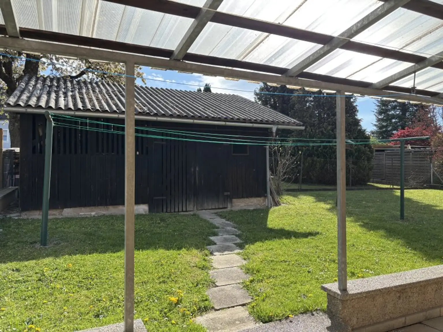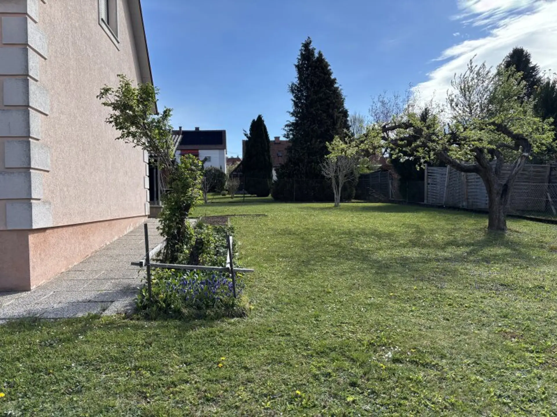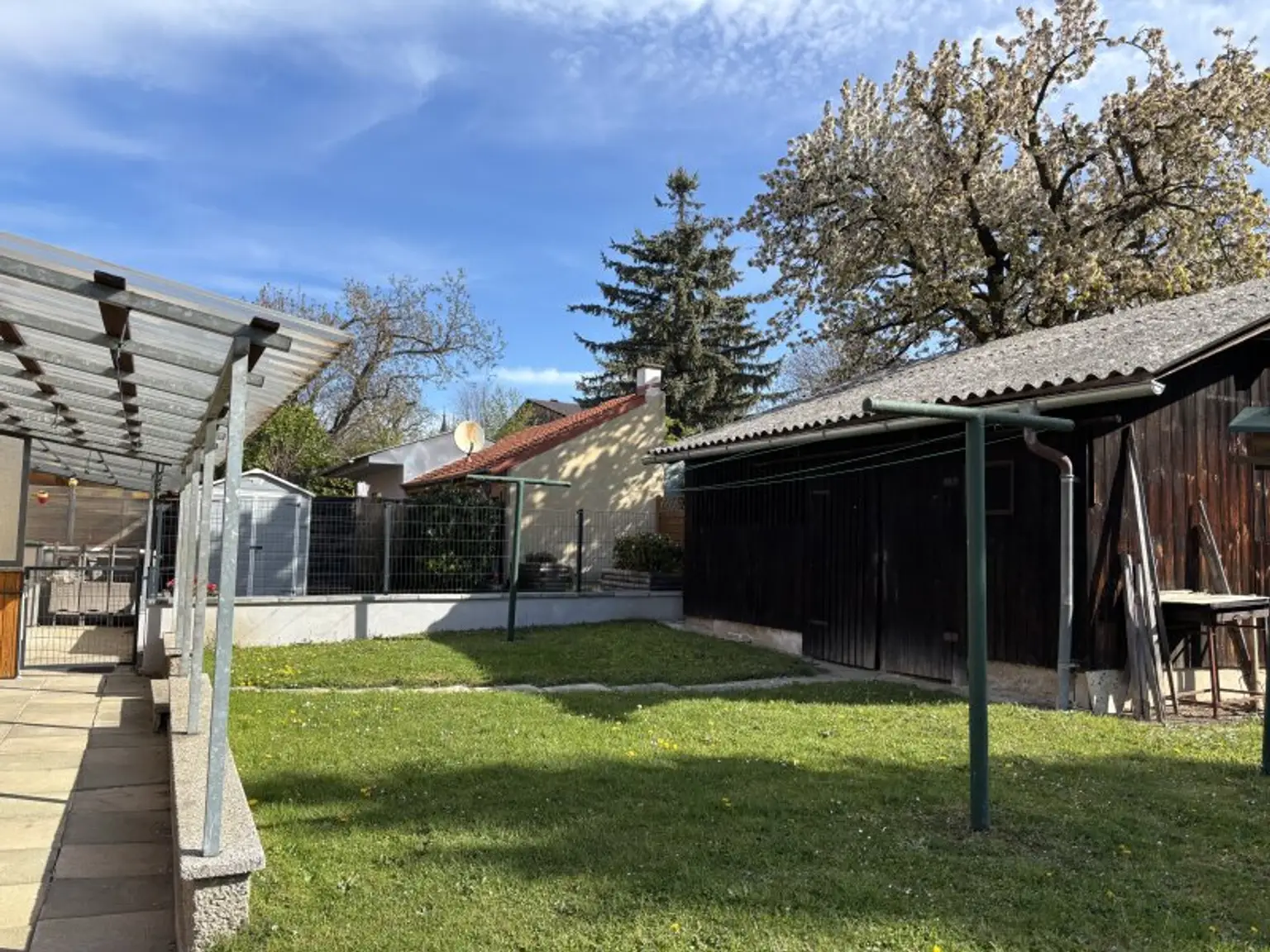 Ein bezaubernder Garten mit einem großen Apfelbaum bietet auch die Möglichkeit ein Carport aufzustellen.