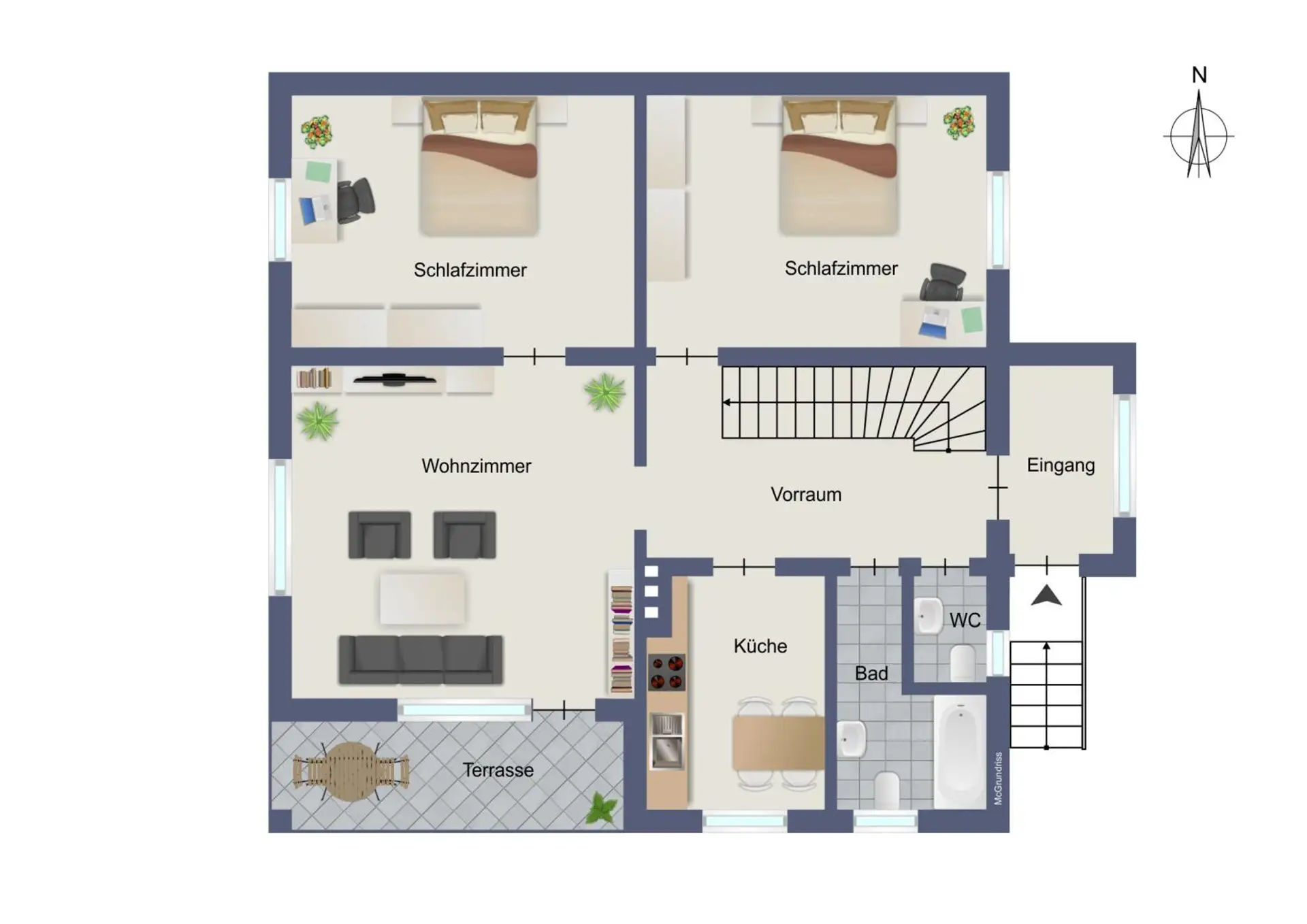 Vorraum, WC, Badezimmer, zwei Zimmer (Schlaf- oder Arbeitszimmer), Küche, Wohnzimmer mit Zugang zur Terrasse