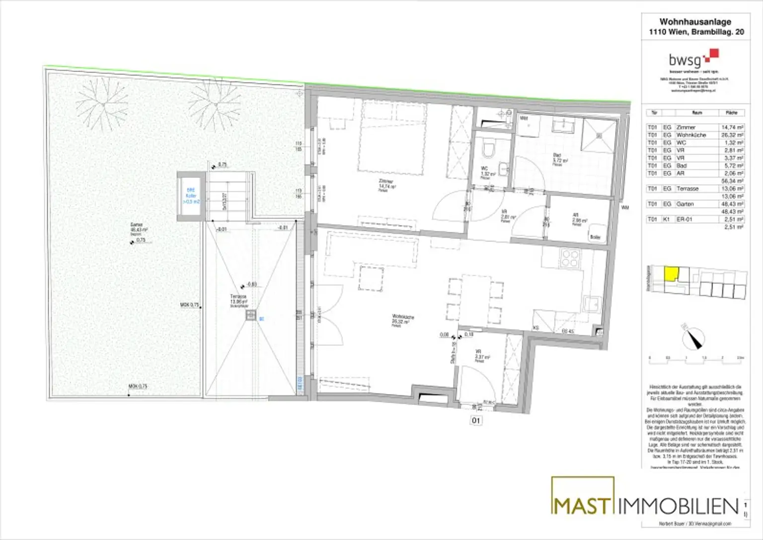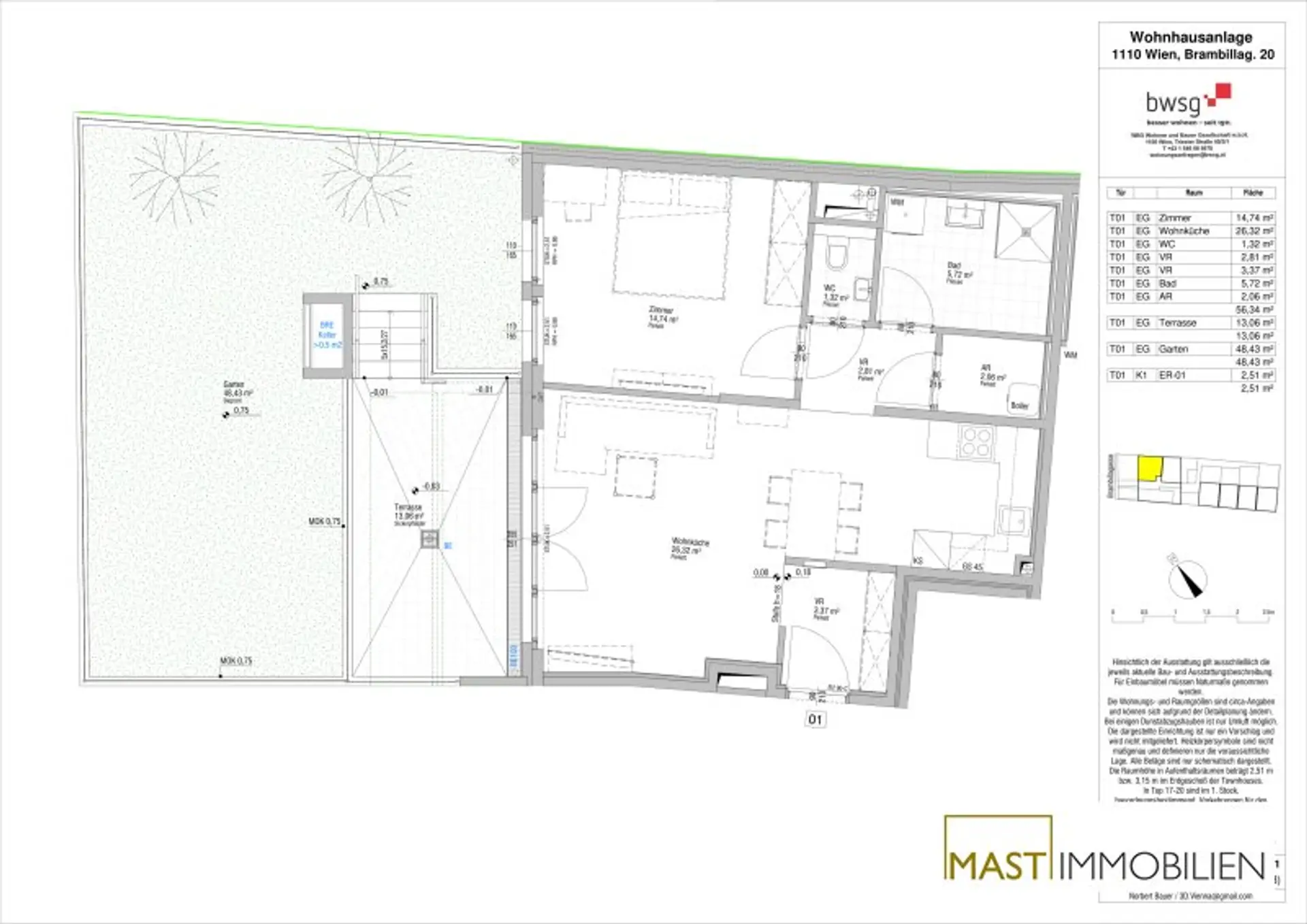 Die Wohnung befindet sich im Erdgeschoss und verfügt über 56,34 m² Wohnfläche + eine 13,06 m² große Terrasse + ein 48,43 m² großer Garten.