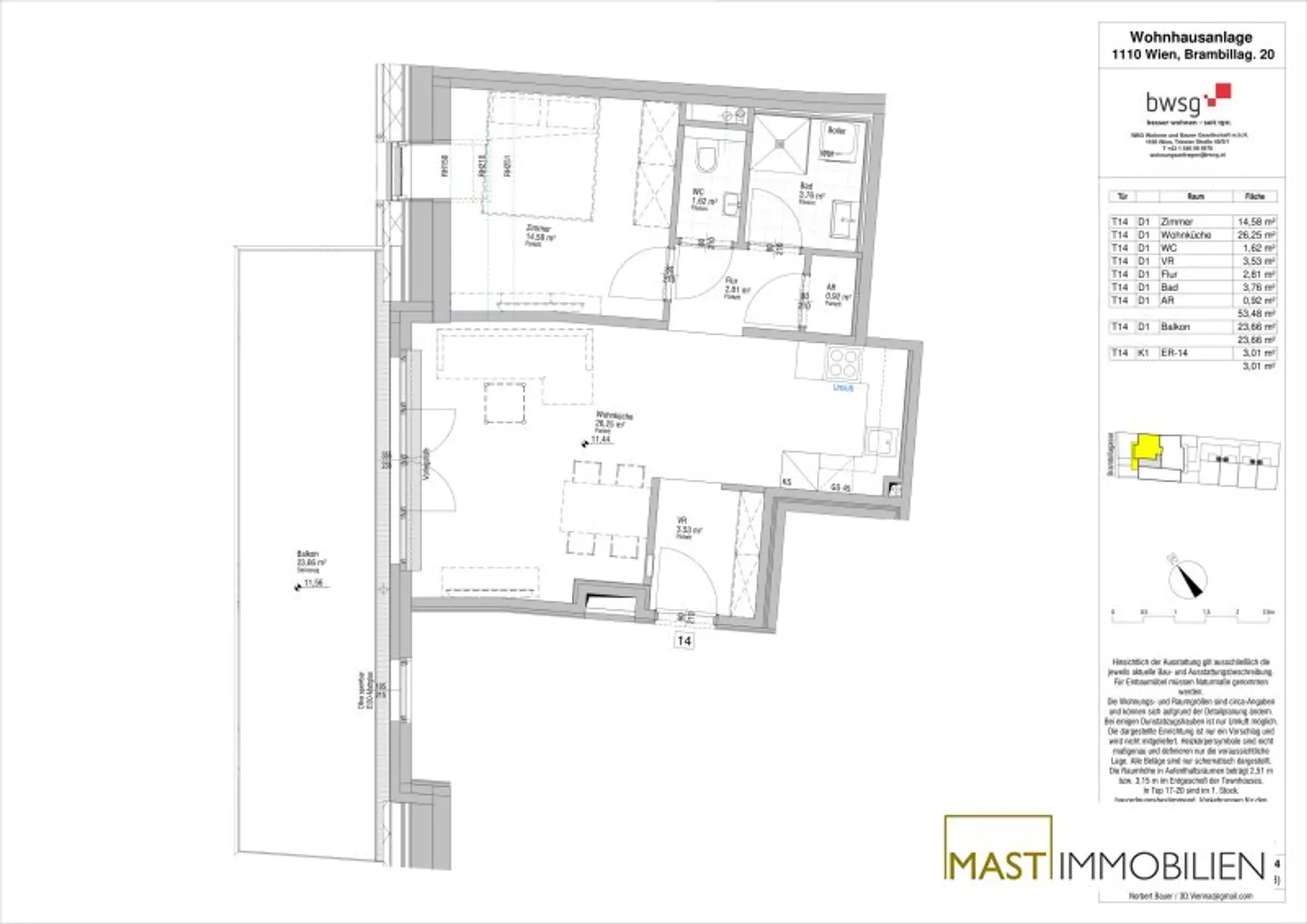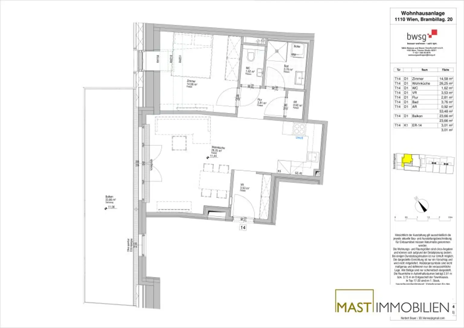 Die Wohnung befindet sich im 4. Liftstock (1. Dachgeschoss) und verfügt über 53,48 m² Wohnfläche + einen 23,66 m² großen Balkon.