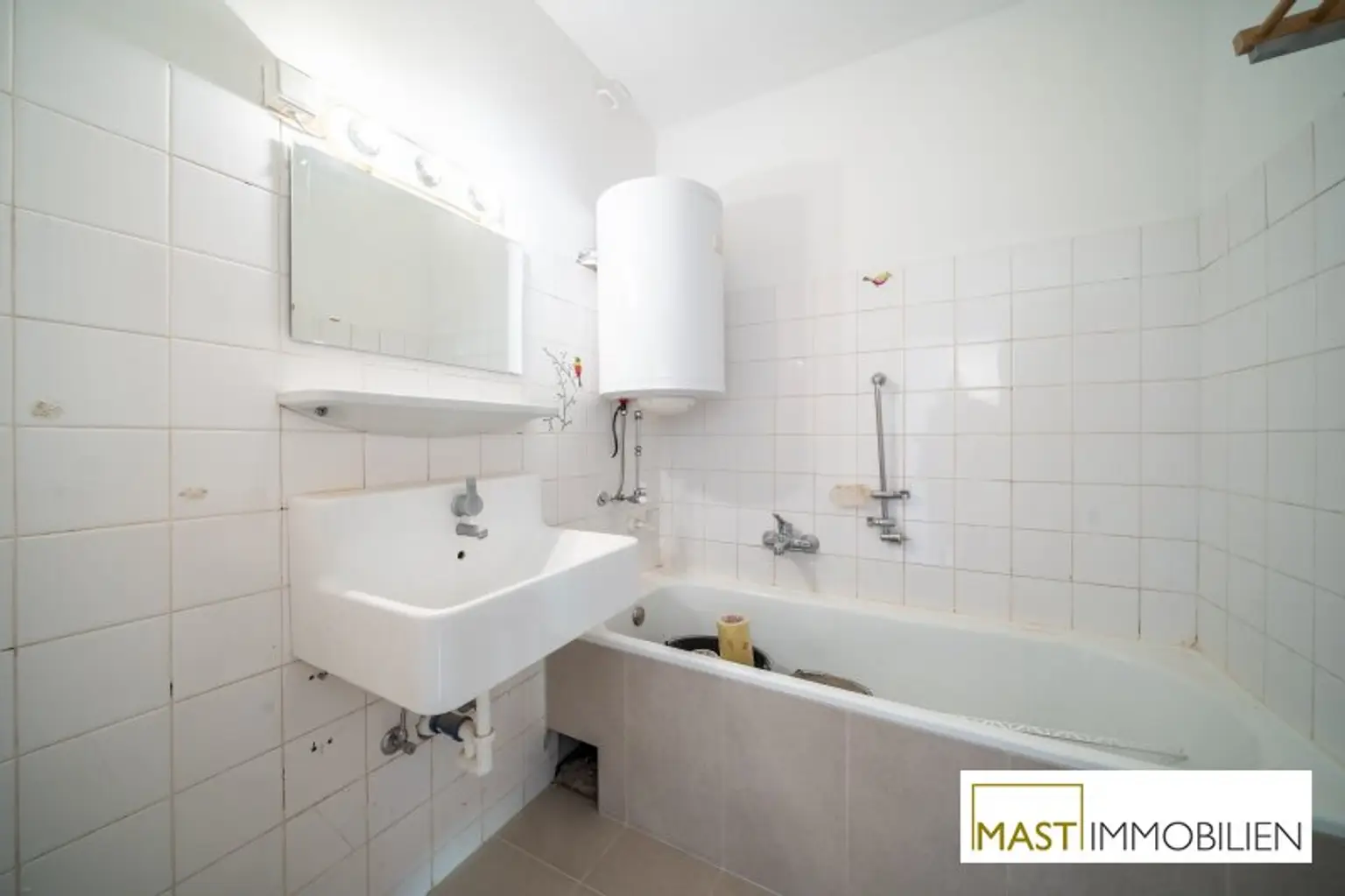 Das Badezimmer ist voll funktionsfähig und muss grundsätzlich nicht saniert werden. Besonders hervorzuheben ist der neu verlegte Parkettboden, der sich durch die gesamte Wohnung zieht und für eine hochwertige Wohnatmosphäre sorgt.
