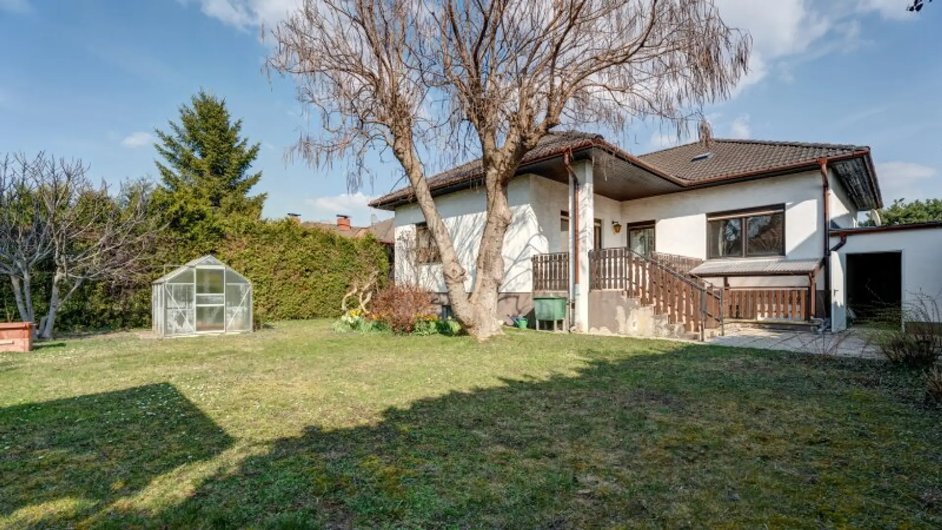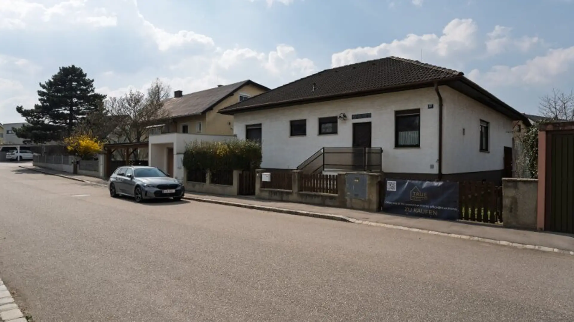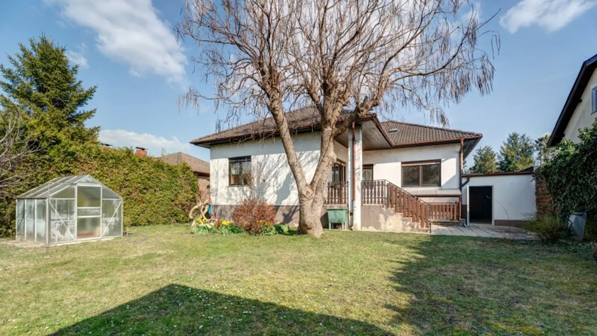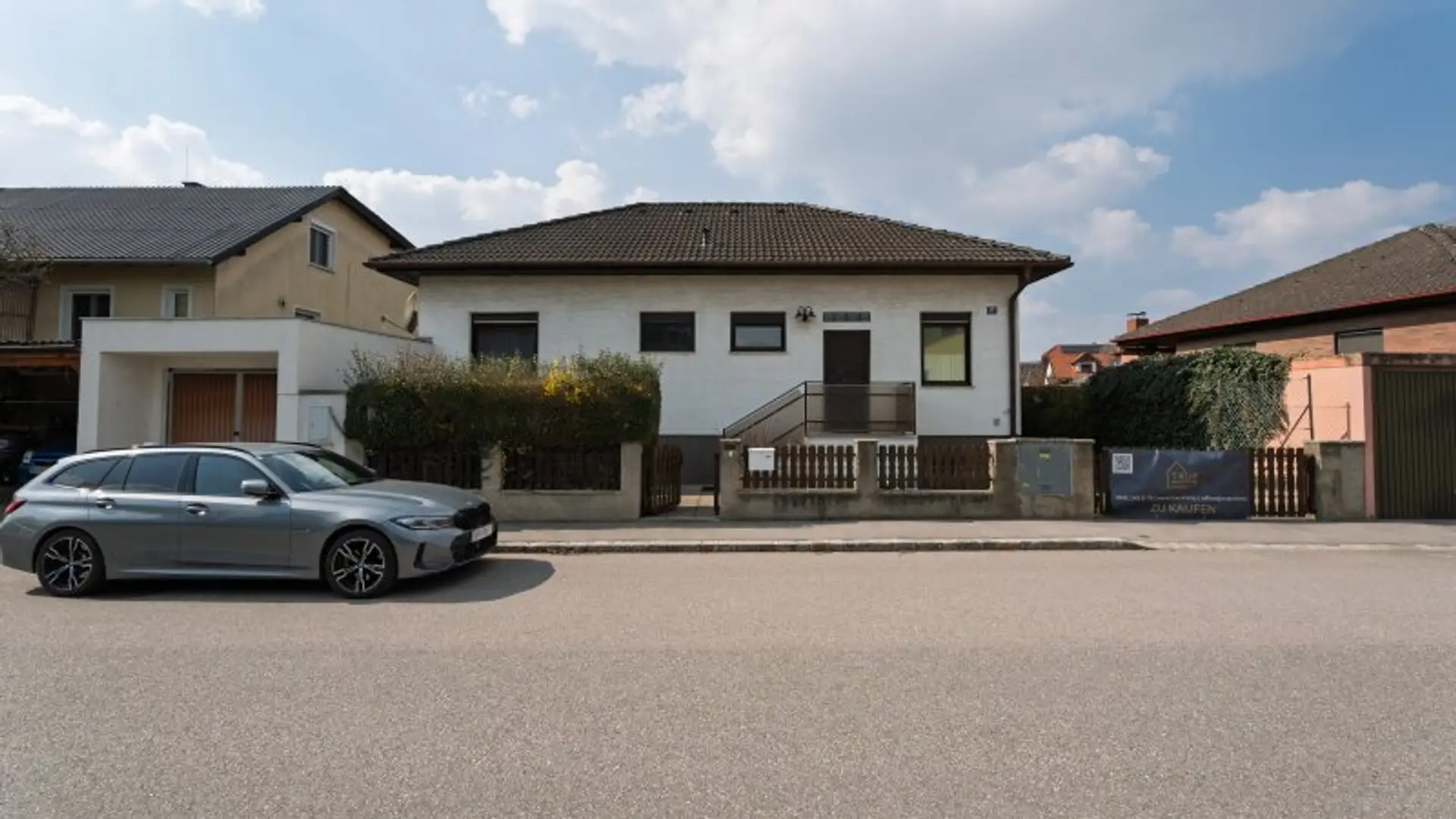 Sie gelangen zu diesem Haus über die Garage. Nachdem Sie Ihr Auto abgestellt haben, erreichen Sie über eine Tür ins Freie und wenige Stufen den Hauseingang.