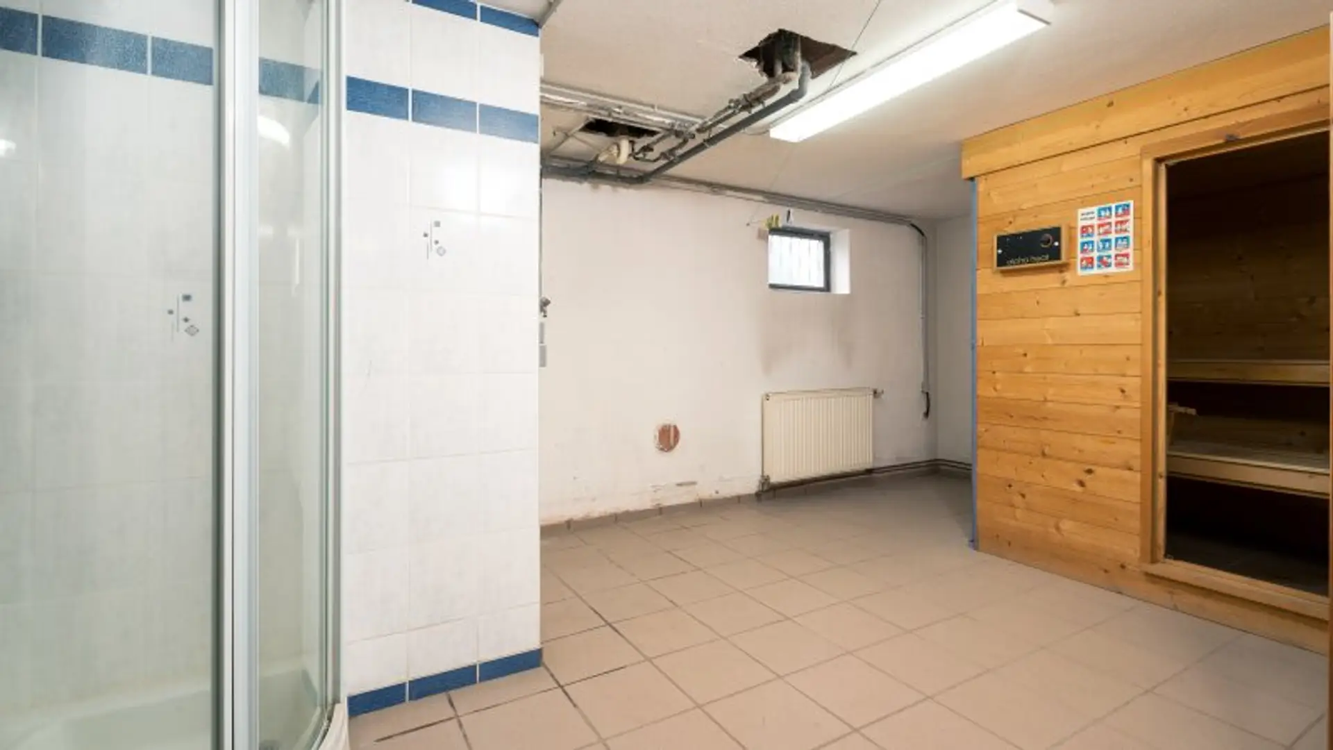In einem weiteren Bereich wurde ein kleiner Saunabereich mit Dusche und WC eingerichtet. Zudem befindet sich hier eine integrierte Brunnenpumpe, welche für die Gartenbewässerung genutzt wird.