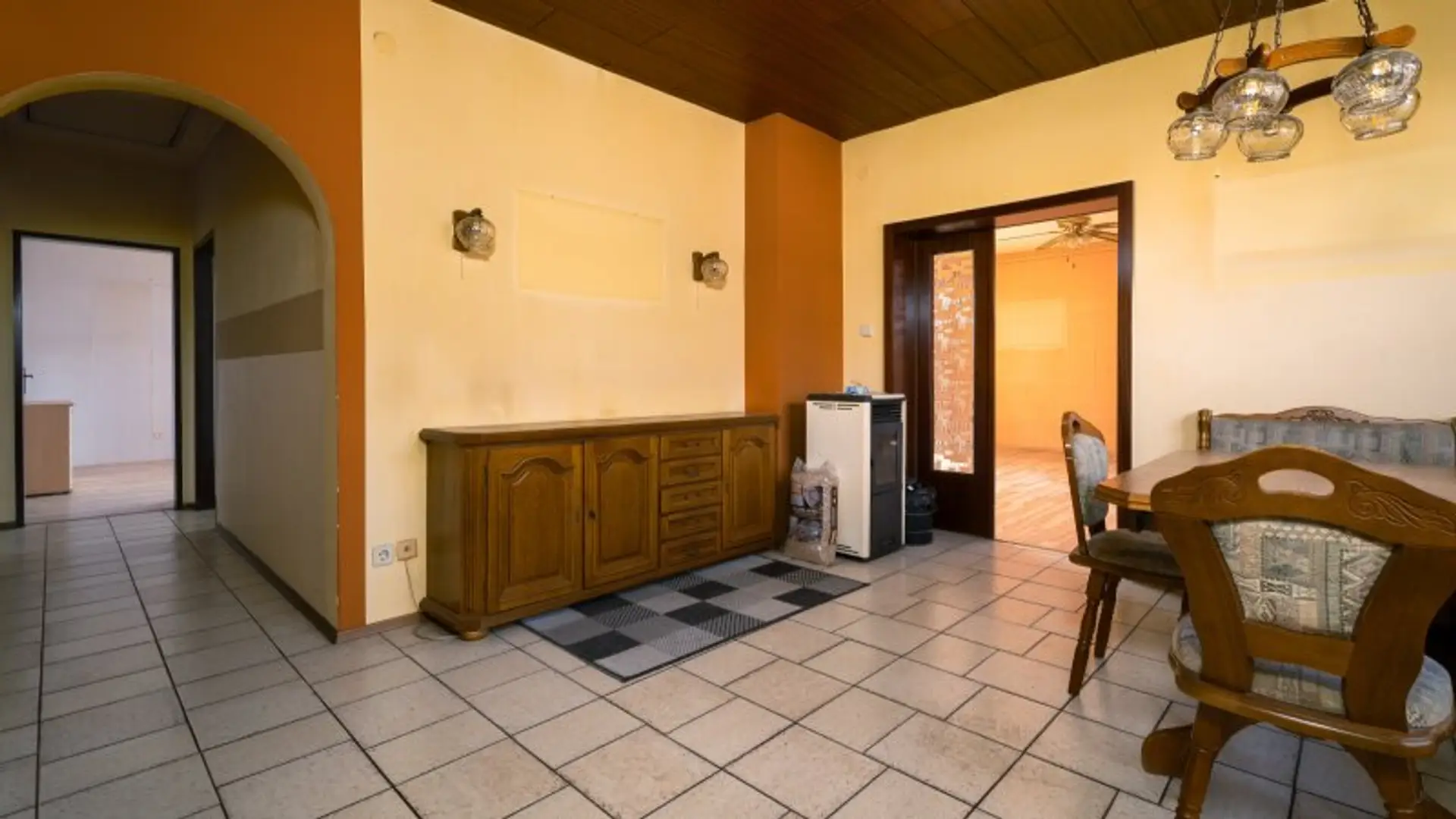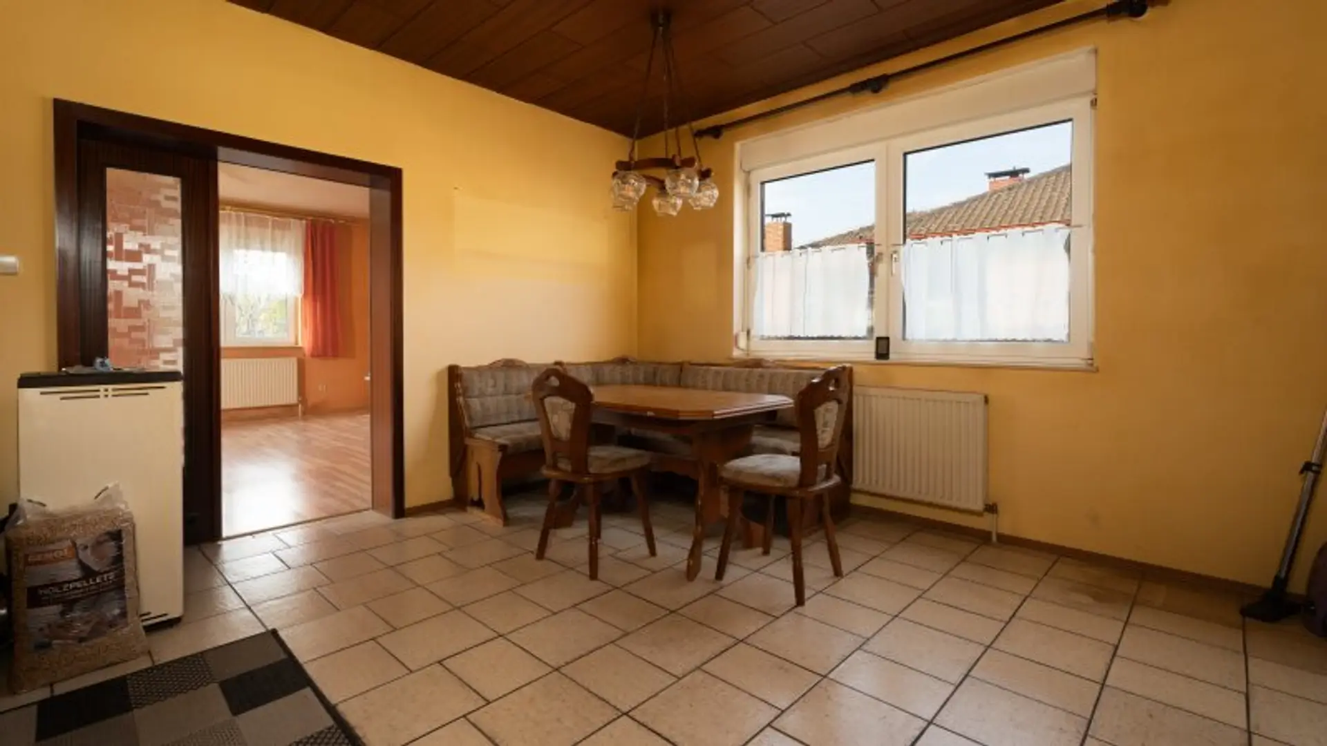 Geradeaus betreten Sie das Esszimmer, in dem sich auch ein Pelletsofen befindet – ideal für zukünftige Kamin- oder Kachelofenlösungen. Rechts anschließend liegt die Küche mit angenehmer Größe.