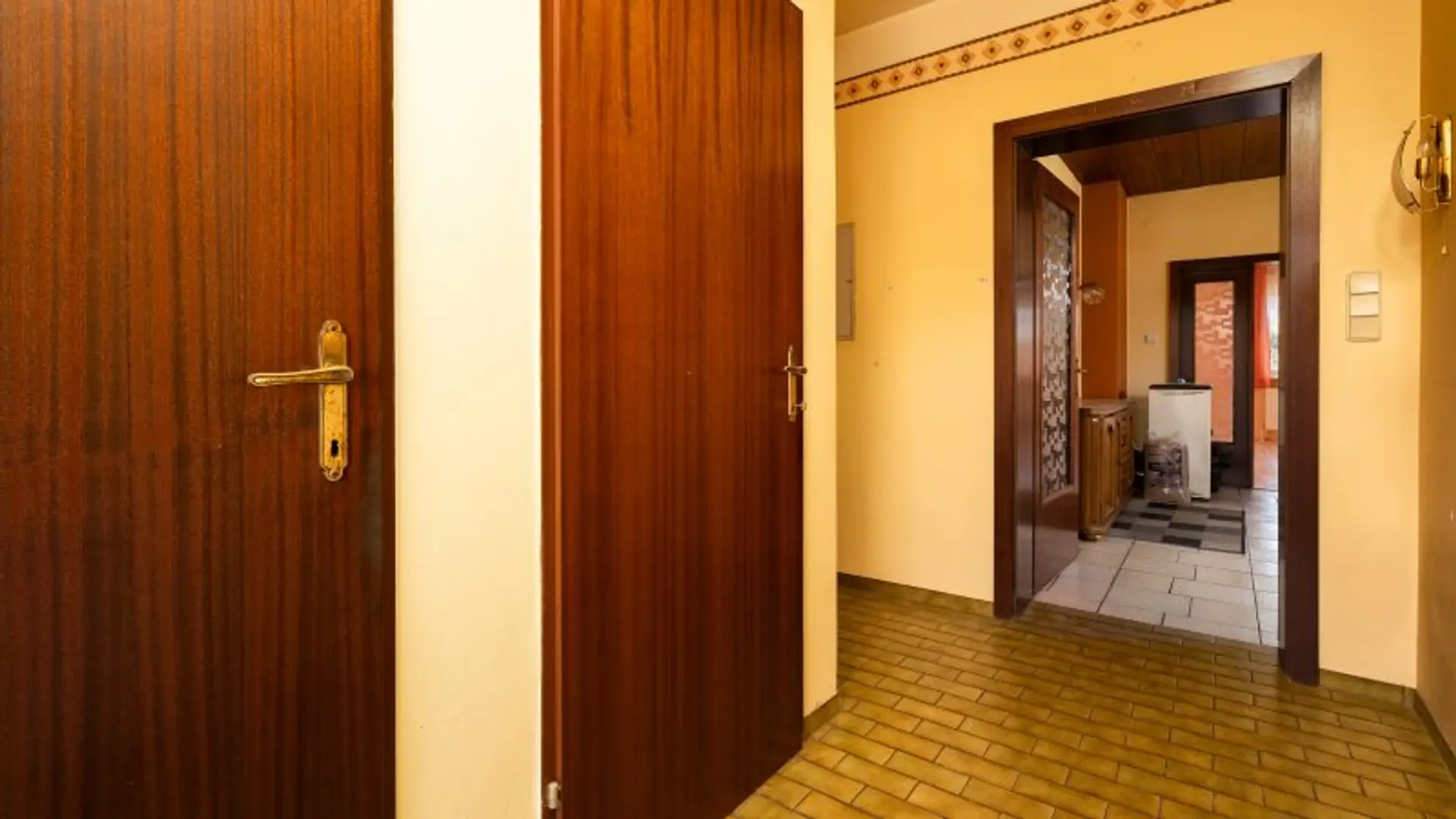 Der Vorraum bietet ausreichend Platz für Jacken und Schuhe. Linkerhand befindet sich ein separates WC mit Fenster, daneben der Abgang in den Keller.