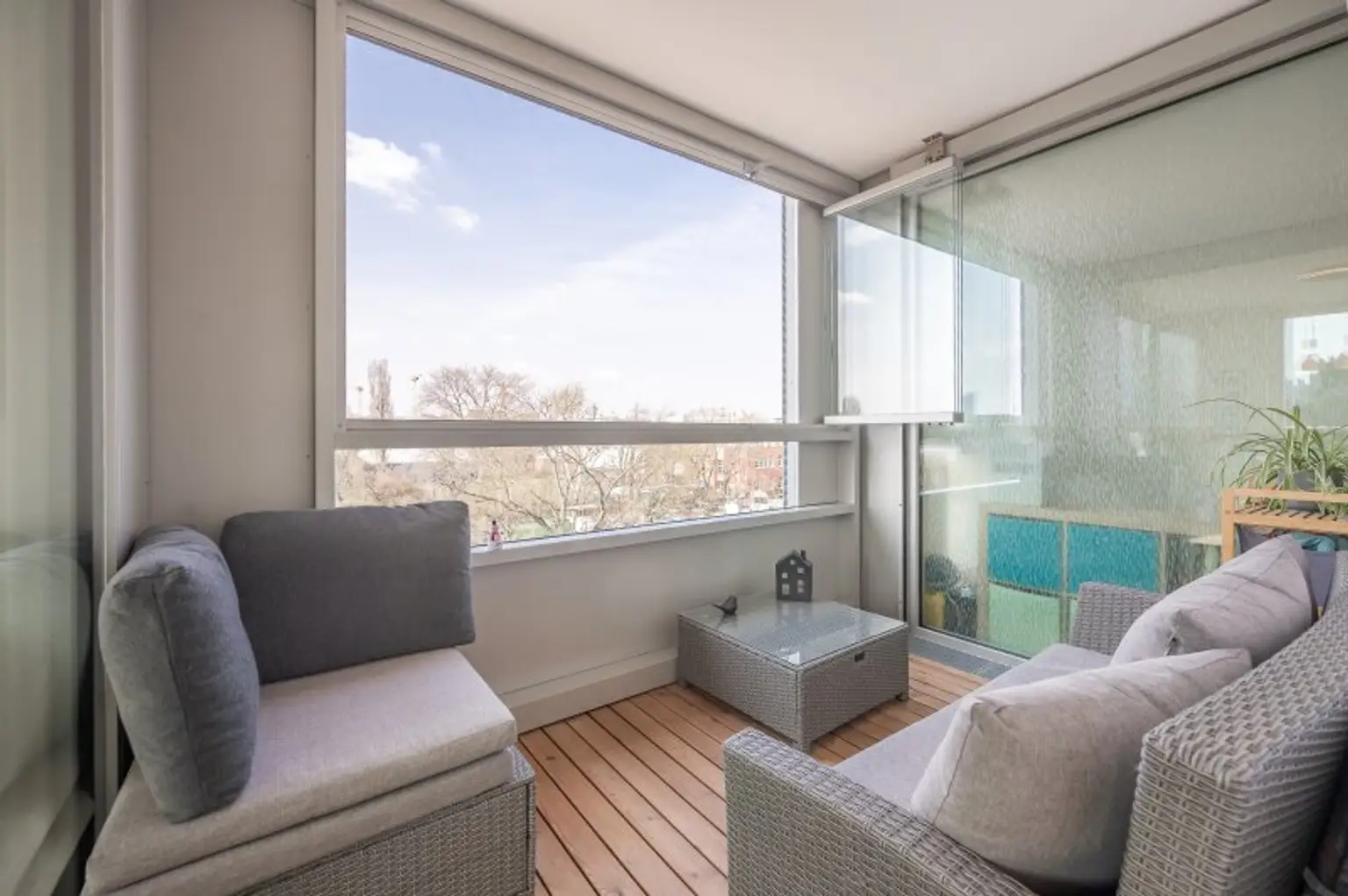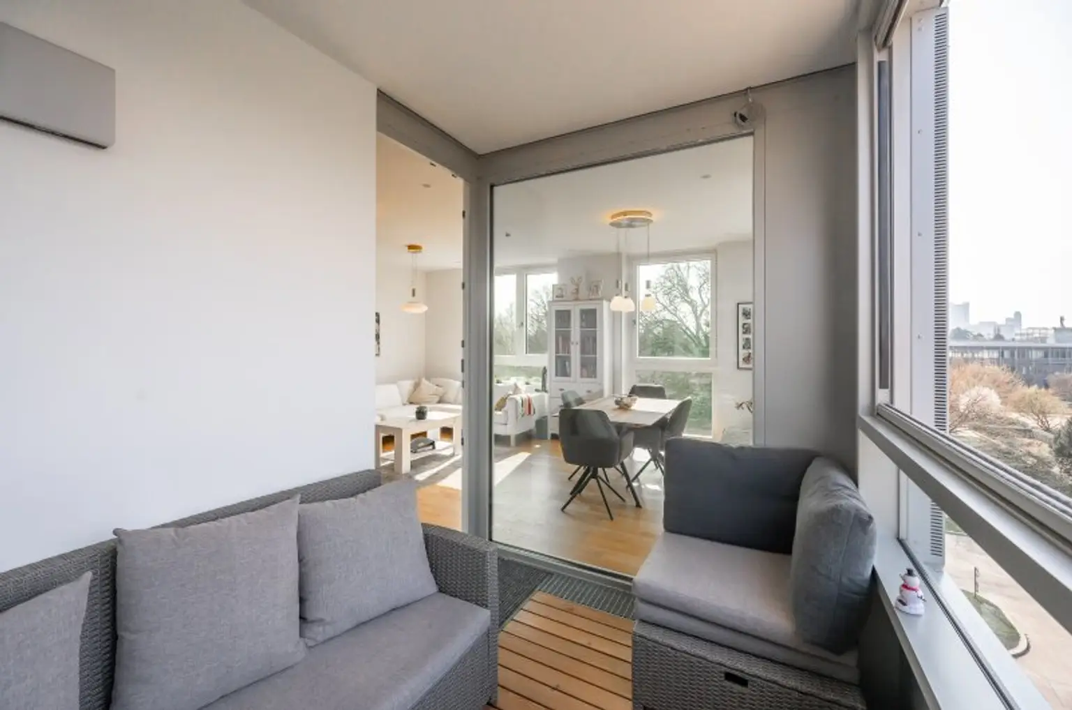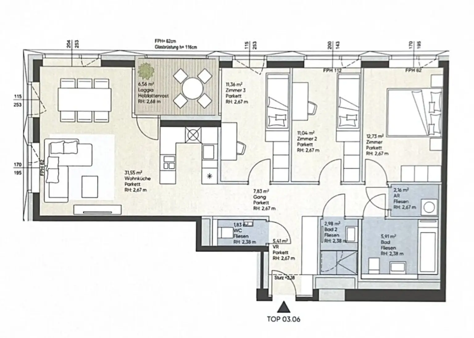 * Loggia vom Wohnzimmer aus begehbar.