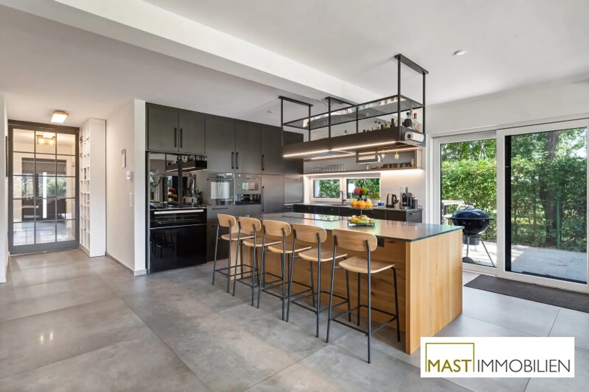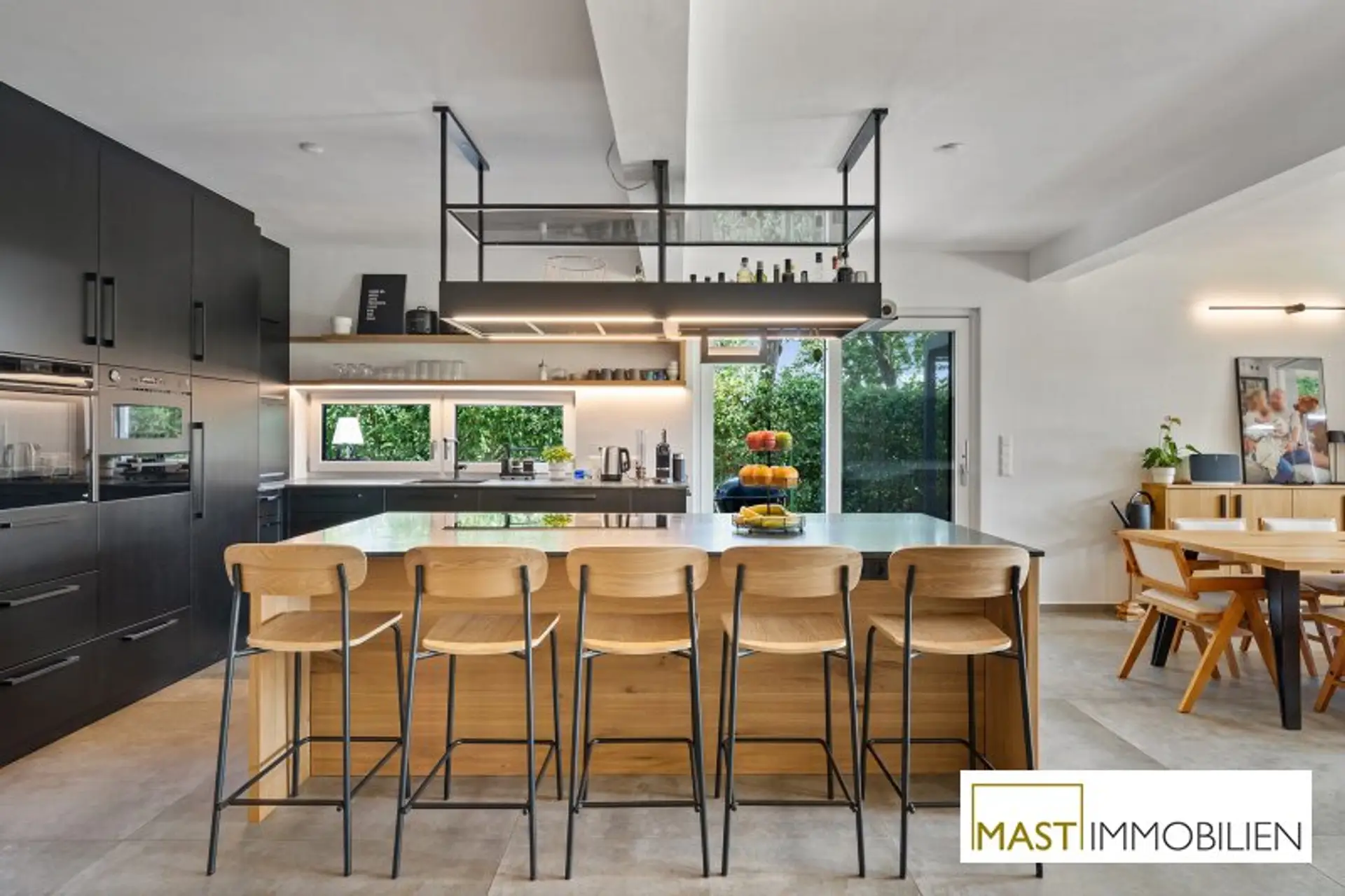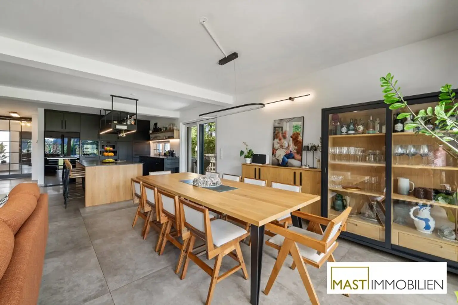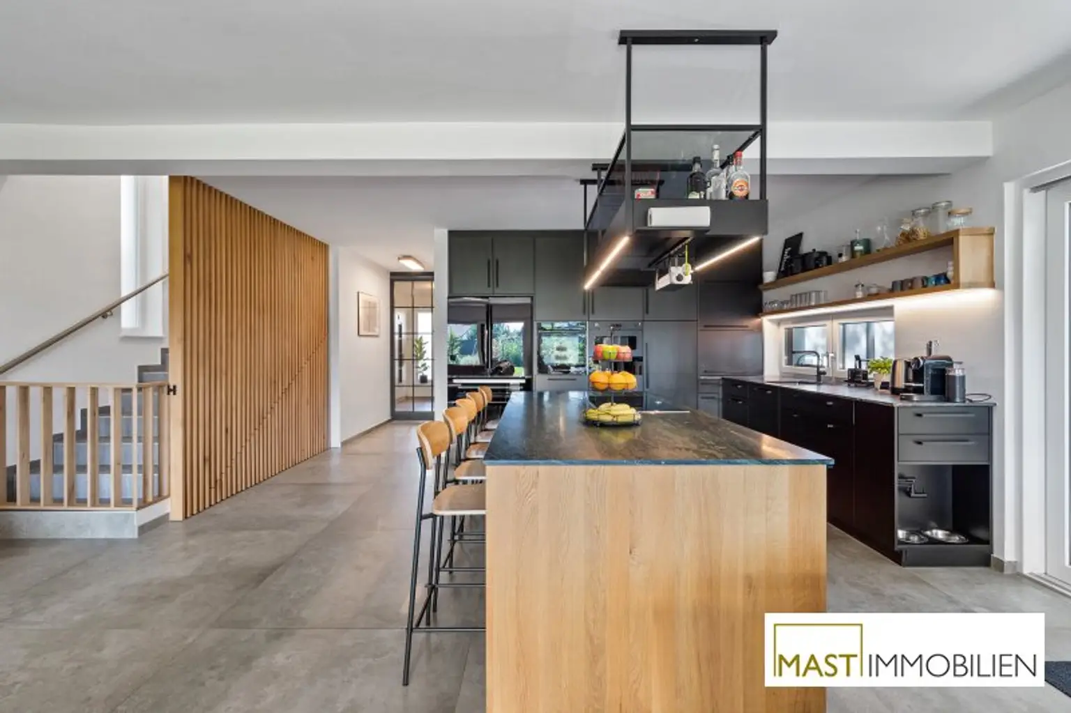 Besonders hervorzuheben sind die zahlreichen maßgefertigten Tischlereinbauten, darunter eine hochwertige Küche mit Geräten von Neff, Siemens und Falmec, Echtholz-Elementen und Granit-Arbeitsplatte.