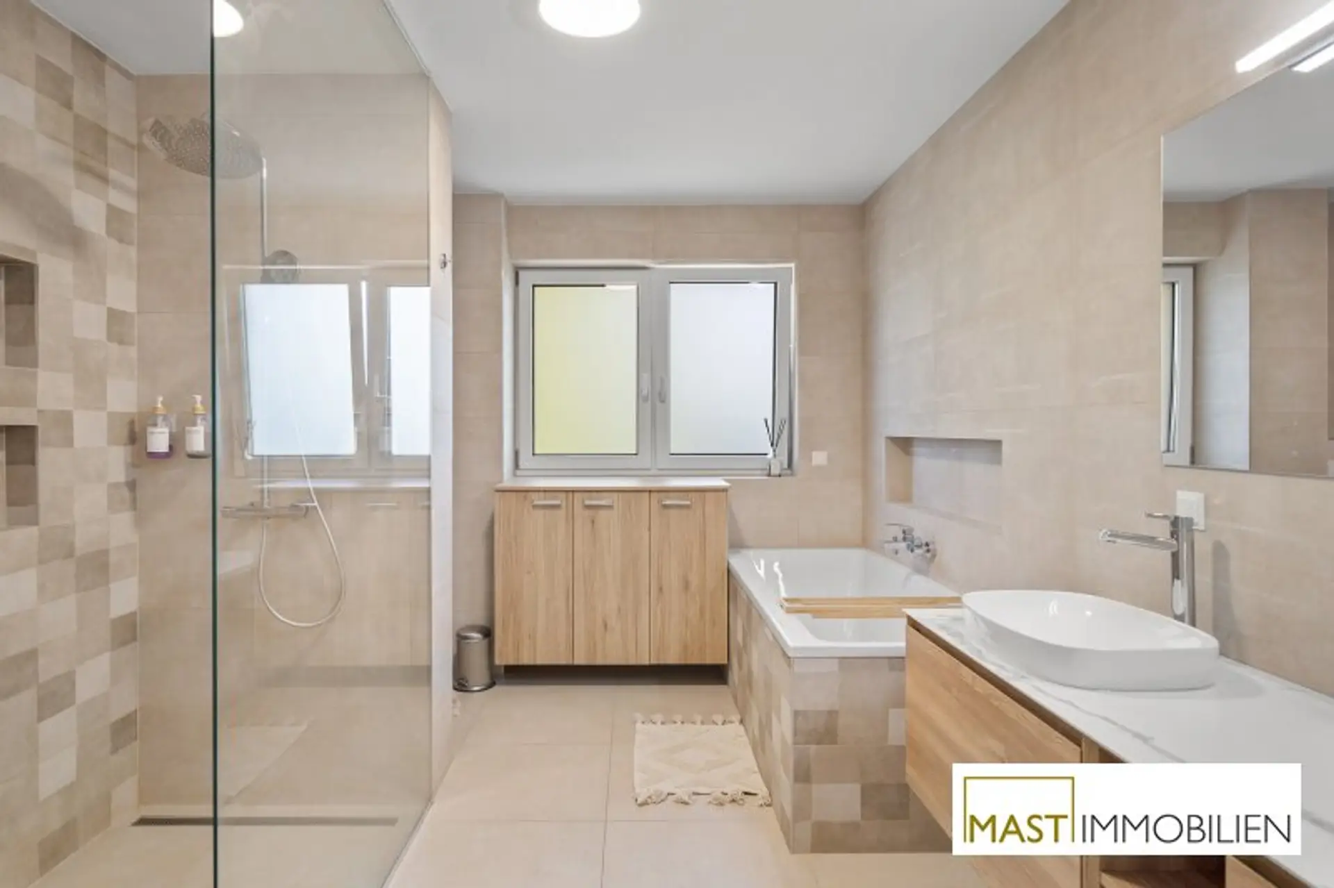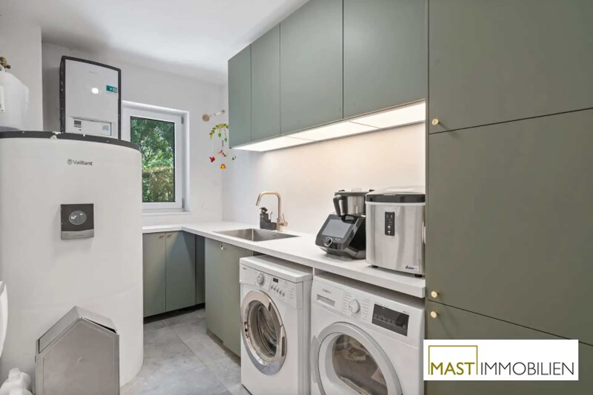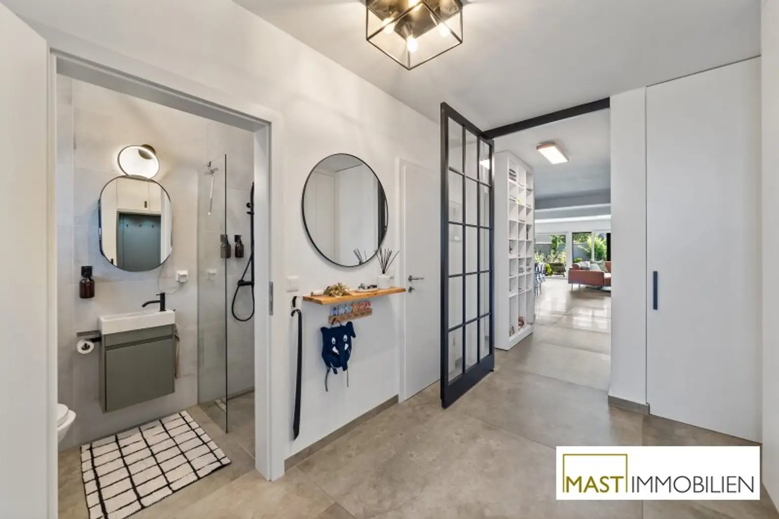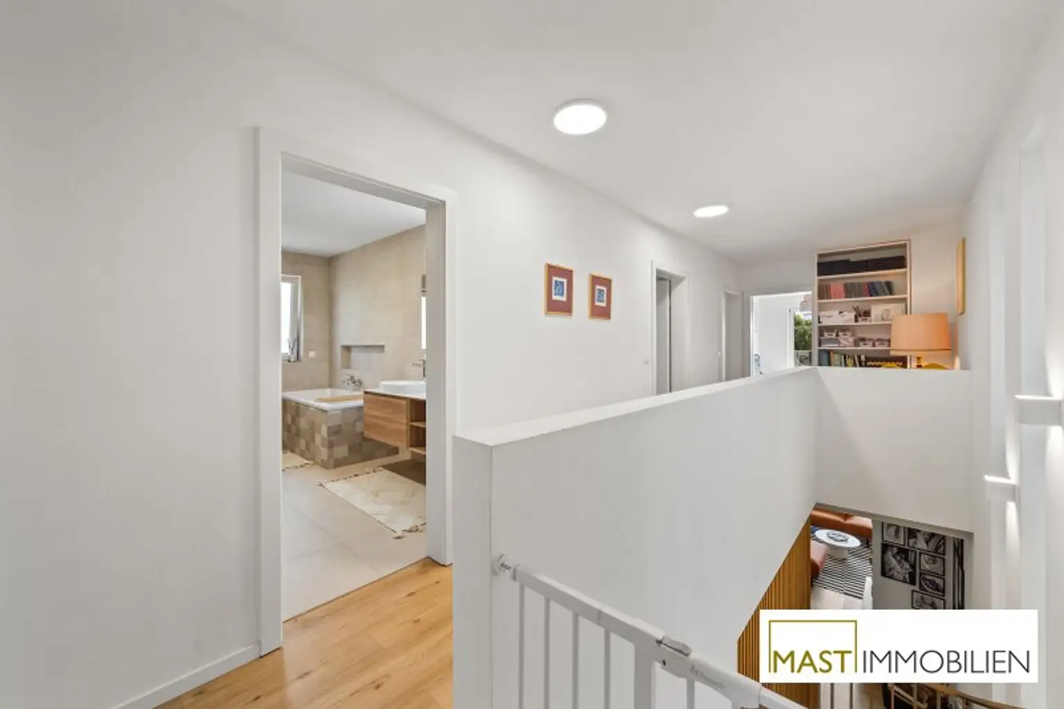 Besonders hervorzuheben sind die zahlreichen maßgefertigten Tischlereinbauten, darunter eine hochwertige Küche mit Geräten von Neff, Siemens und Falmec, Echtholz-Elementen und Granit-Arbeitsplatte.