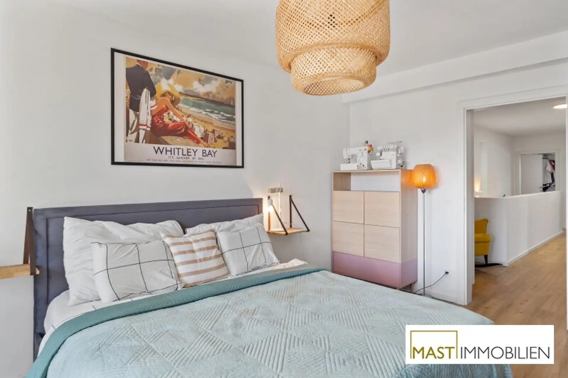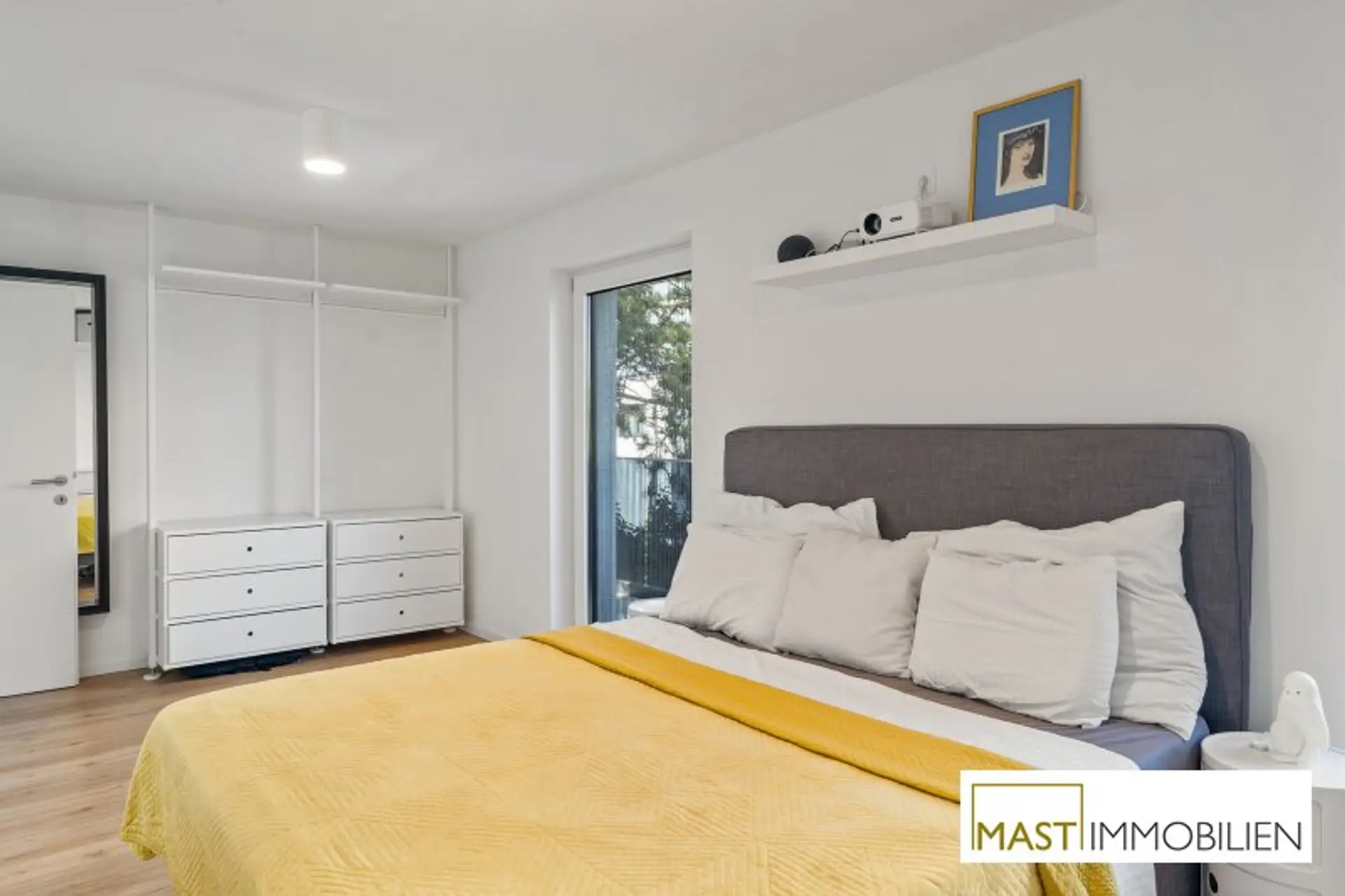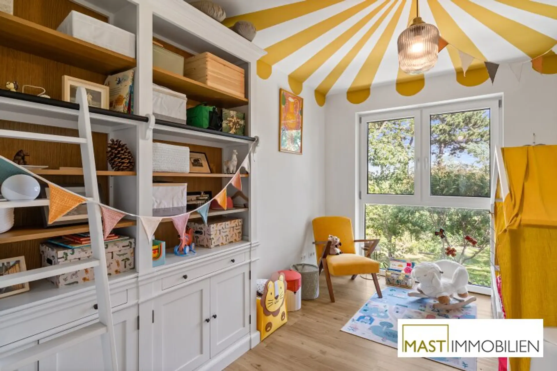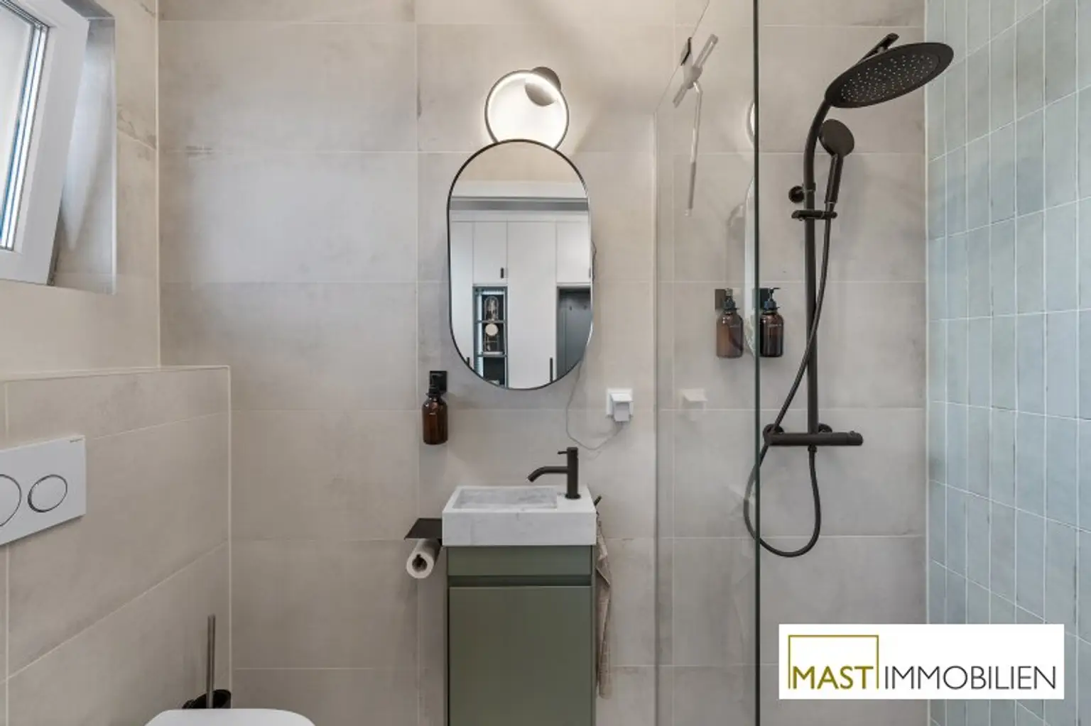 Besonders hervorzuheben sind die zahlreichen maßgefertigten Tischlereinbauten, darunter eine hochwertige Küche mit Geräten von Neff, Siemens und Falmec, Echtholz-Elementen und Granit-Arbeitsplatte.
