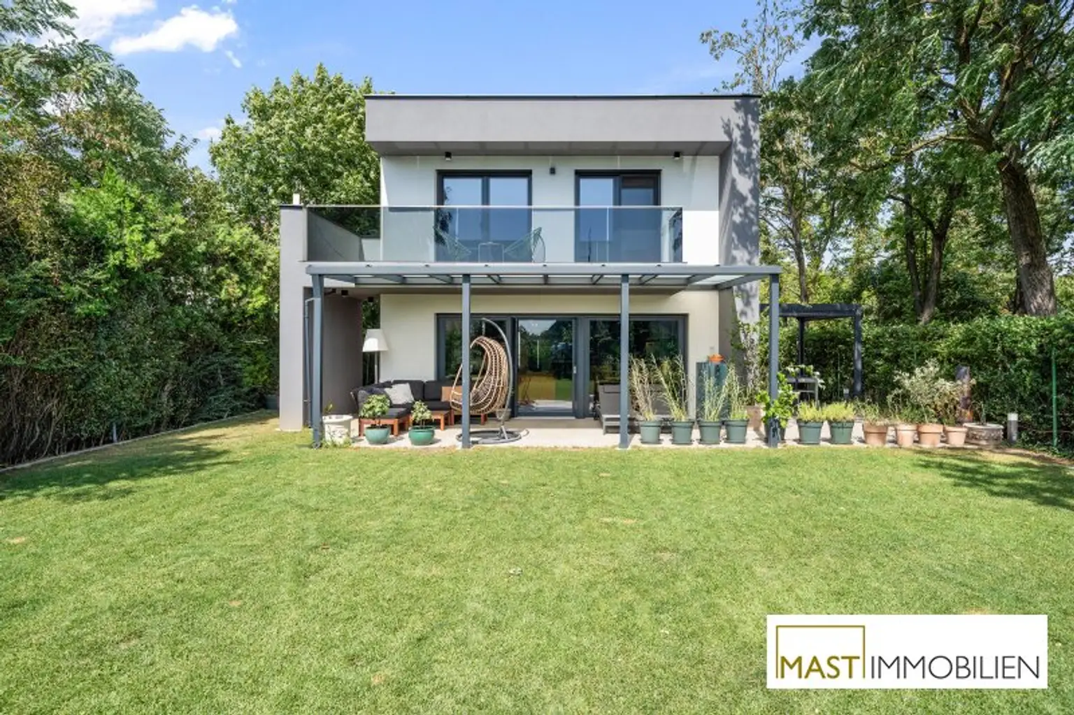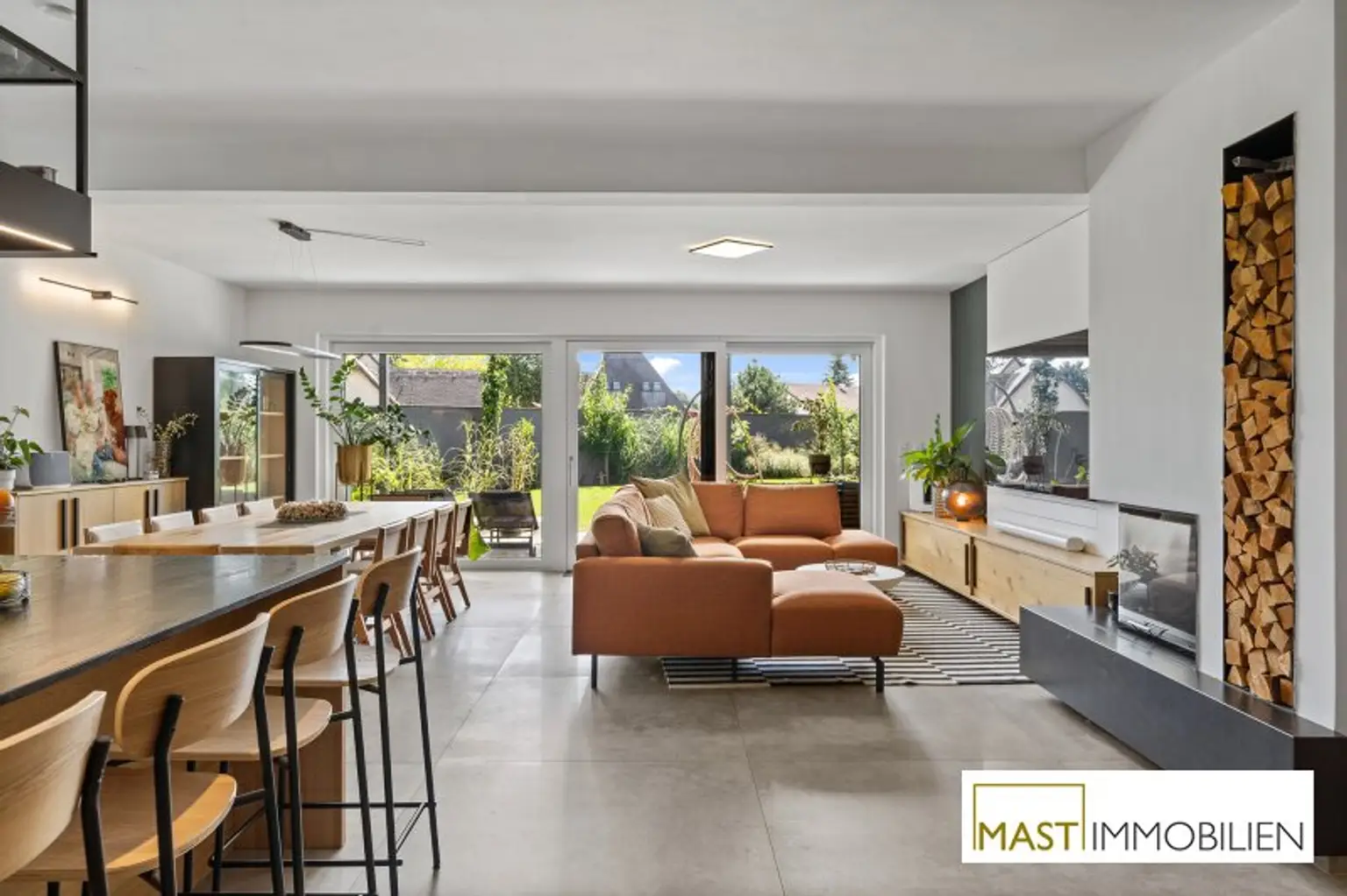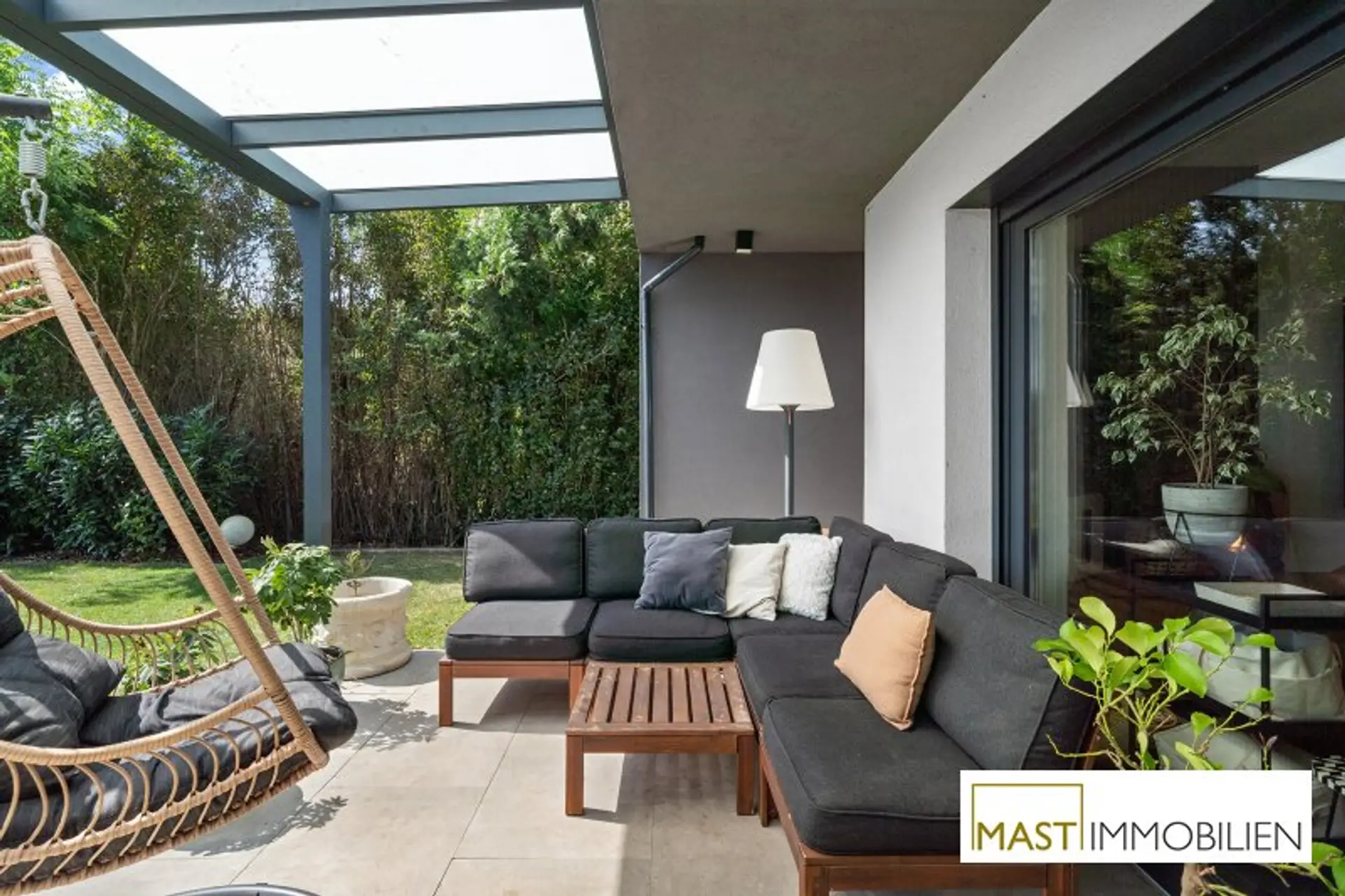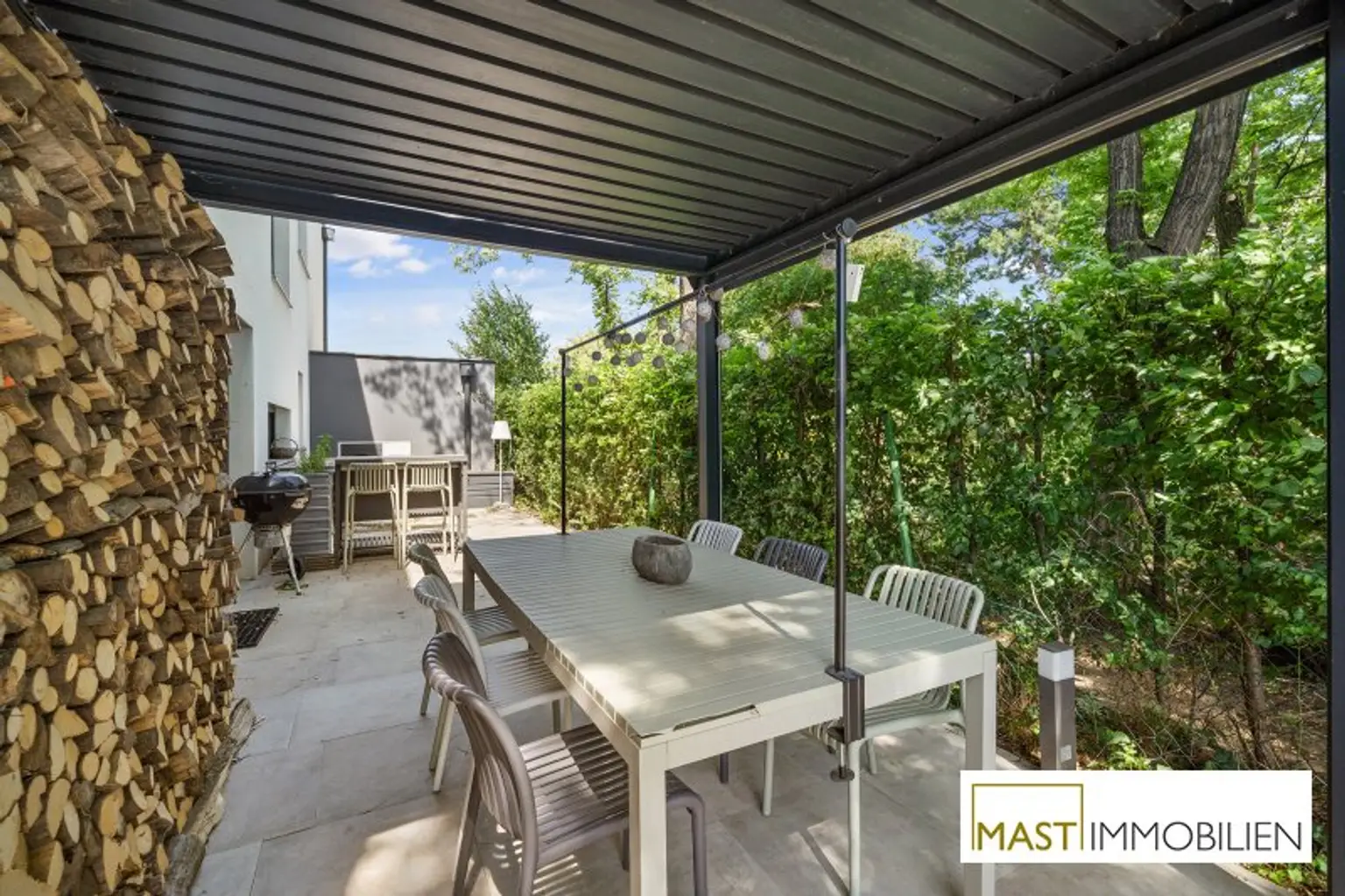 Große Fensterflächen, ein stilvoller Kamin sowie die offene Designer-Küche sorgen für ein helles und modernes Wohnambiente. Die Terrasse mit Pergola und der uneinsichtige Garten bieten ein Höchstmaß an Privatsphäre und laden zum Entspannen ein.