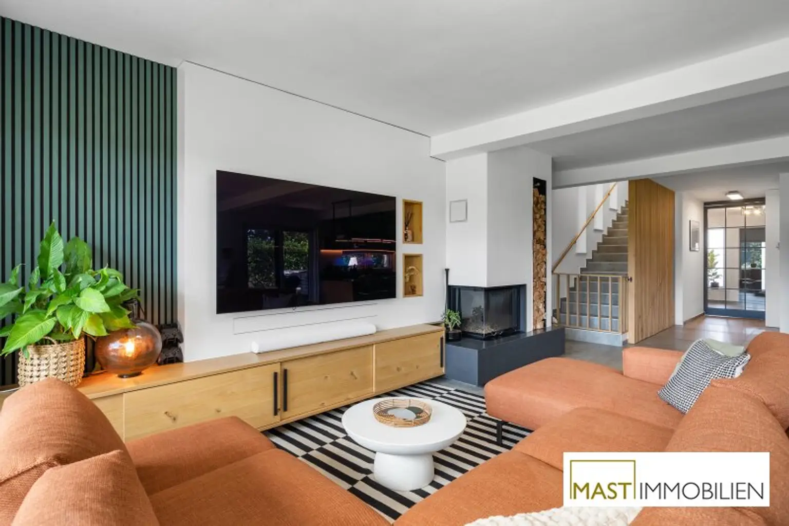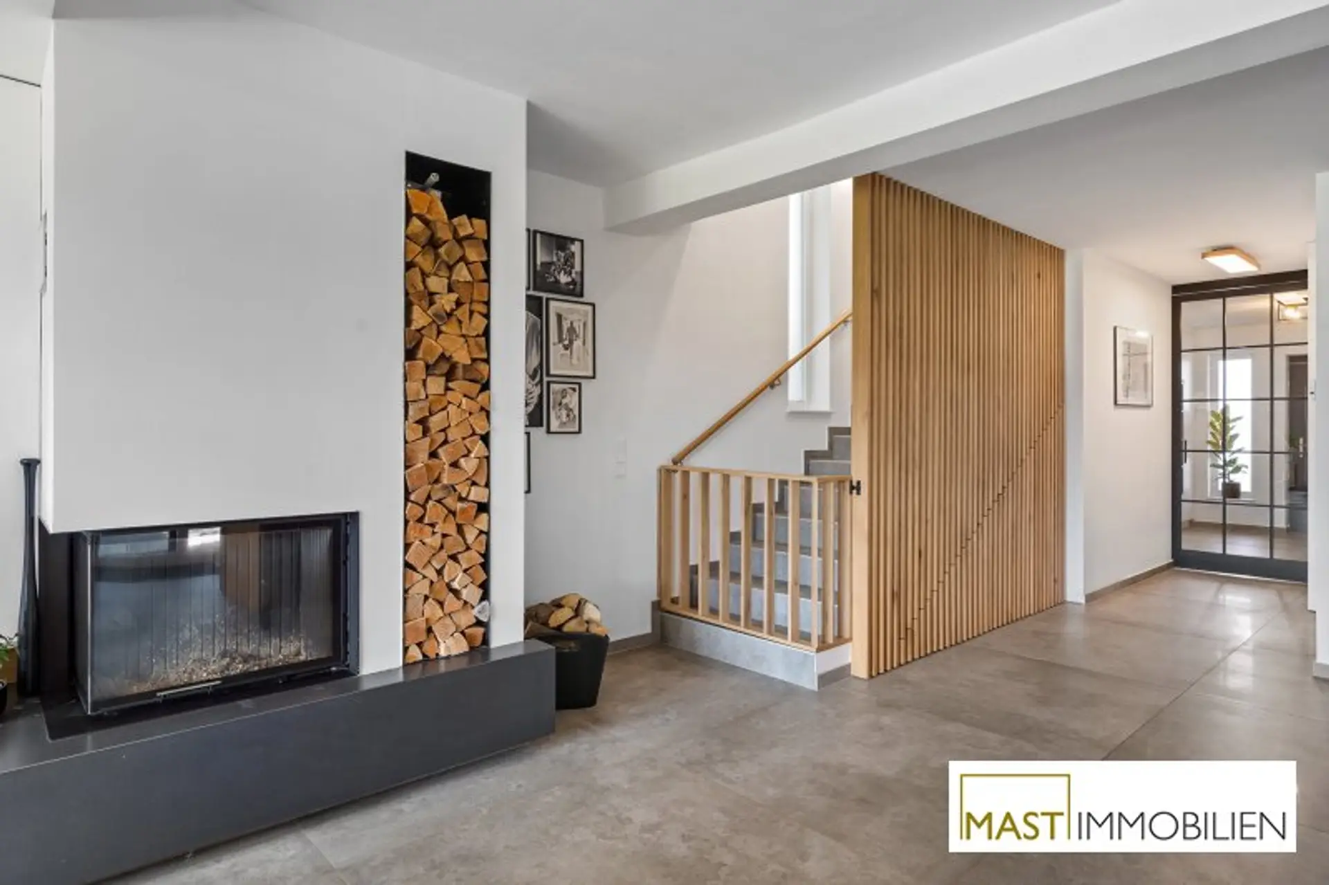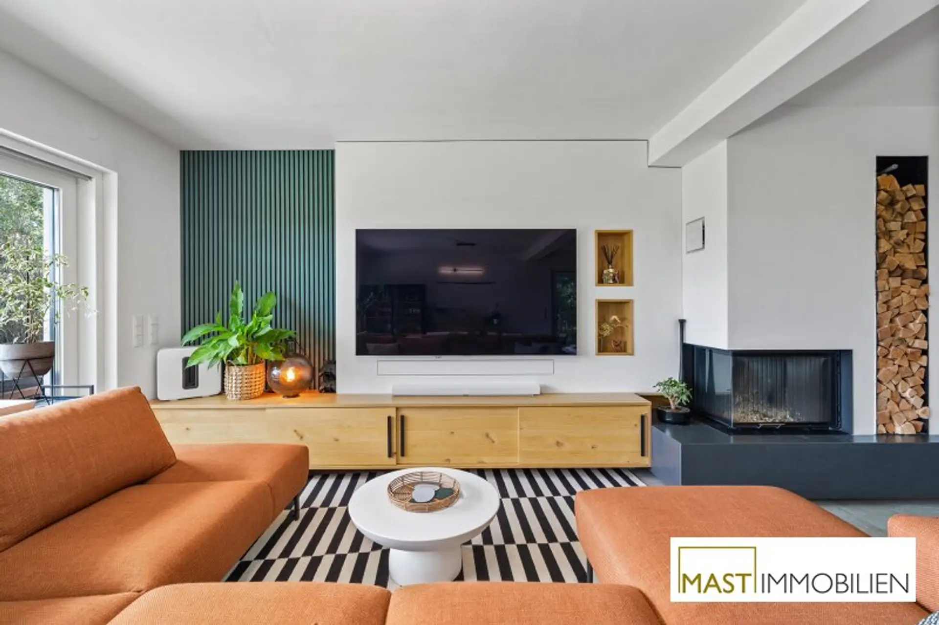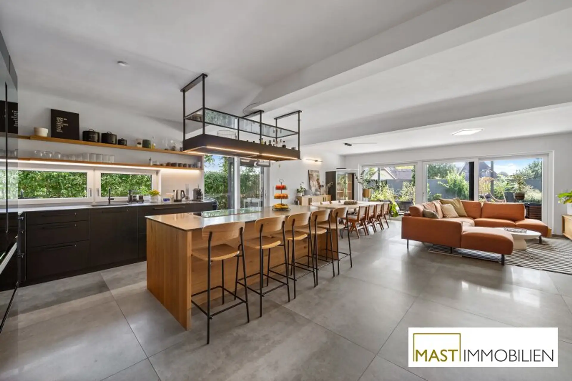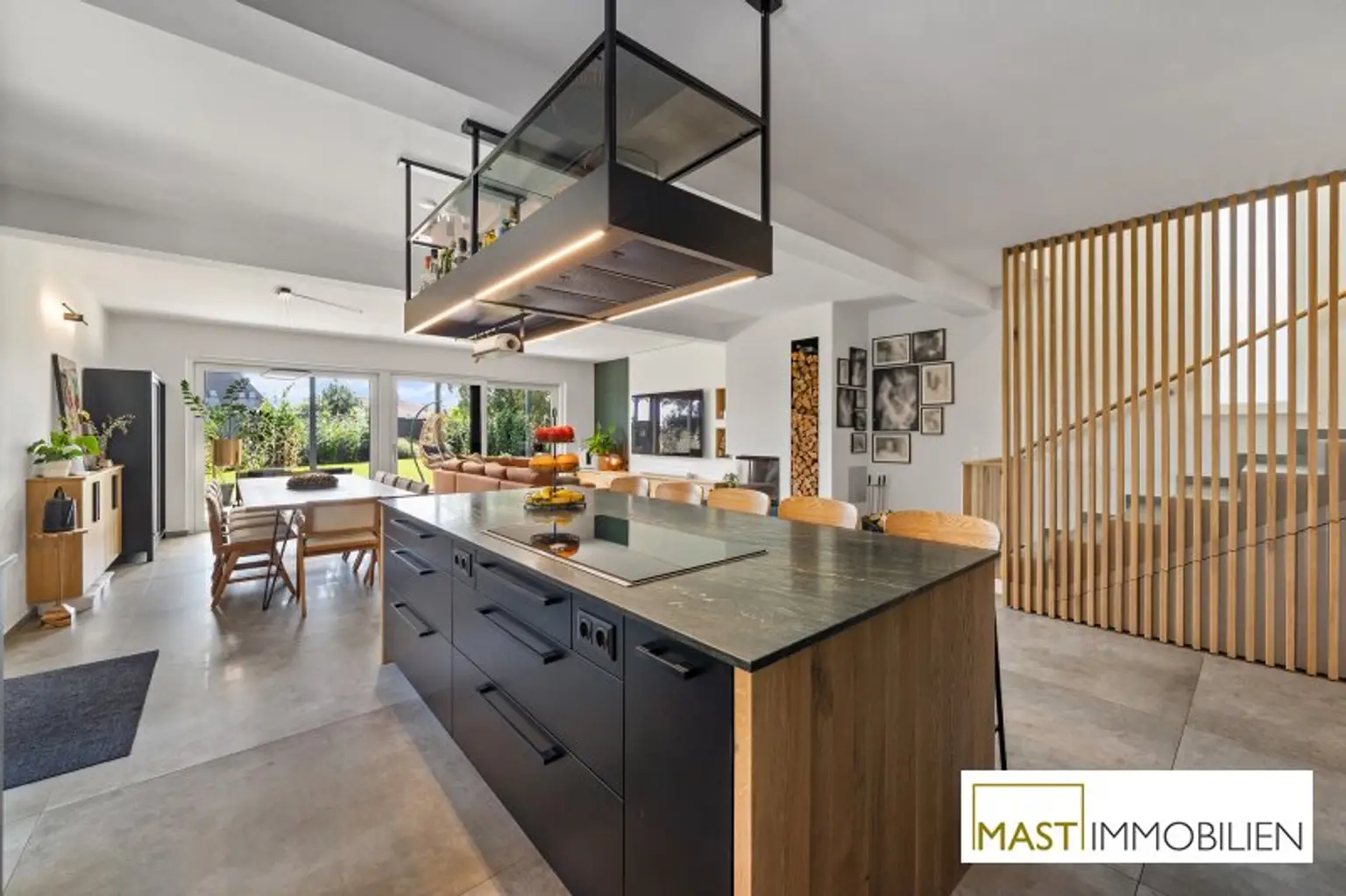 Große Fensterflächen, ein stilvoller Kamin sowie die offene Designer-Küche sorgen für ein helles und modernes Wohnambiente. Die Terrasse mit Pergola und der uneinsichtige Garten bieten ein Höchstmaß an Privatsphäre und laden zum Entspannen ein.