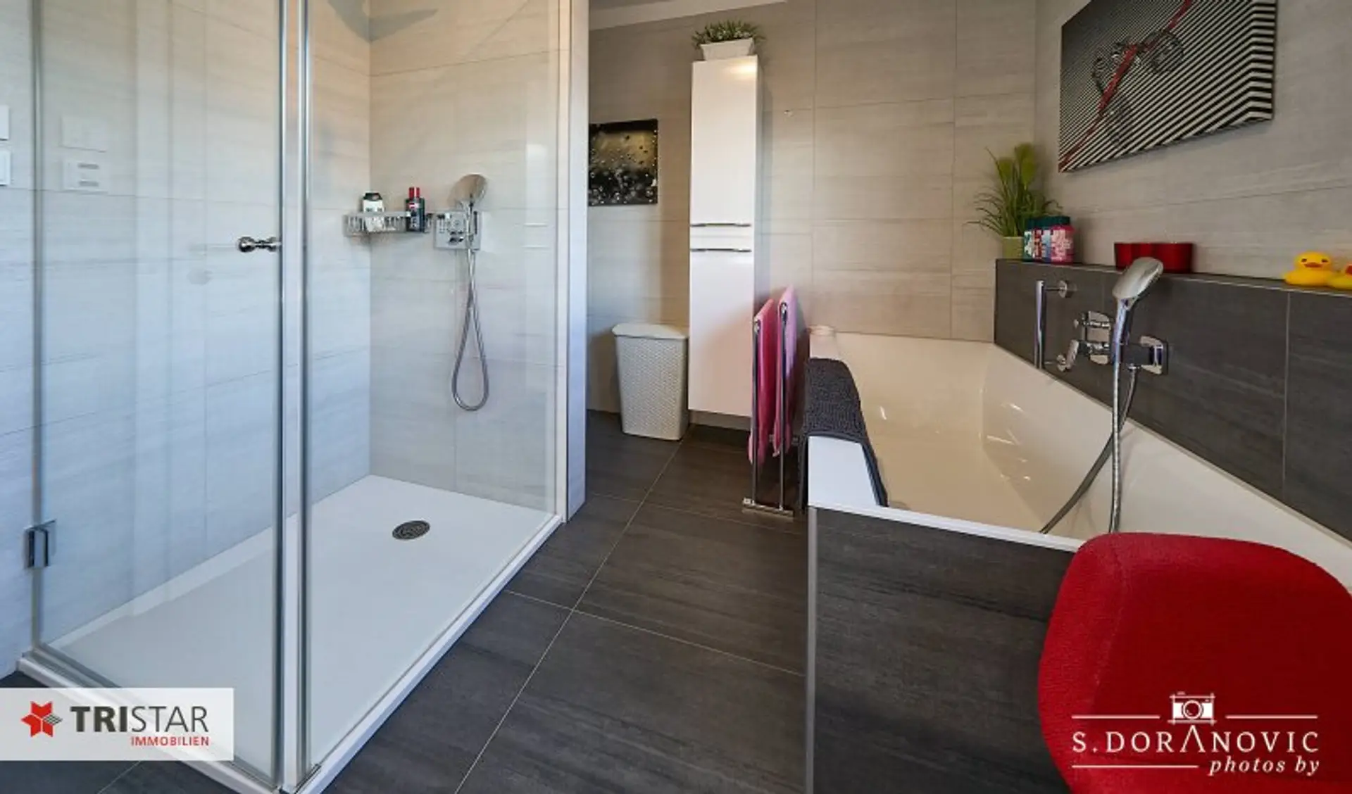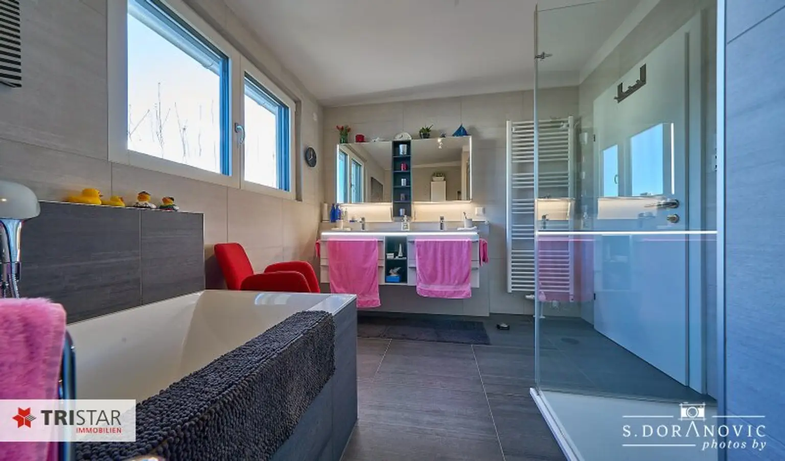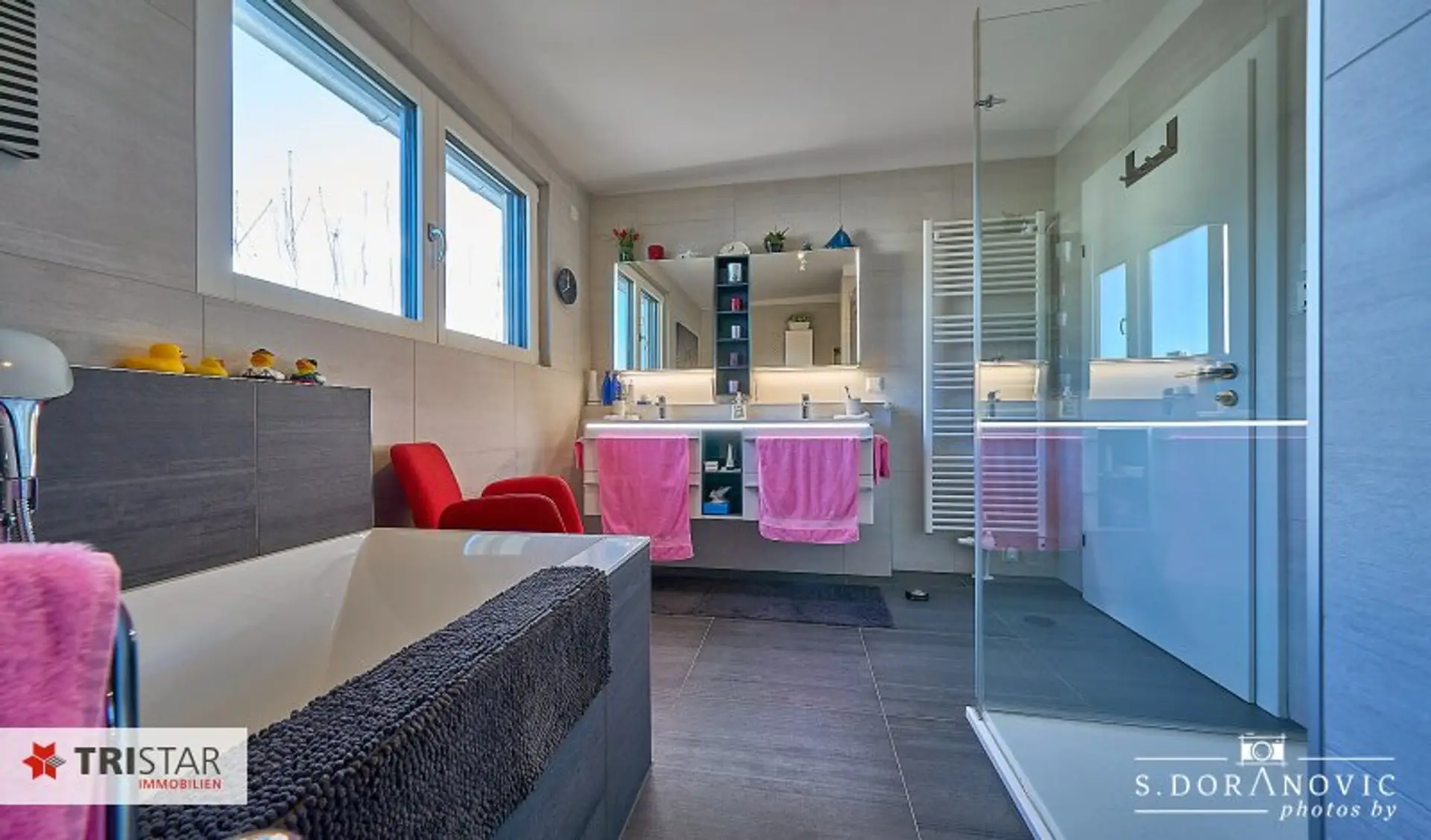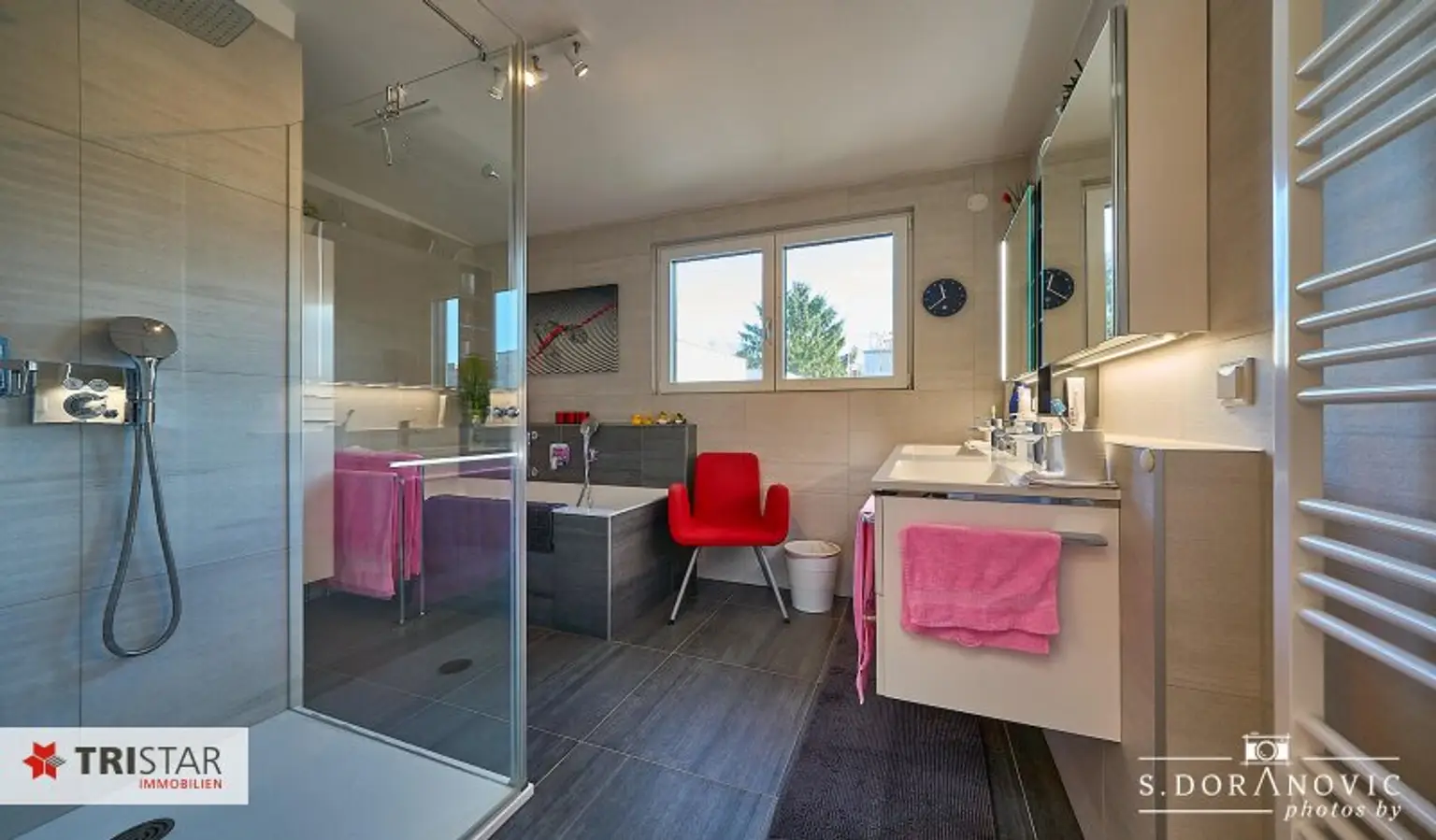 * Bad mit Fenster, Wanne, Dusche, WC, doppelter Waschbecken