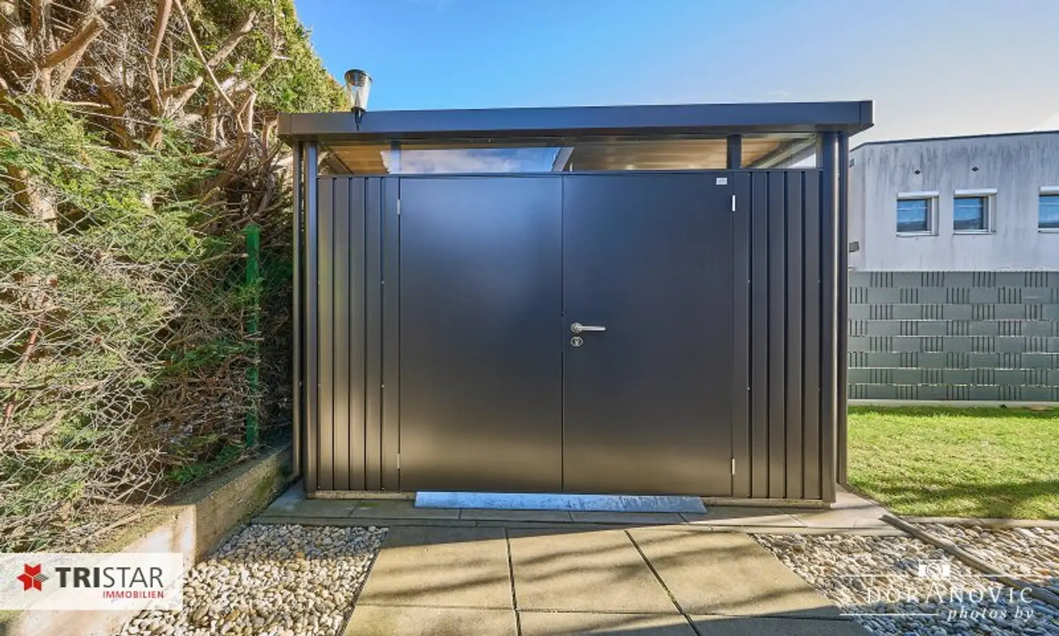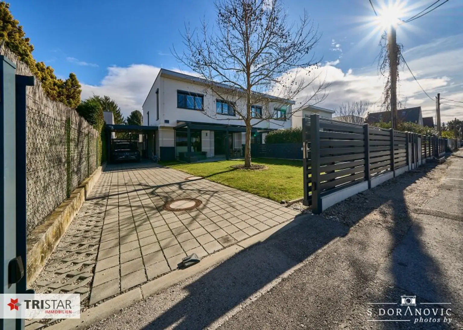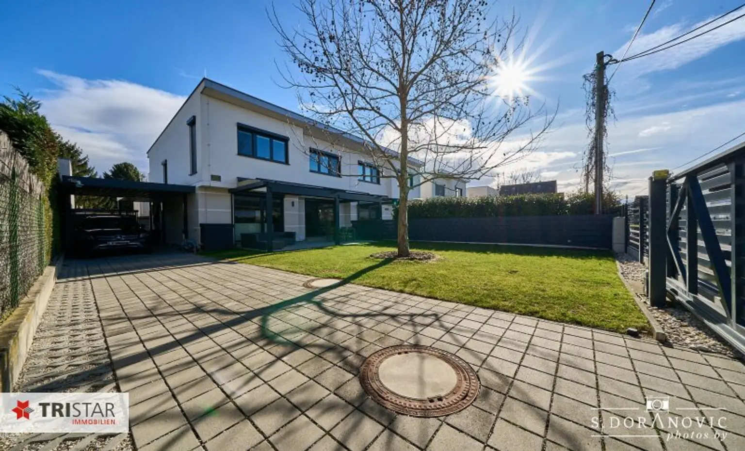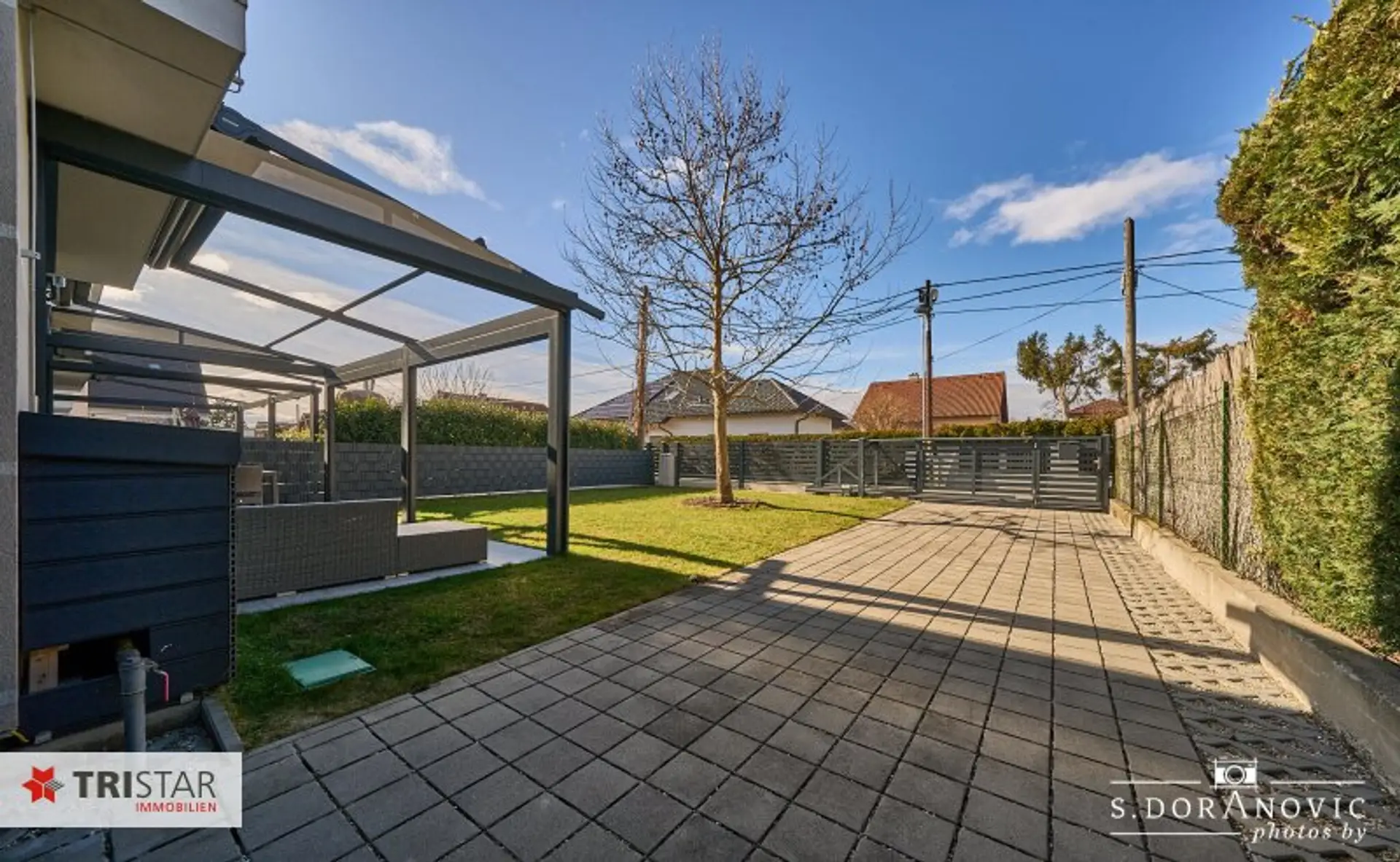 * Direkte Zufahrt von der ruhigen Straße zum Carport über ein elektrisch betriebenes Schiebetor mit komfortabler Fernsteuerung.