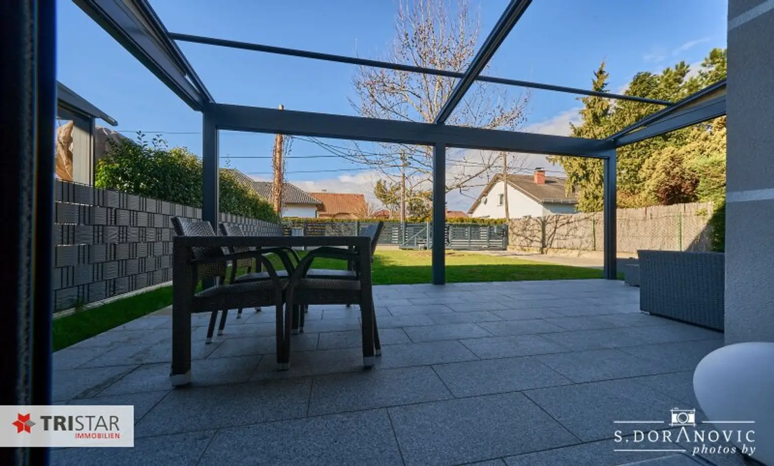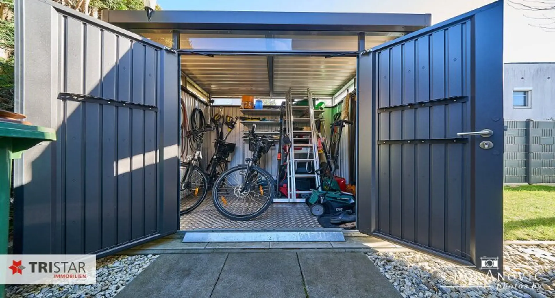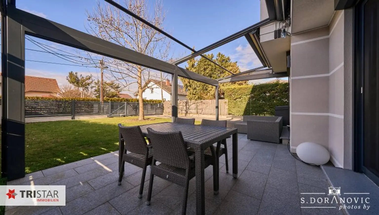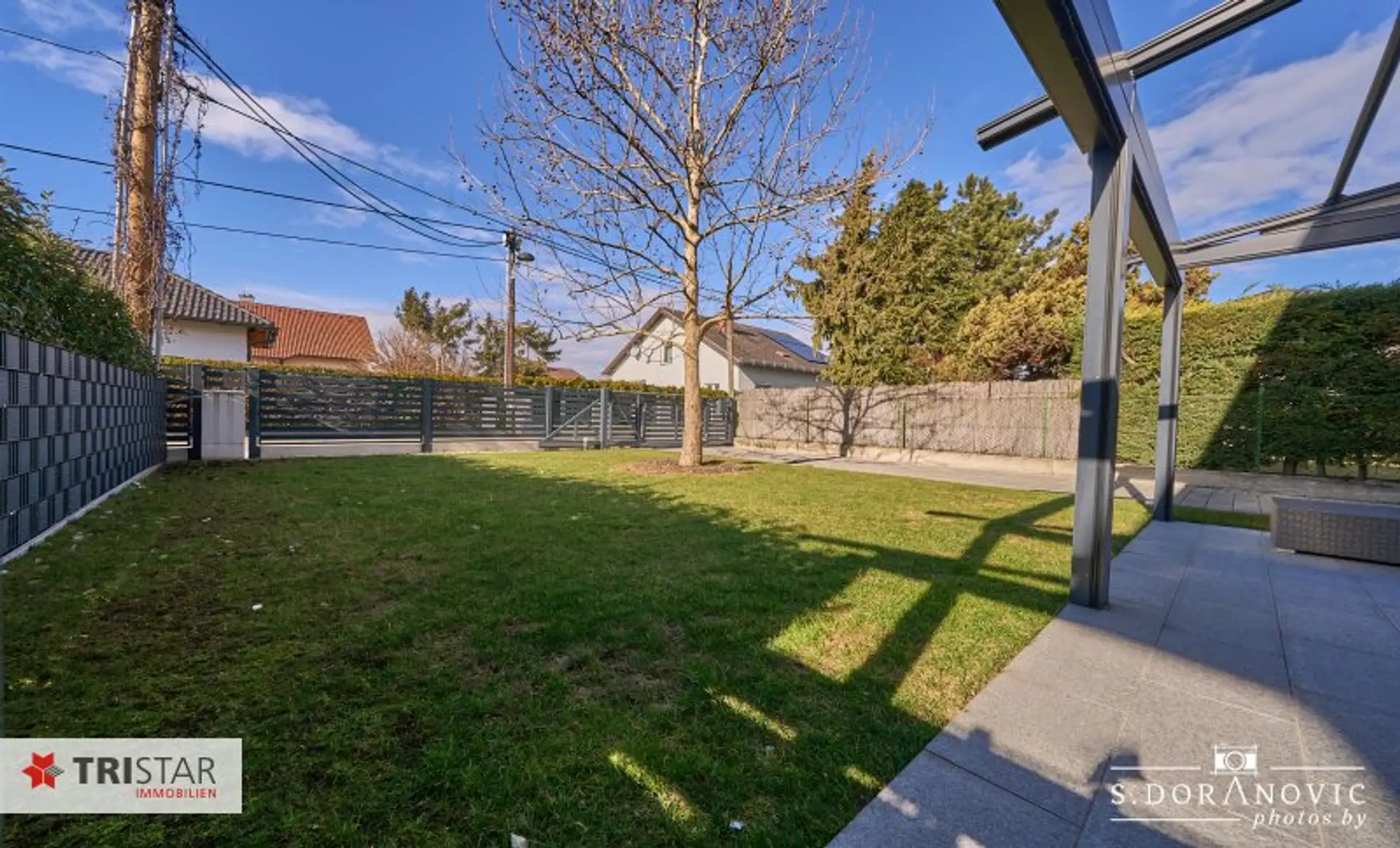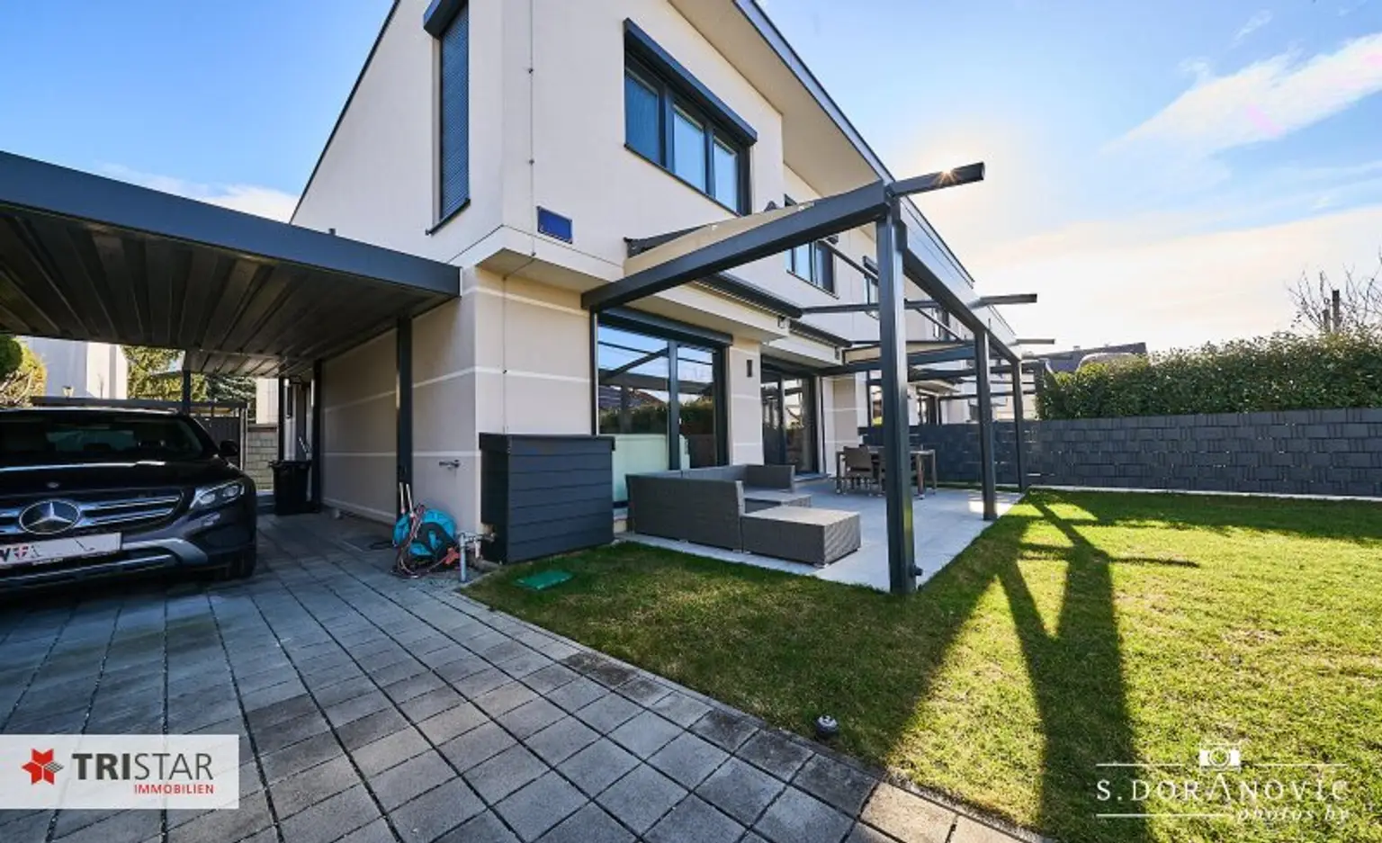 * Direkte Zufahrt von der ruhigen Straße zum Carport über ein elektrisch betriebenes Schiebetor mit komfortabler Fernsteuerung.