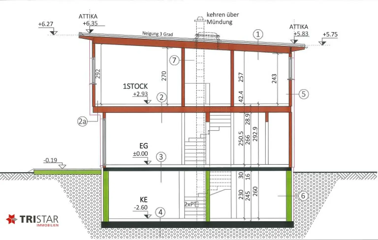 Das Haus hat ca. 186 m² Fläche (inkludiert ca. 57,62 m² Kellerbereich), wurde auf ca. 283 m² Grundfläche gebaut, und gliedert sich wie folgt: