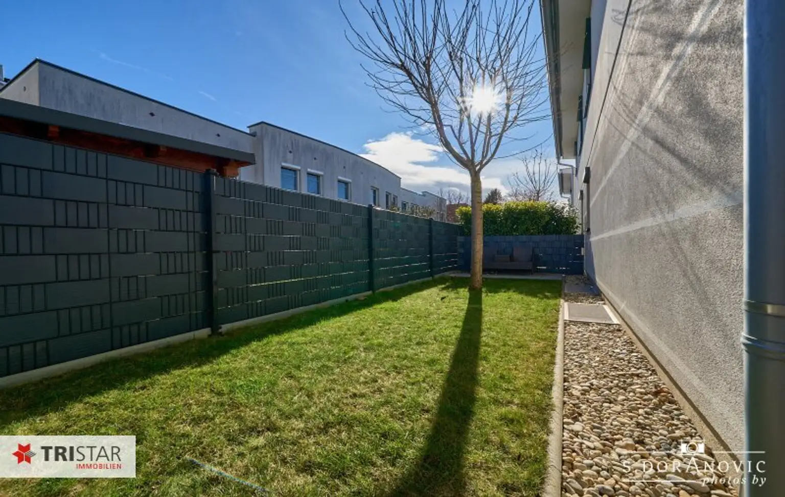 Der liebevoll gestaltete Garten mit Begrünung und eigenem Baum (siehe Fotos) schafft eine geschützte, ruhige Atmosphäre.