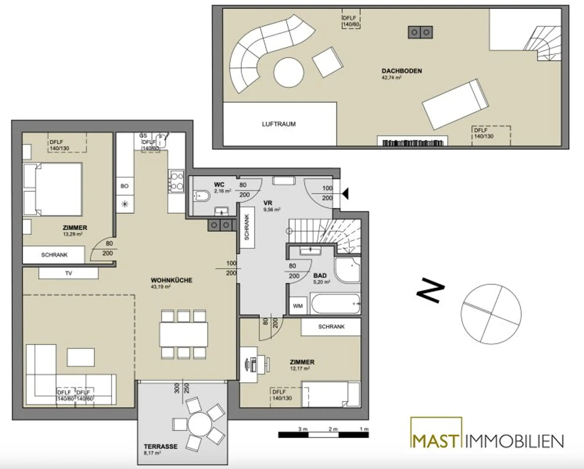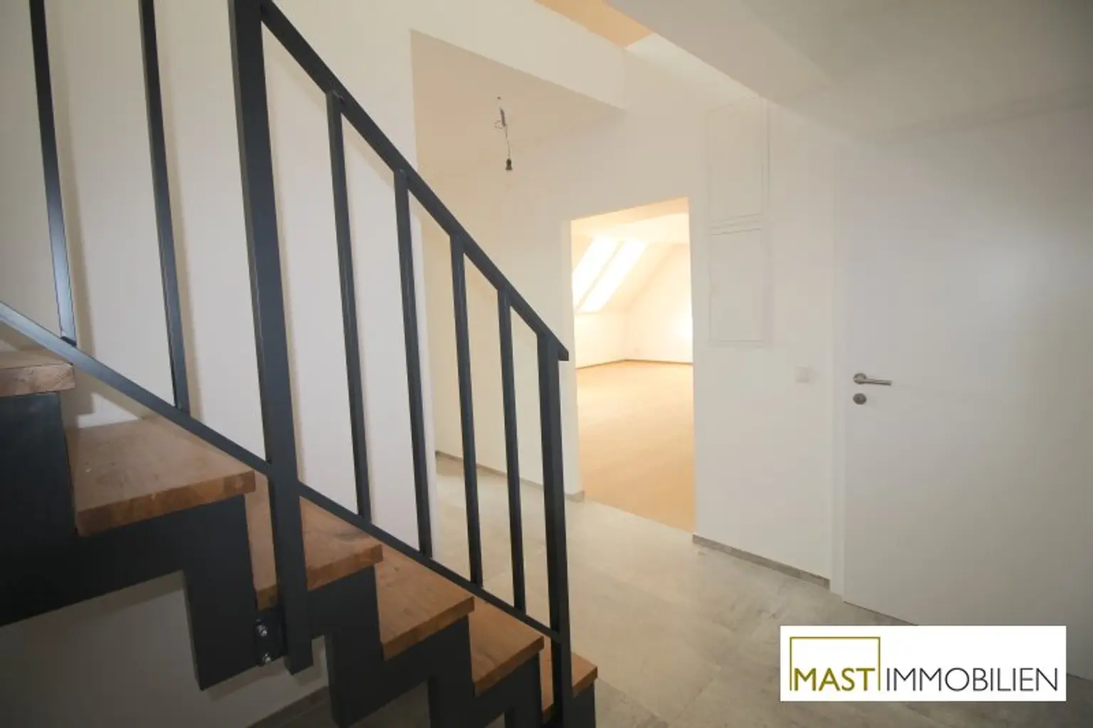 Die Wohnung befindet sich im 1. DG und verfügt über rund 86 m2 reine Wohnfläche zuzüglich rd. 43 m2 ausgebauter Dachbodenfläche. Insgesamt stehen somit rd. 129 m2 nutzbarer Fläche zur Verfügung.