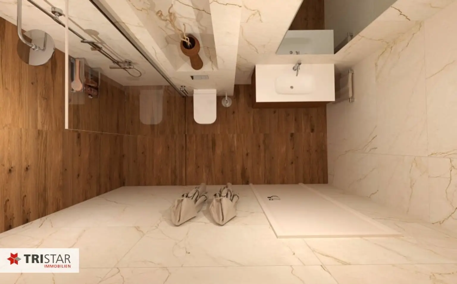 * Badezimmer – Wände mit KNAUF verkleidet; Boden- und Wandbeläge aus hochwertigem italienischem Feinsteinzeug; Ausstattung aus hochwertiger Keramik – Arbeitsplatte mit gegossenem Waschbecken, Unterschrank mit Schublade, abgetrennter Duschbereich mit Trennwand, montierte Armaturen und Duschmischer hoher Qualität, Spiegelschrank und Monoblock-WC