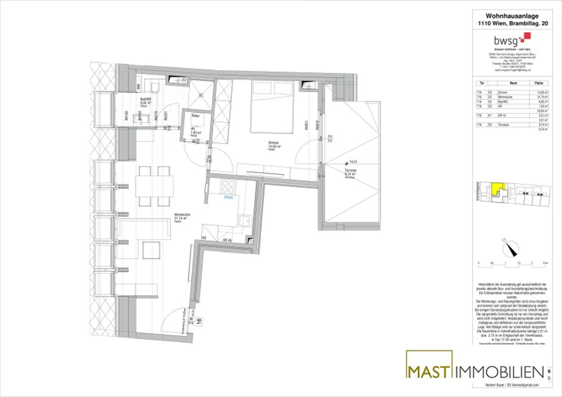 Die Wohnung befindet sich im 5. Liftstock (Dachgeschoss) und verfügt über 53,64 m² Wohnfläche + eine 9,74 m² große Terrasse.