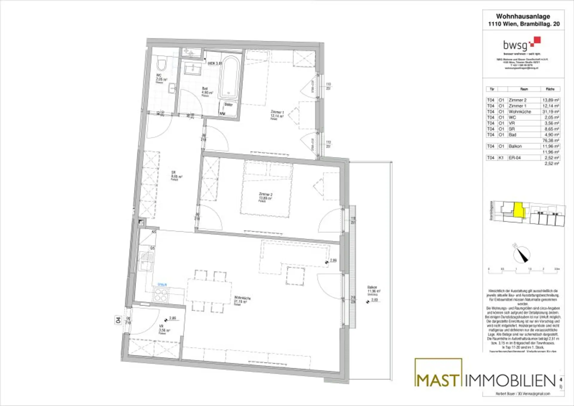 Die Wohnung befindet sich im 1. Liftstock und verfügt über 76,38 m² Wohnfläche + einen 11,96 m² großen Balkon.