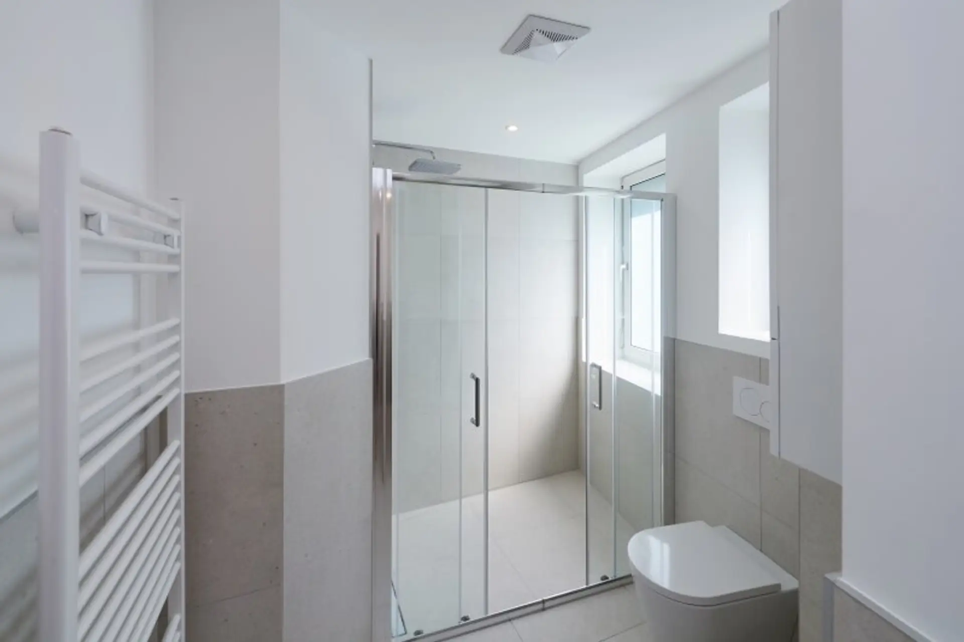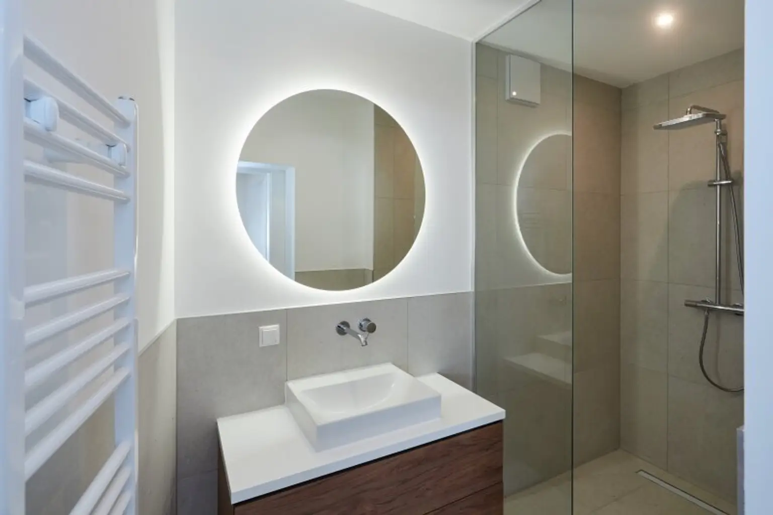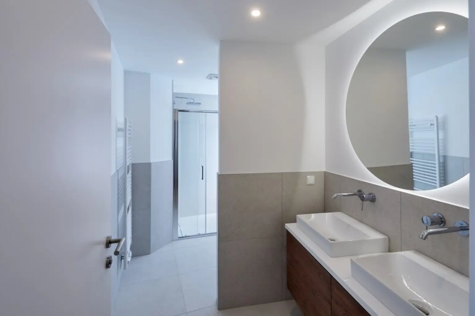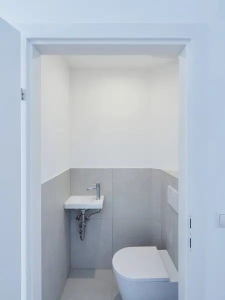 Das großzügige Badezimmer mit Doppelwaschbecken, Dusche und Toilette grenzt direkt an den großen Schlafraum an. Eine separate Toilette vom Gang aus begehbar bietet zusätzliche Privatsphäre. Doppel- bzw. Mehrfachverglasung sorgt für eine ruhige Atmosphäre.