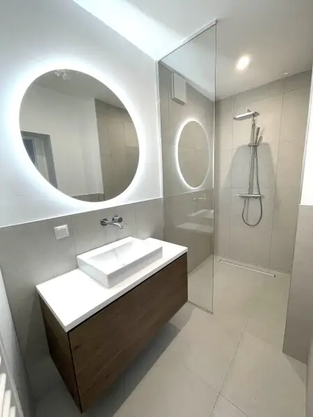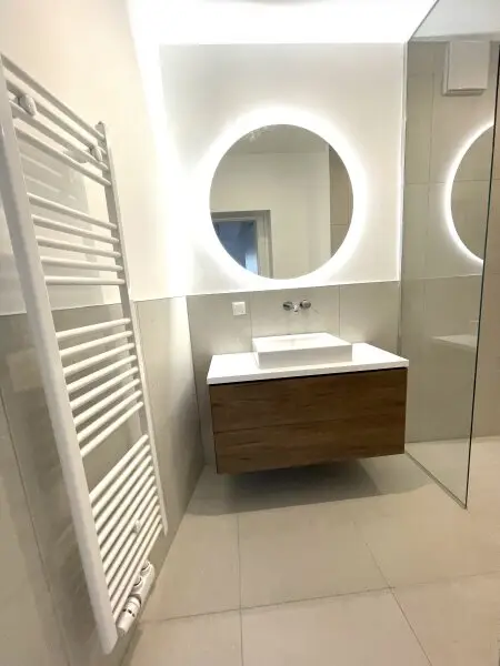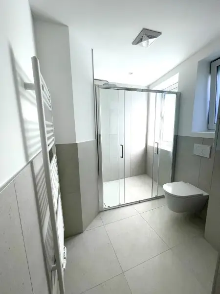 Das großzügige Badezimmer mit Doppelwaschbecken, Dusche und Toilette grenzt direkt an den großen Schlafraum an. Eine separate Toilette vom Gang aus begehbar bietet zusätzliche Privatsphäre. Doppel- bzw. Mehrfachverglasung sorgt für eine ruhige Atmosphäre.