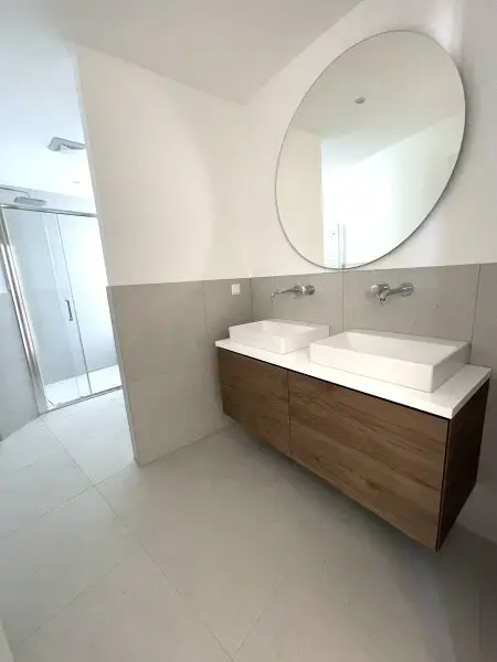 - 1 Badezimmer mit Doppelwaschbecken, Dusche, WC