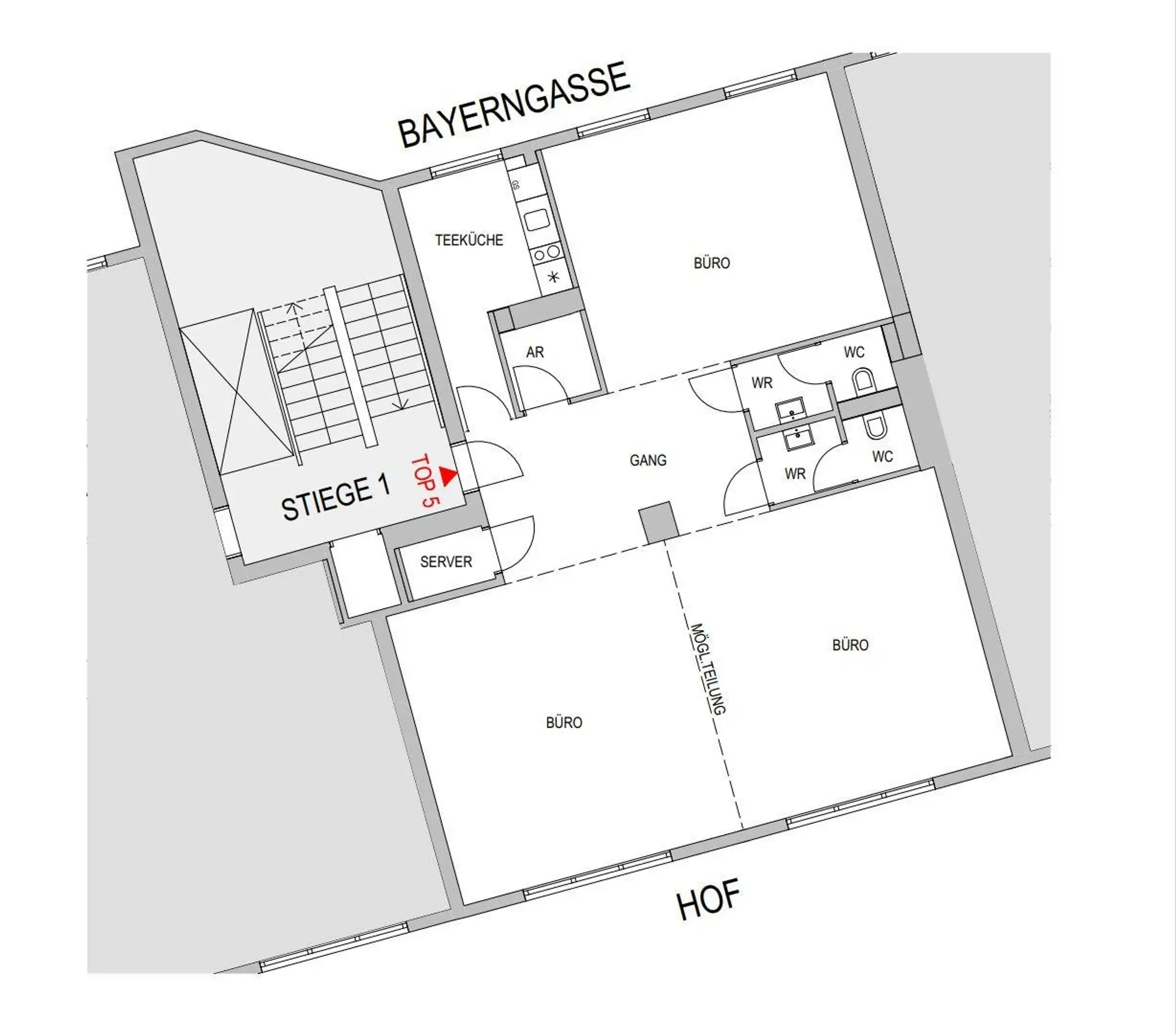 Das Büro befindet sich im 1. Obergeschoß. Ein Aufzug ist vorhanden, kann jedoch nicht barrierefrei erreicht werden.