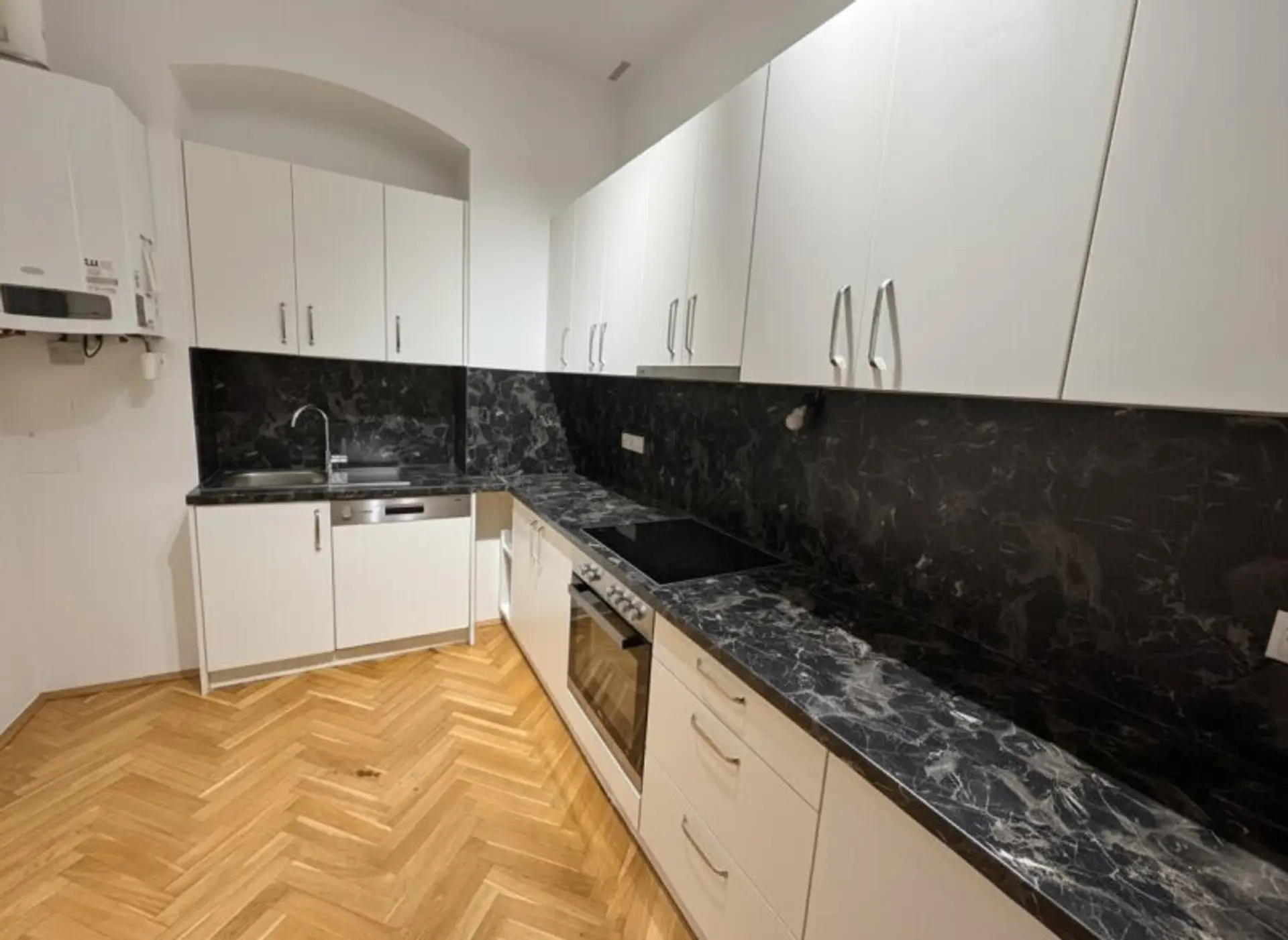 Der edle Fischgrätparkettboden verleiht der Wohnung einen besonderen Charakter und betont den typischen Wiener Altbaustil. Große Fensterflächen schaffen eine lichtdurchflutete, einladende Stimmung in allen Räumen.