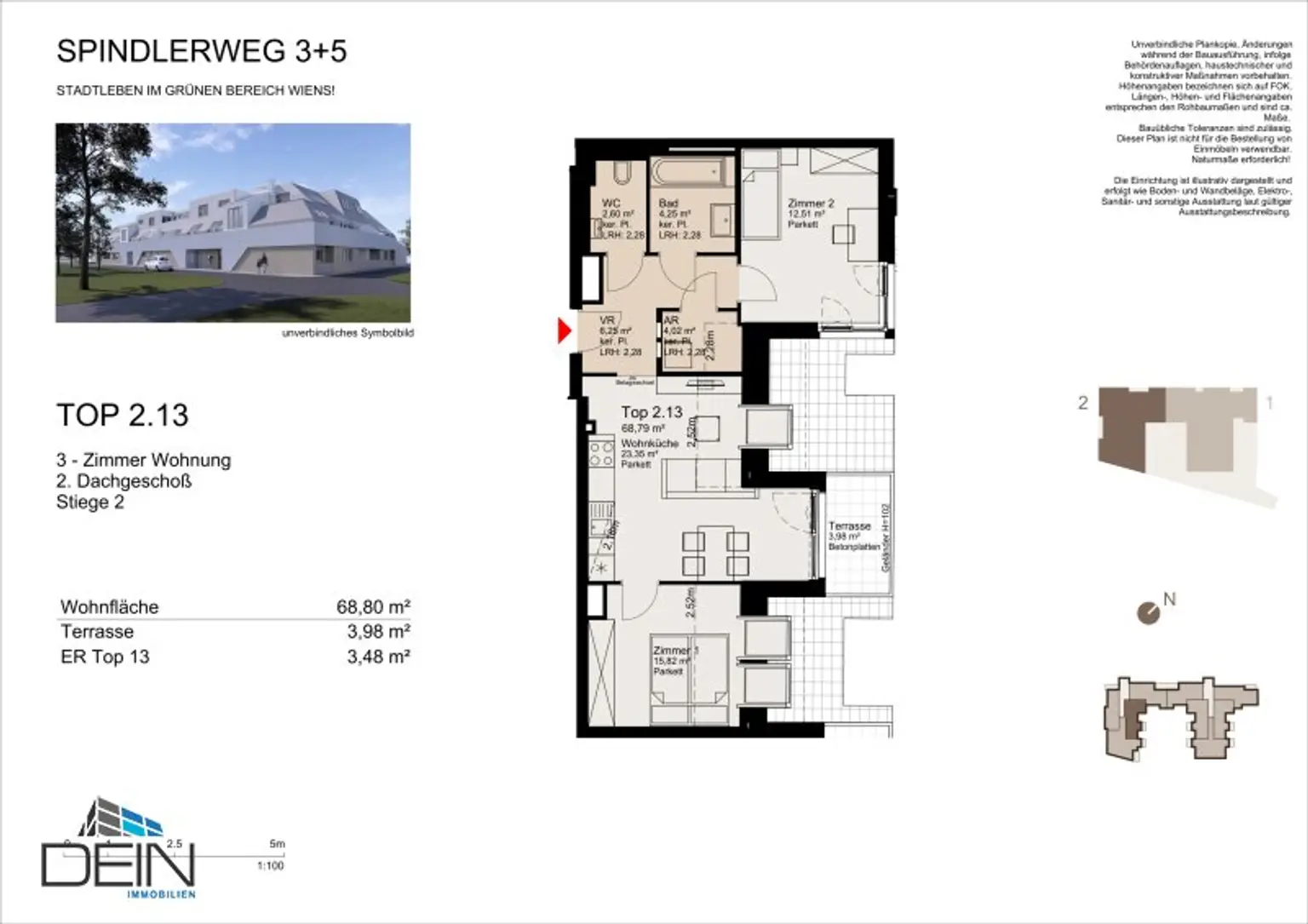 Zur Vermietung gelangt eine moderne ca. 68,58 m² große 3 Zimmerwohnung im Dachgeschoß zzgl. einem ca. 4,28 m² großen Terrasse eines im Jahre 2025 errichteten Neubaus am Spindlerweg 3-5 in der Nähe vom Badeteich Süßenbrunn.