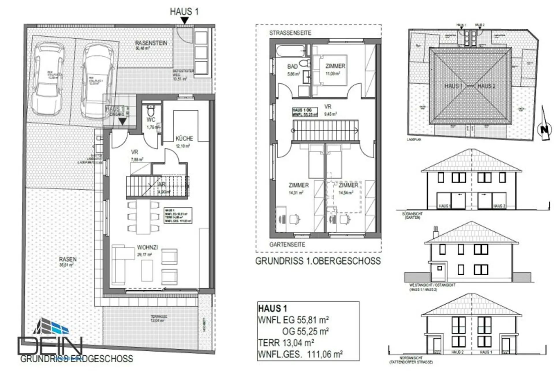 Haus 1: 4 Zimmer, ca. 111,06 m² WNFL, ca. 13,04 m² Terrasse, ca. 36,61 m² Garten, 2 PKW Stellplätze, BMM inkl. BK und USt: EURO 2.212,93 | VERFÜGBAR AB 01.02.2026
