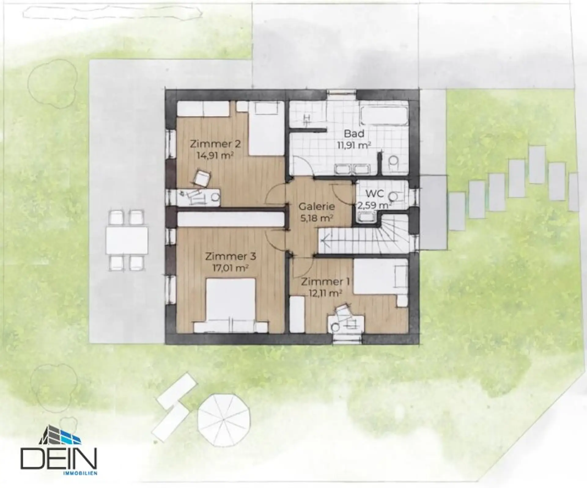 EG: Vorraum, separate Toilette, Technikraum, Wohnküche, Schleuse zur Garage, Terrasse/Eigengarten.