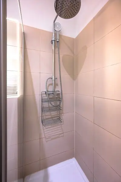* hochwertig mit Feinsteinzeug ausgestattetes Bad