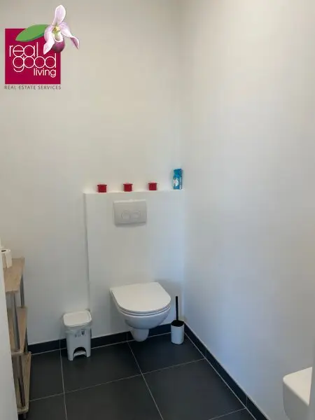 Die hochwertigen Materialien, darunter stilvolle Fliesen und edles Parkett, schaffen eine warme und einladende Atmosphäre. Die großen Fenster sorgen nicht nur für eine hervorragende Belüftung, sondern auch für viel Tageslicht, das die Räume erhellt und eine angenehme Wohnatmosphäre schafft.