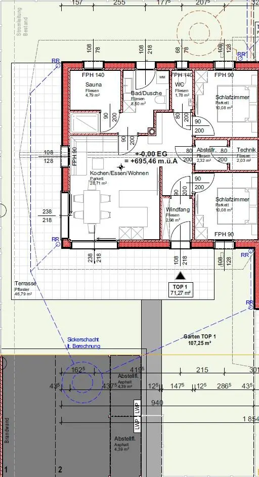 Der südliche unbebaute Grundstücksteil hat keine Baulandwidmung, was aber durch die gegebene Planung keine Rolle spielt.